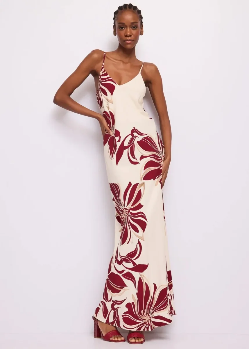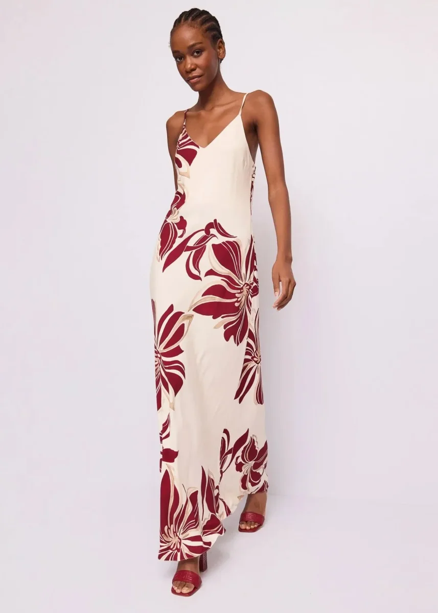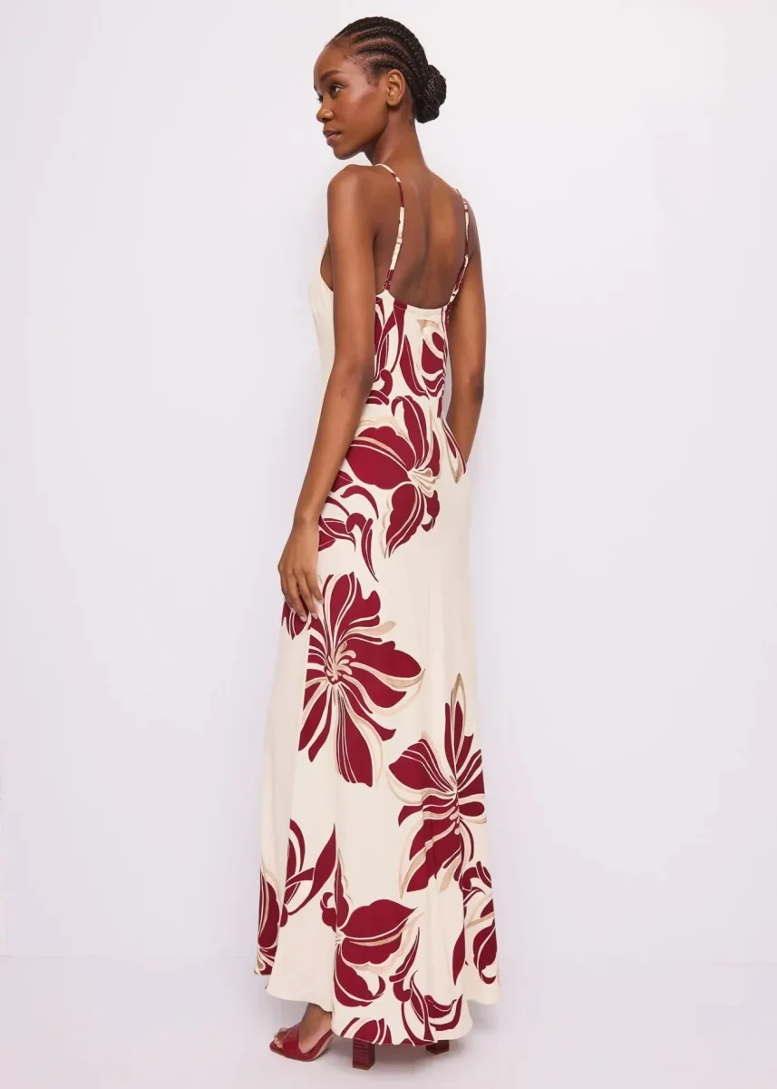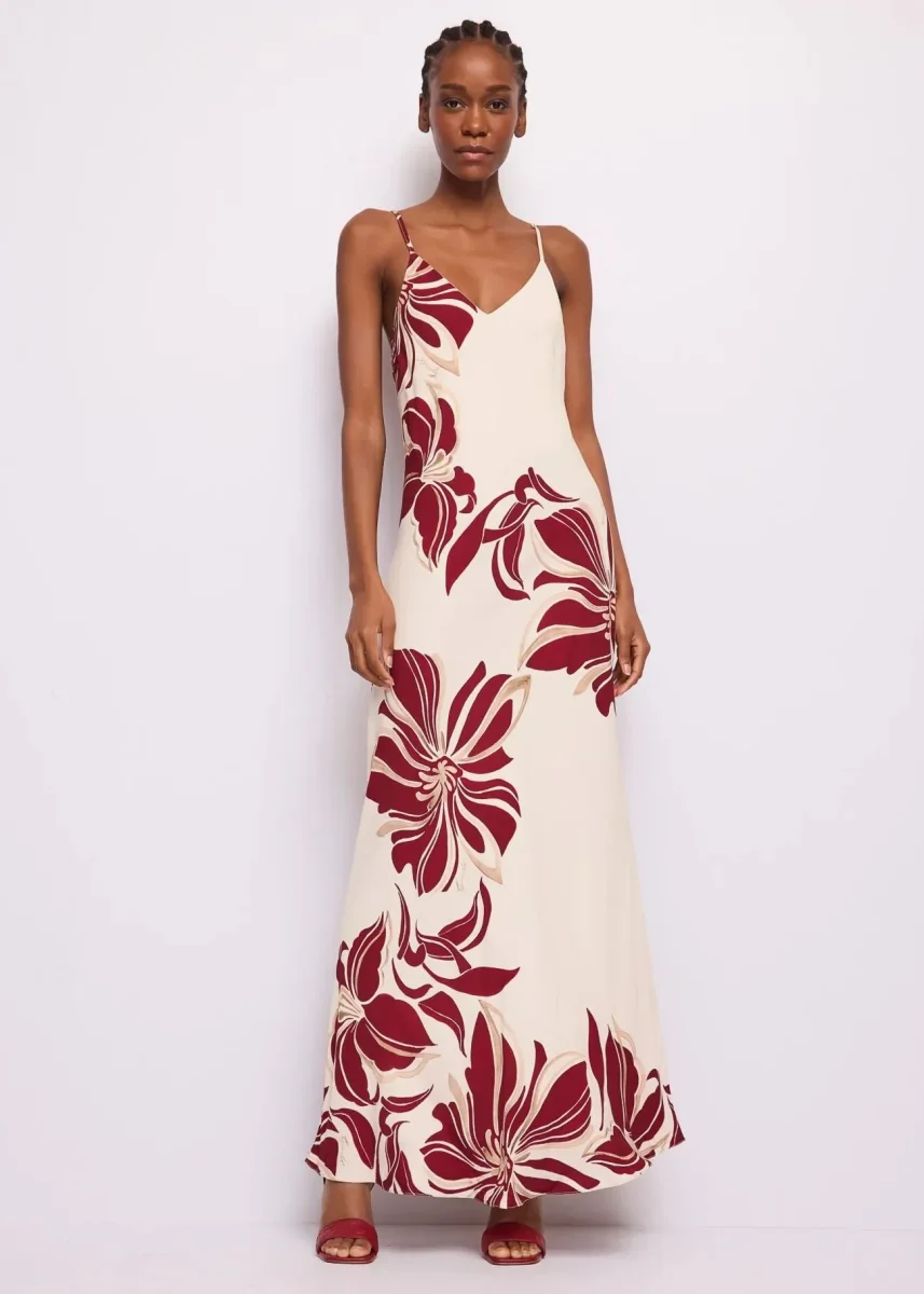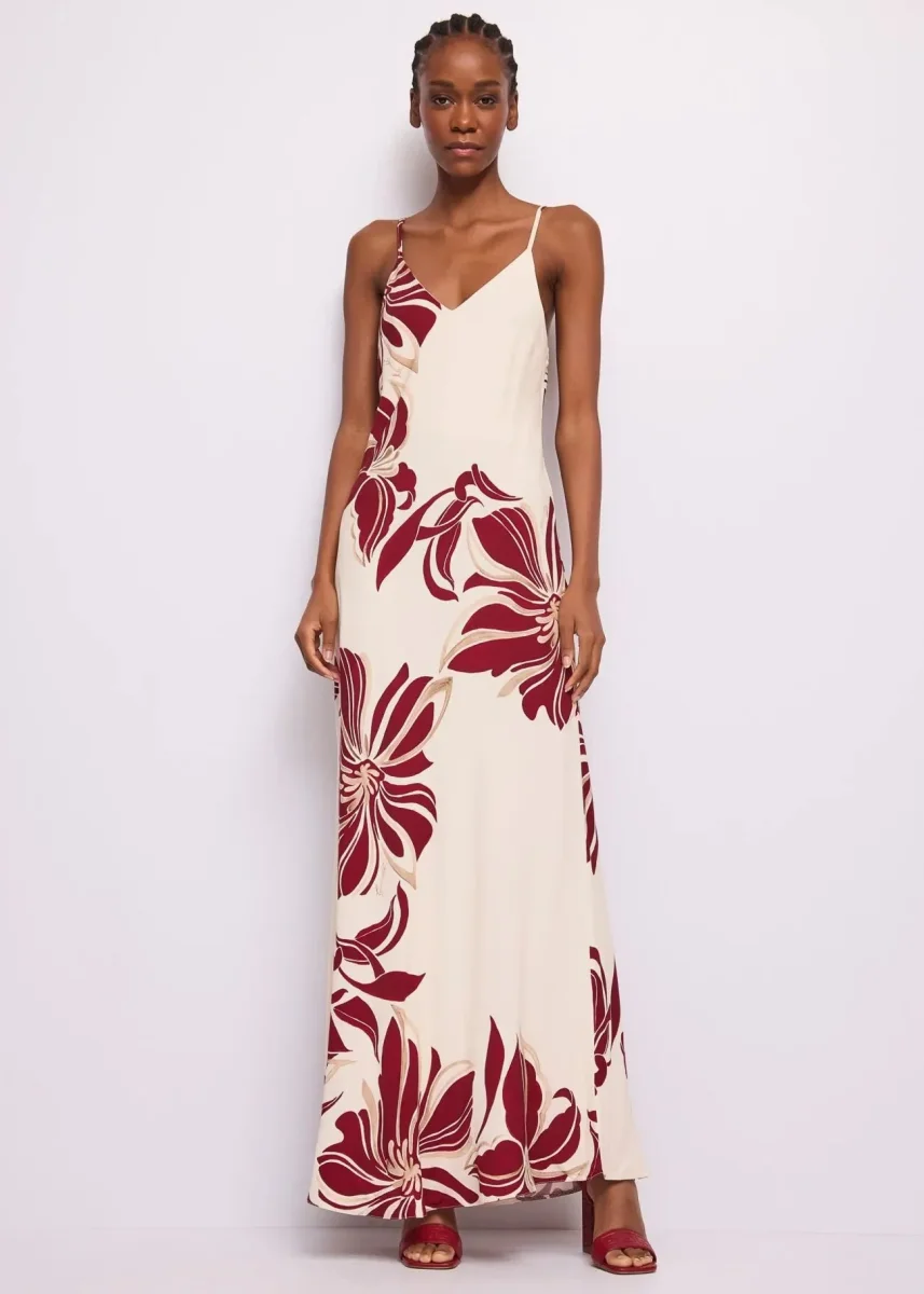 Scegli l’abito lungo in twill di viscosa con stampa floreale, scollo a V e spalline regolabili. Freschezza e leggerezza per un look raffinato.