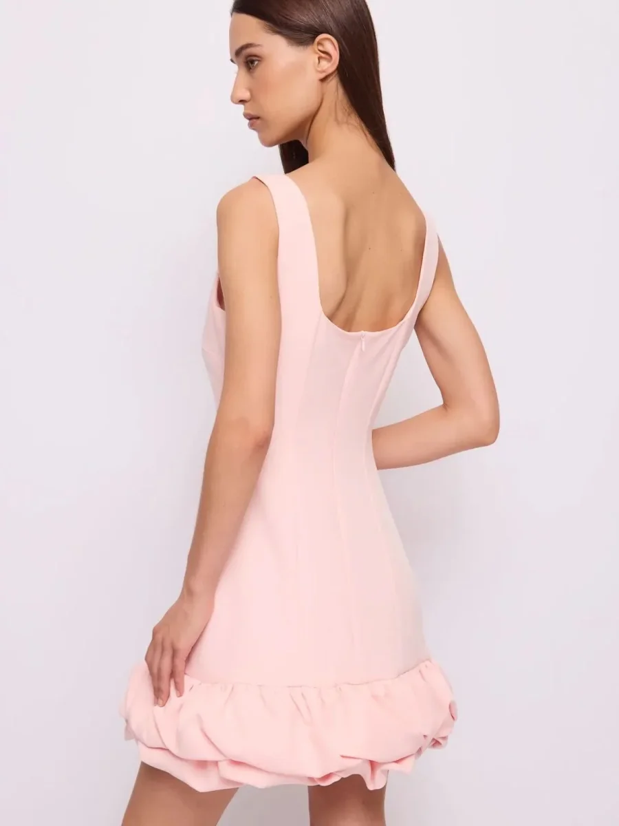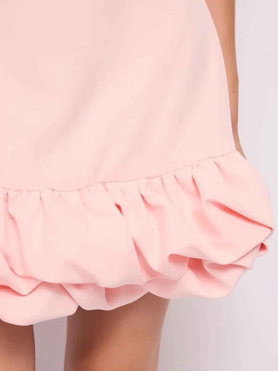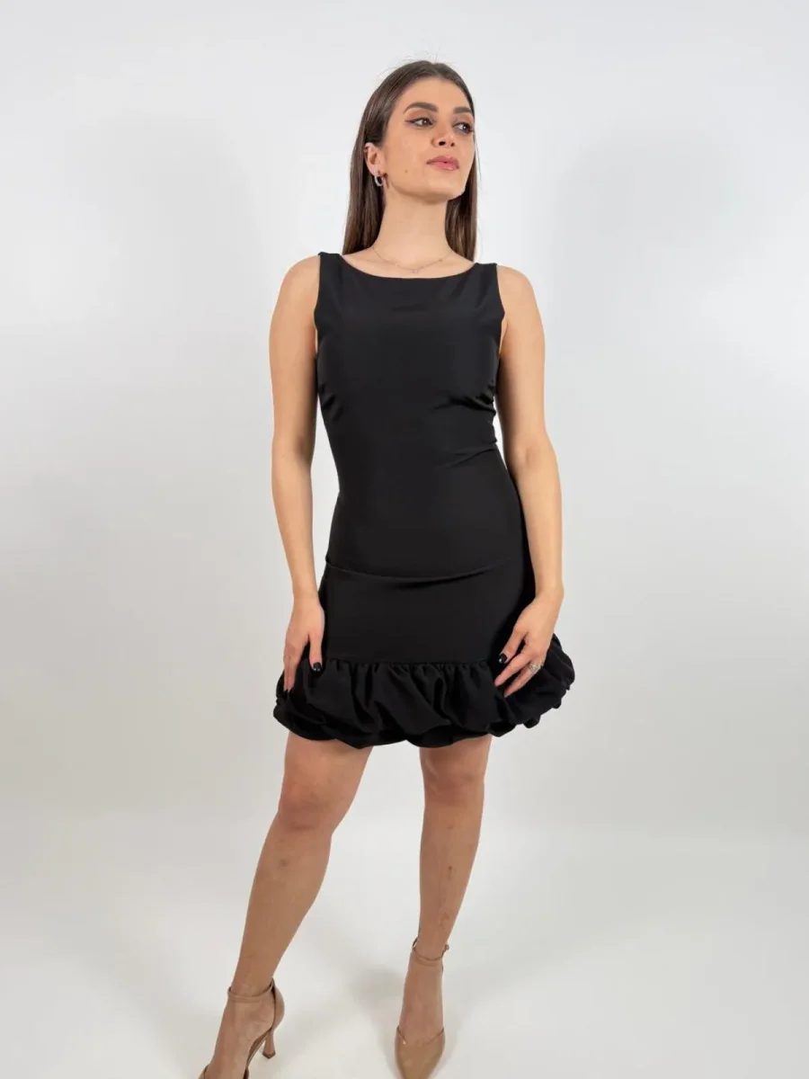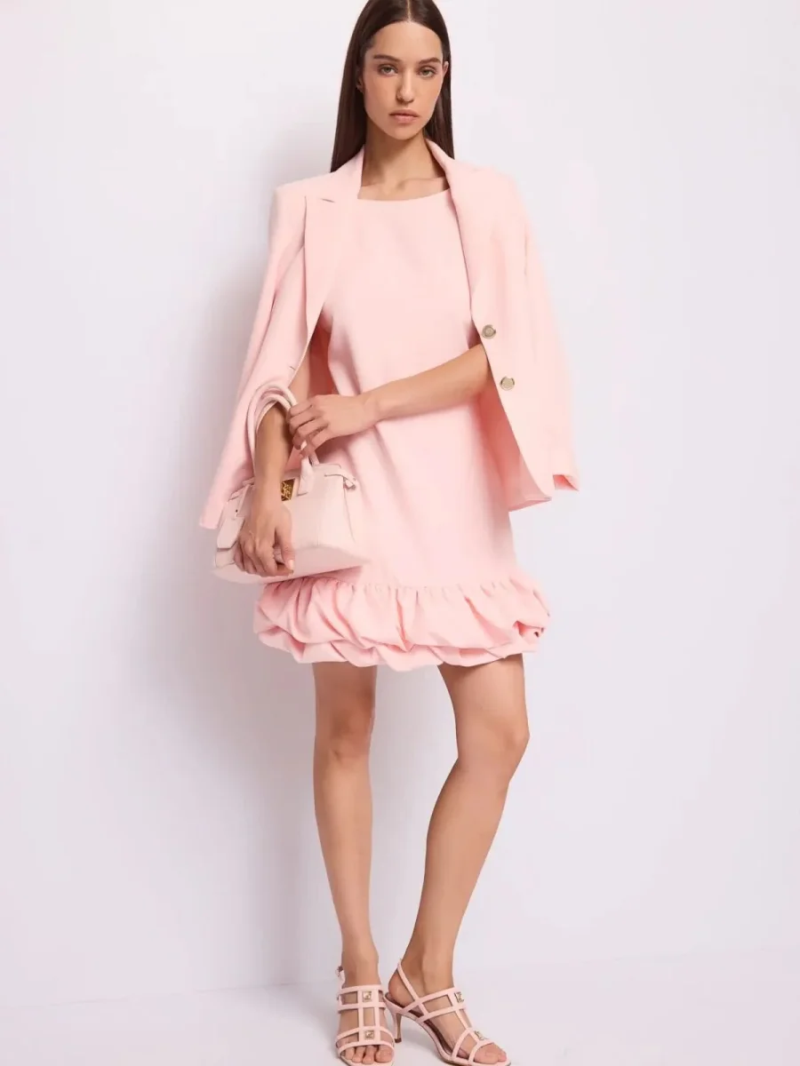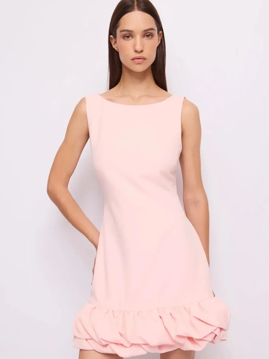 Scegli l’abito corto in tessuto tecnico elasticizzato con scollo a barca e balza arricciata. Fresco e leggero per un’eleganza romantica e moderna.