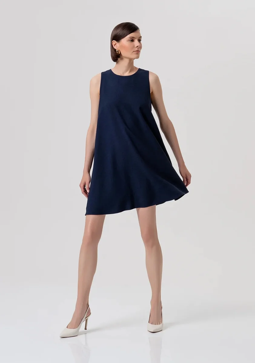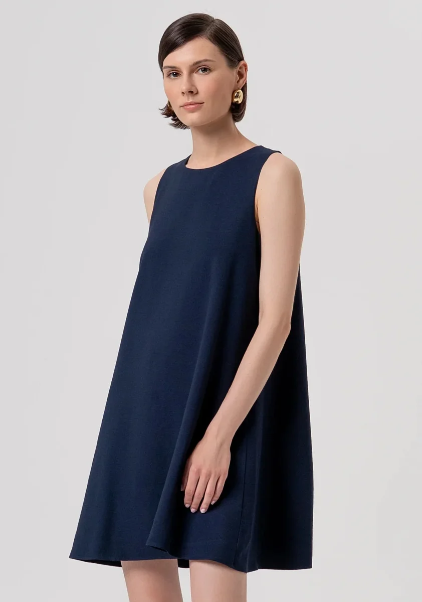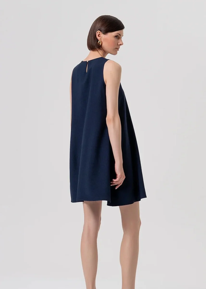 Abito linea ad A mini, girocollo, apertura a goccia sul dietro, e senza maniche.