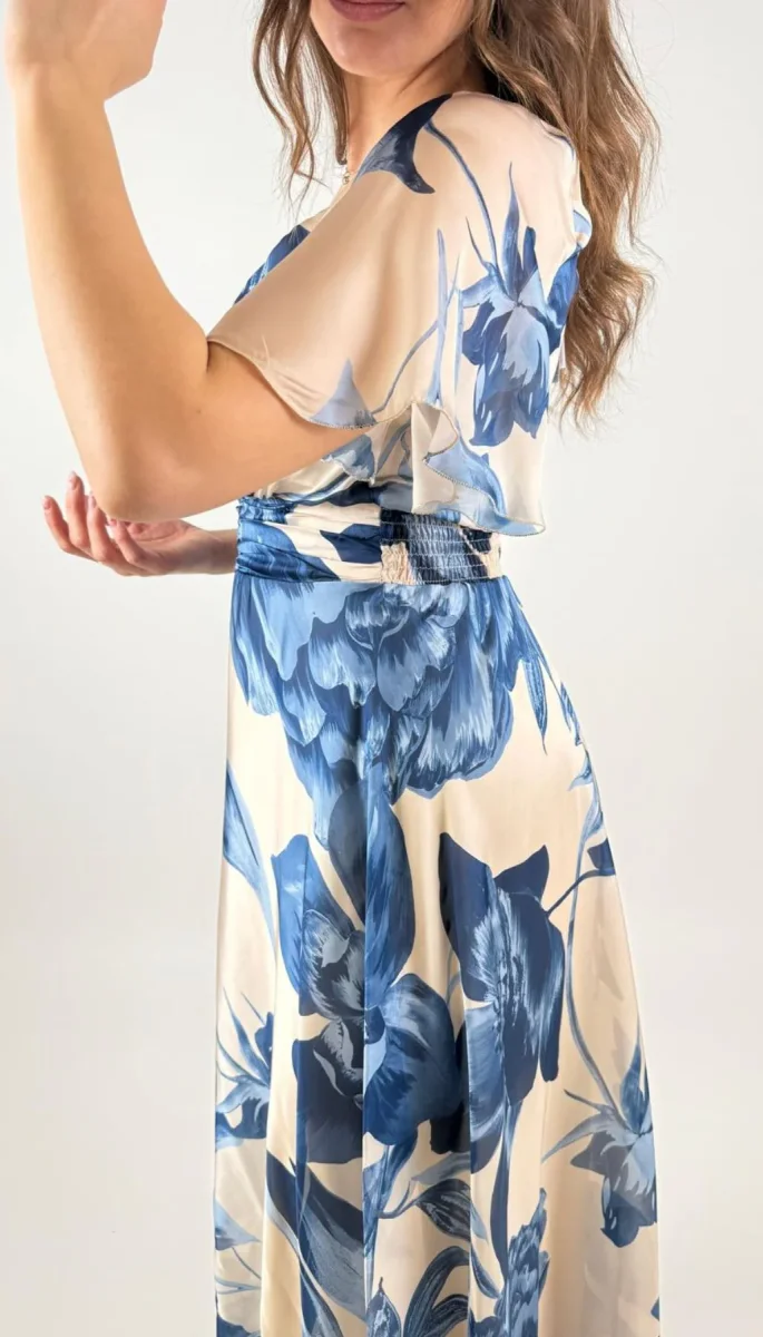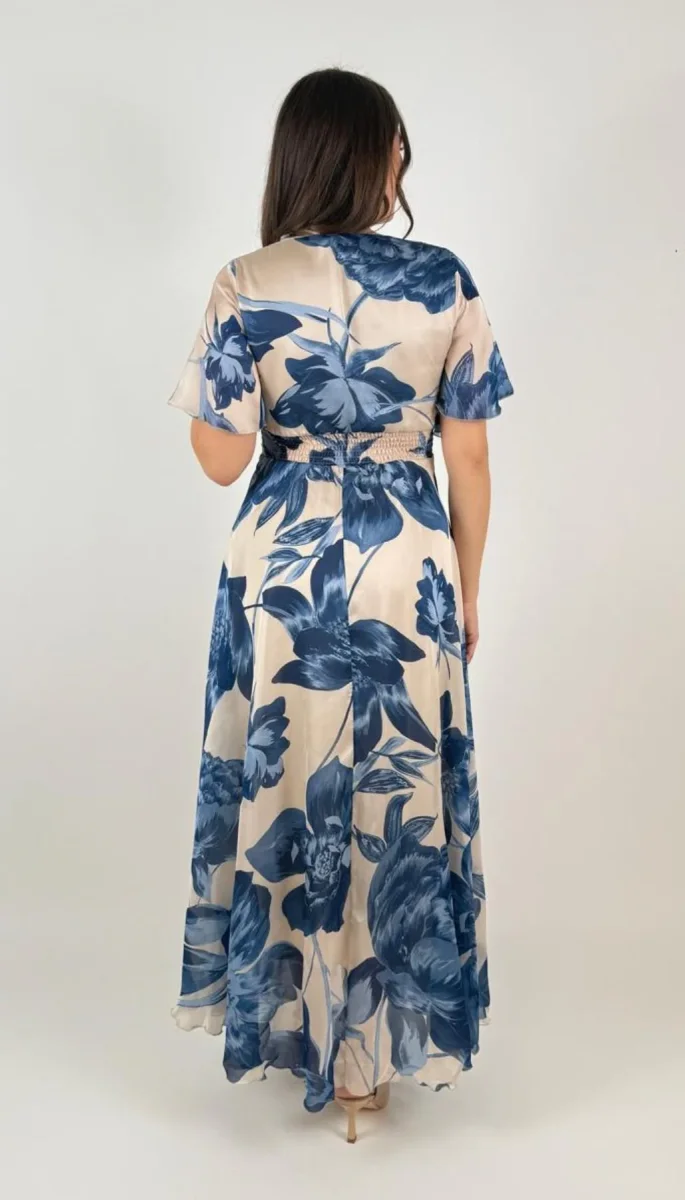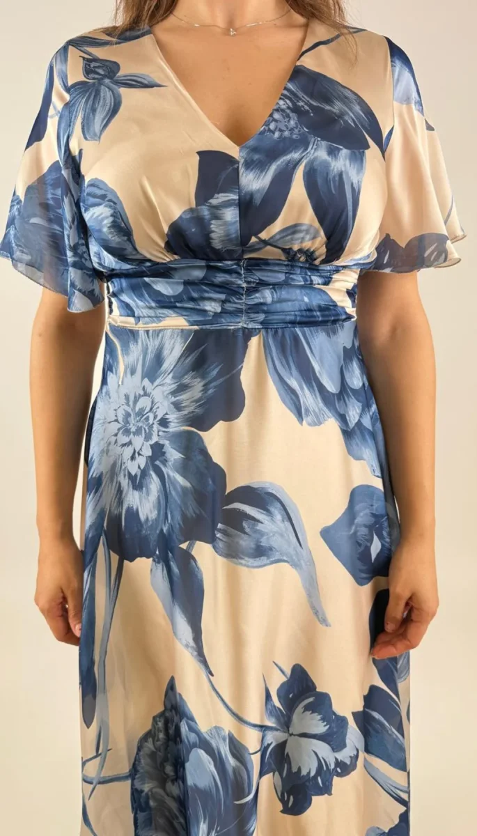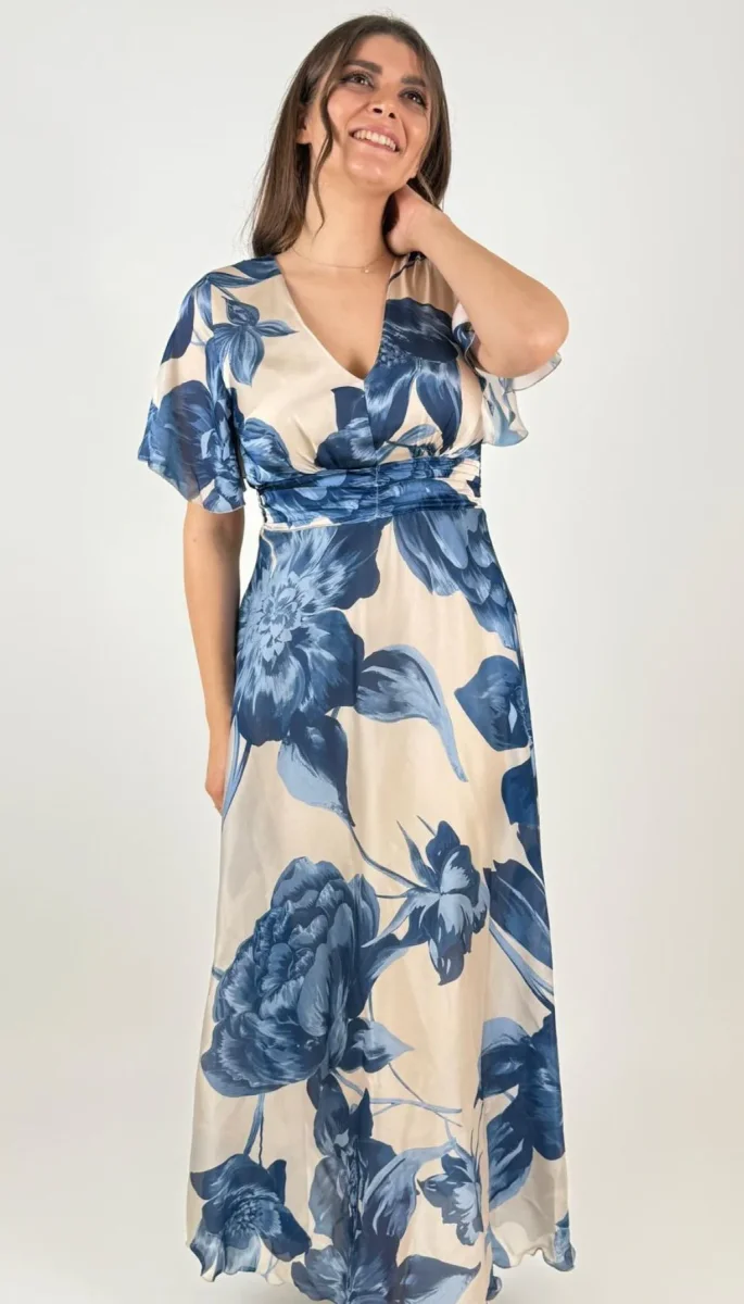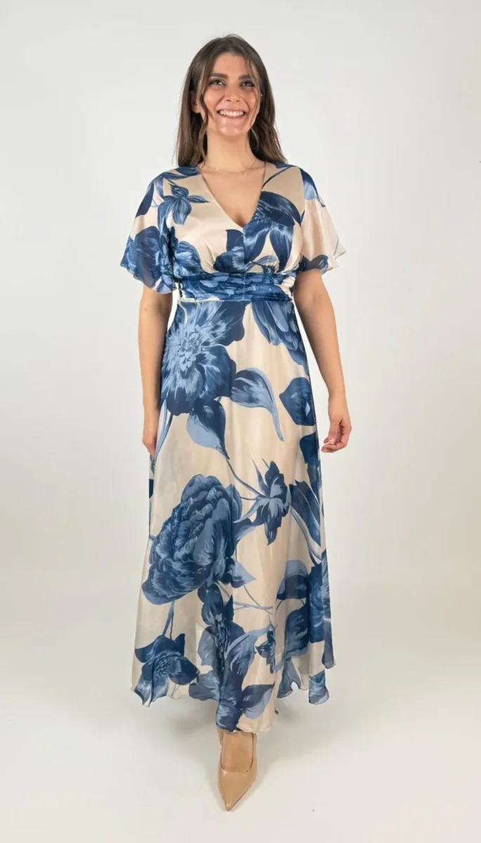 Vestito lungo fluido in tessuto leggero a stampa floreale, morbido sui fianchi e valorizzato dal punto vita arricciato. Lo scollo a V slancia la silhouette, mentre il retro con fascia elastica garantisce comfort. Perfetto per cerimonie, eventi estivi e party serali.