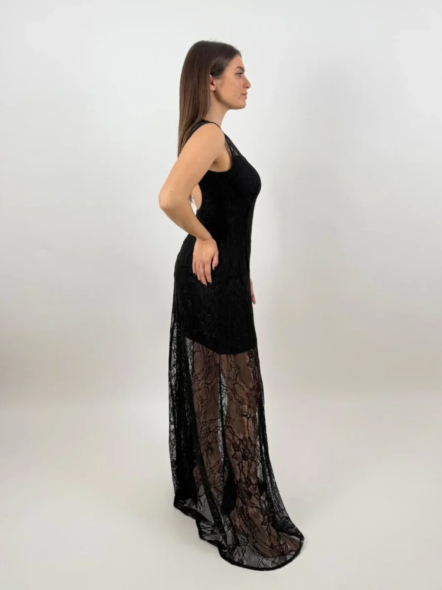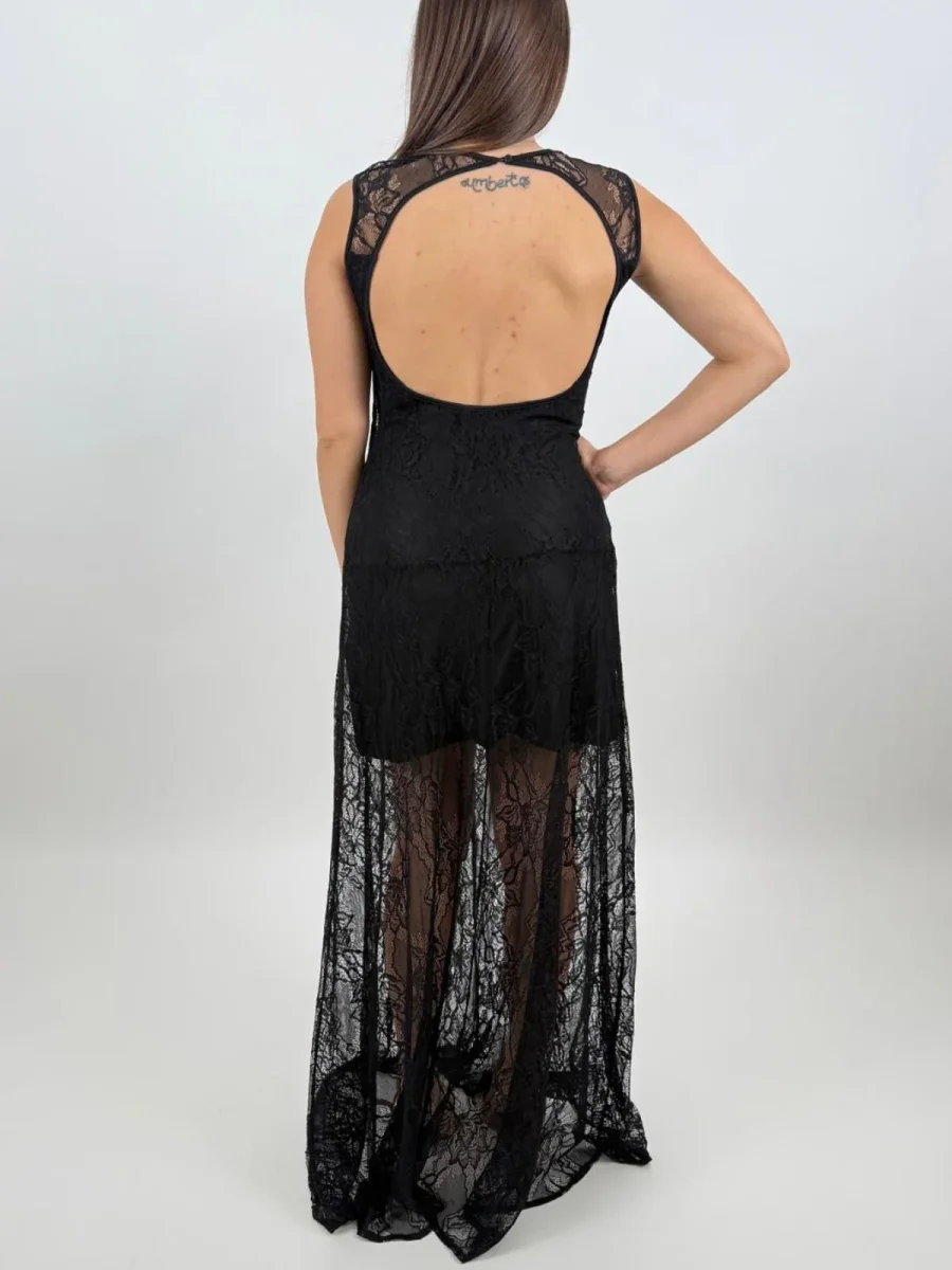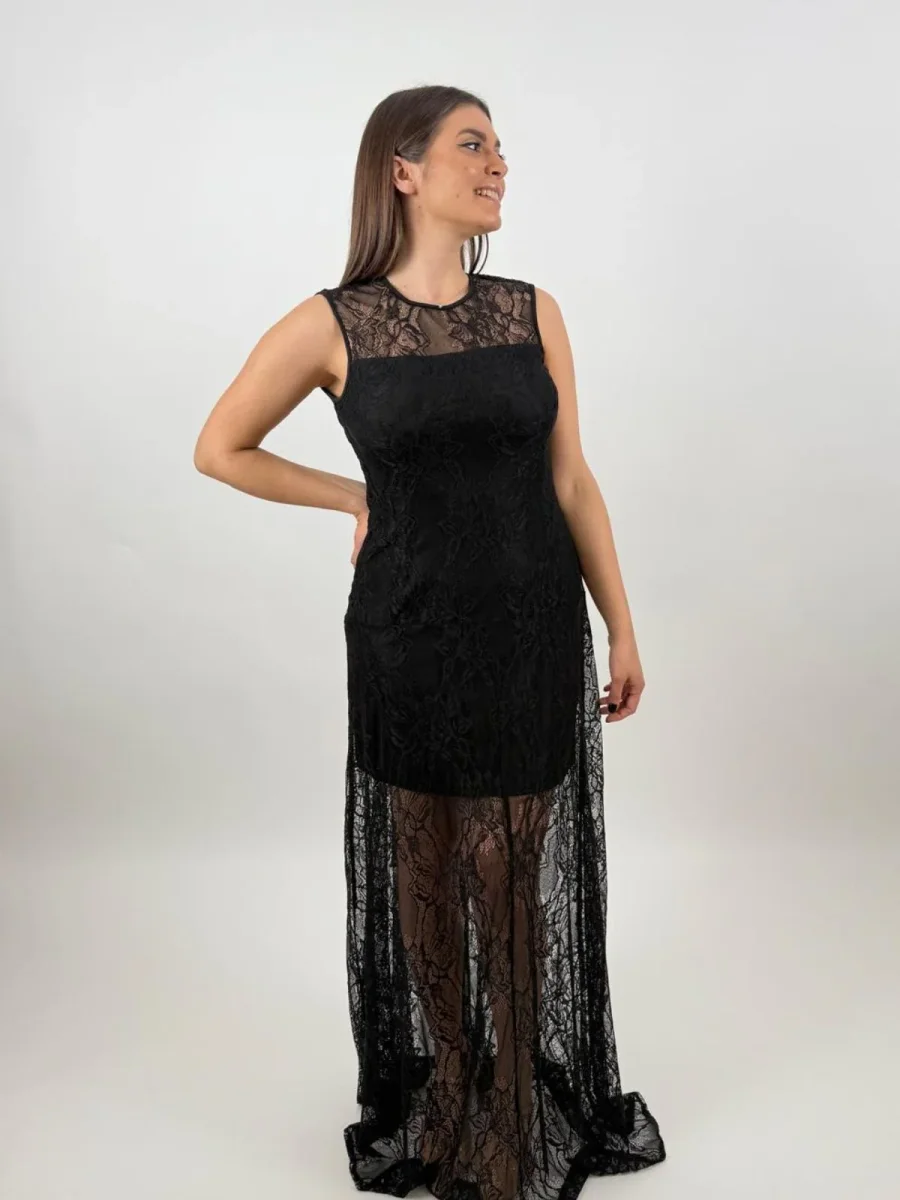 Scegli l’abito lungo in pizzo di misto cotone effetto see-through con collo a giro e oblò sul retro. Per un’eleganza romantica e chic.