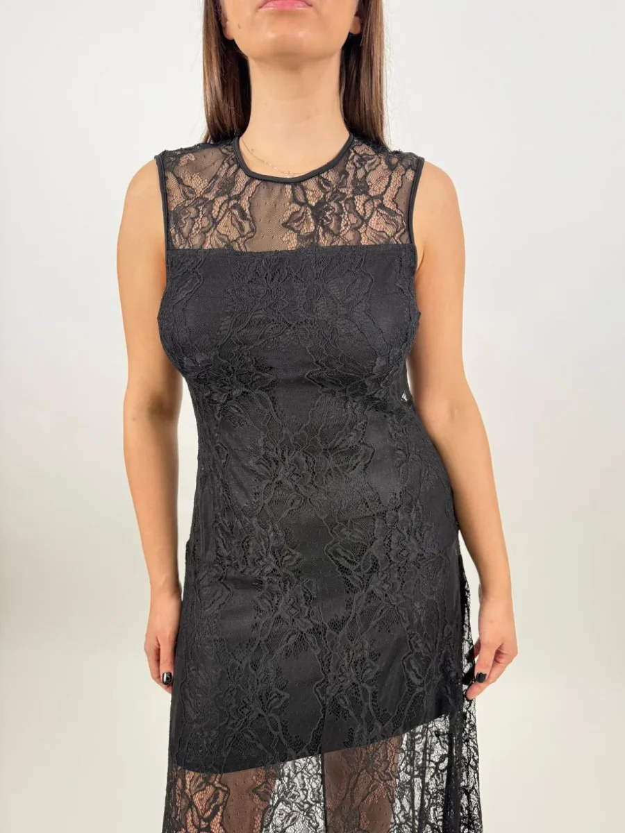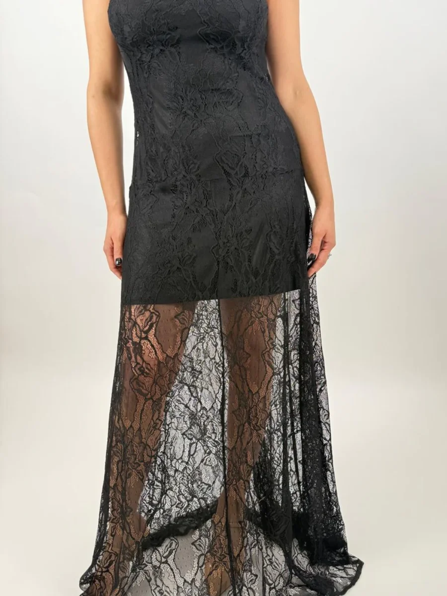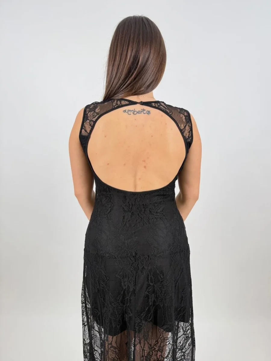 Scegli l’abito lungo in pizzo di misto cotone effetto see-through con collo a giro e oblò sul retro. Per un’eleganza romantica e chic.