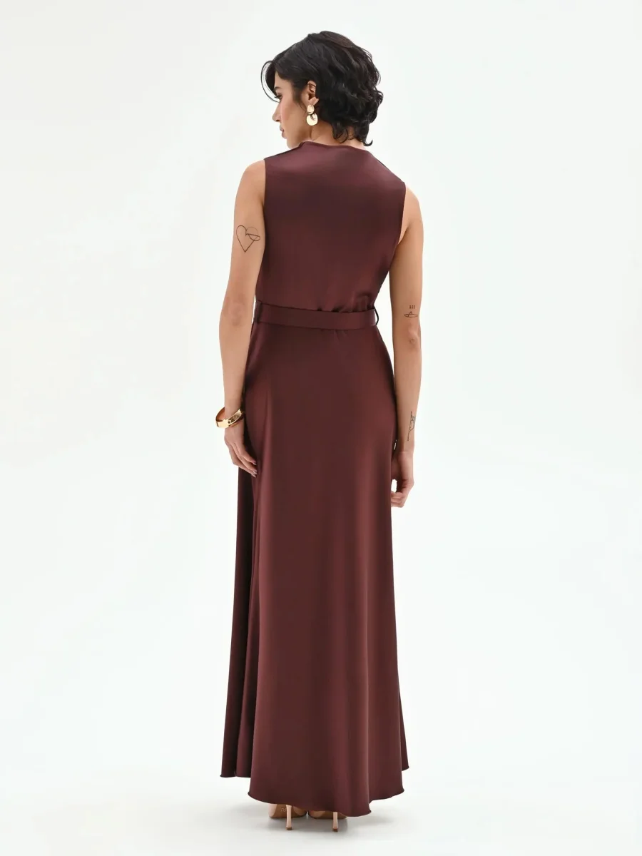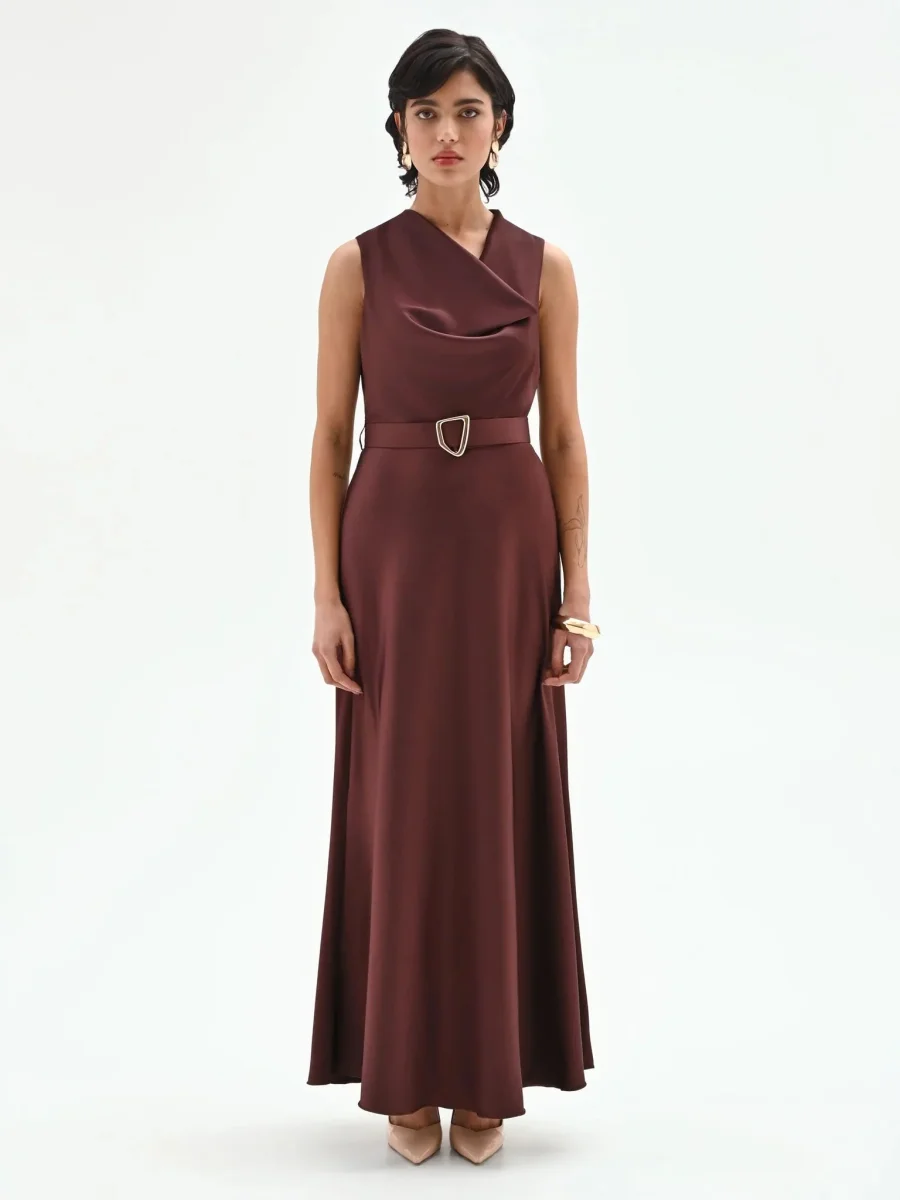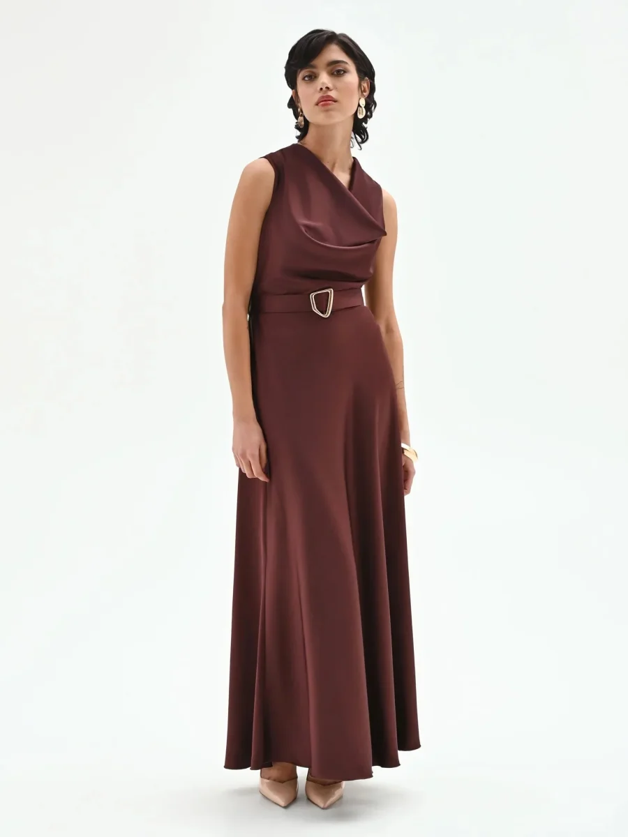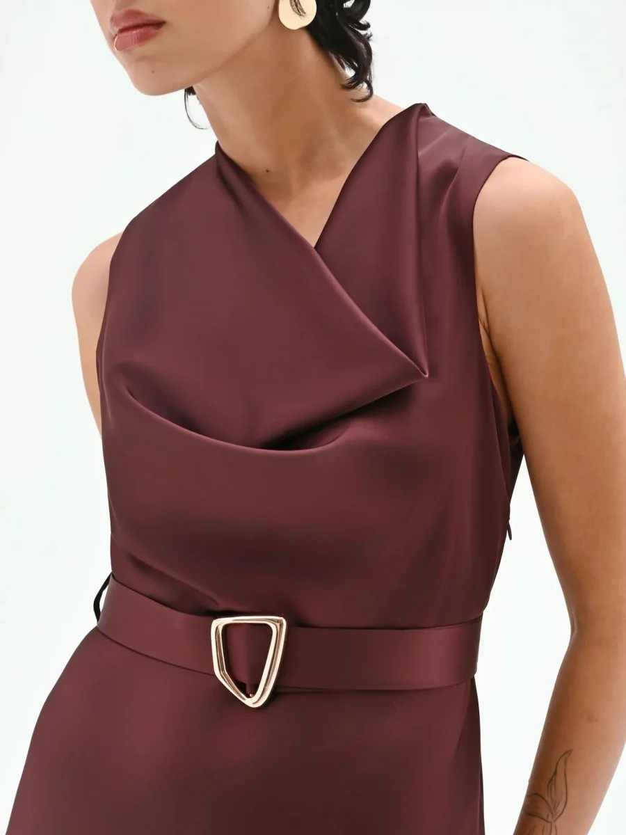 Realizzato in un tessuto dalla mano scivolata e dalla finitura satinata, questo modello smanicato si distingue per il particolare scollo drappeggiato asimmetrico che dona un movimento sofisticato al décolleté. Il profondo tono esalta la lucentezza della trama, creando riflessi cangianti. Il punto vita viene delicatamente enfatizzato da una cintura sottile rimovibile in coordinato, impreziosita da una esclusiva fibbia metallica dorata dalle linee organiche, che funge da punto luce centrale. La gonna scende morbida e svasata, accarezzando le forme e accompagnando il passo fino alla caviglia. La chiusura con zip laterale assicura una vestibilità puntuale senza interrompere l’armonia del design