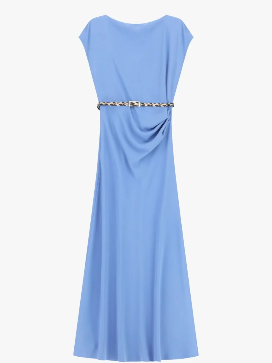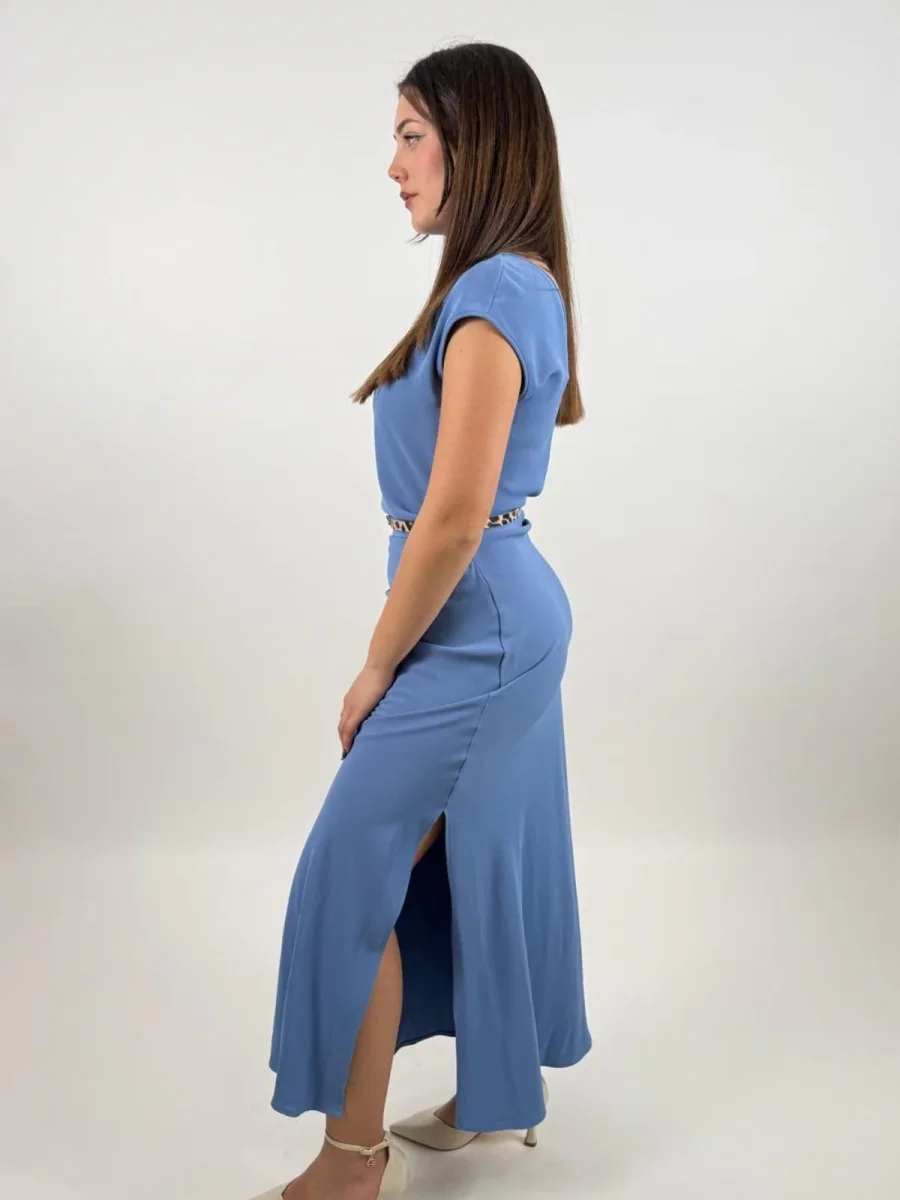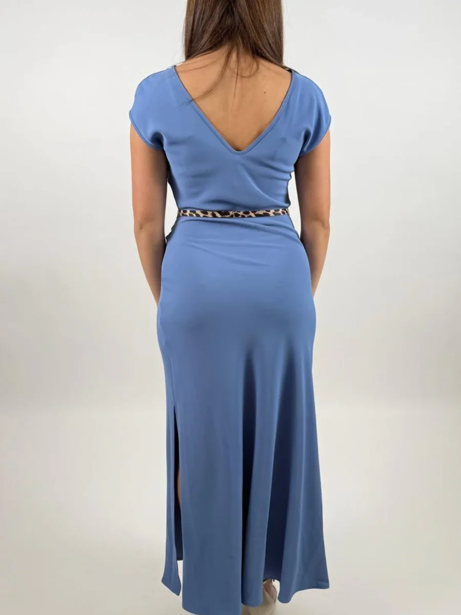 Linee essenziali e silhouette fluida caratterizzano questo abito lungo con scollo barca, impreziosito da una cintura sottile effetto animalier che sottolinea il punto vita. Le leggere maniche corte e gli spacchi laterali offrono comfort e libertà di movimento, ideale per comporre look distintivi e contemporanei.