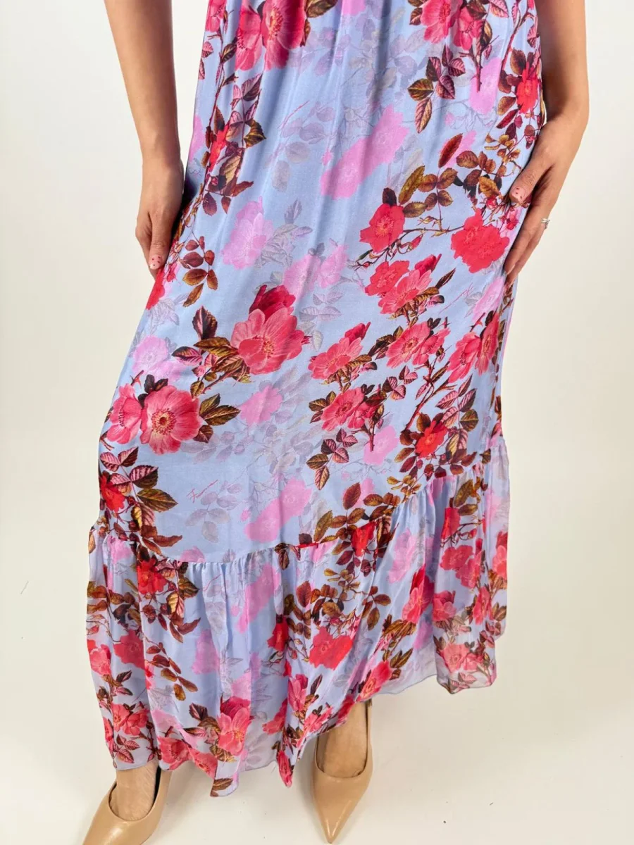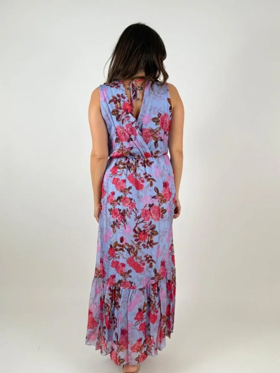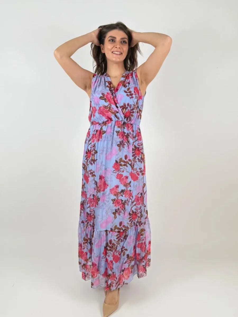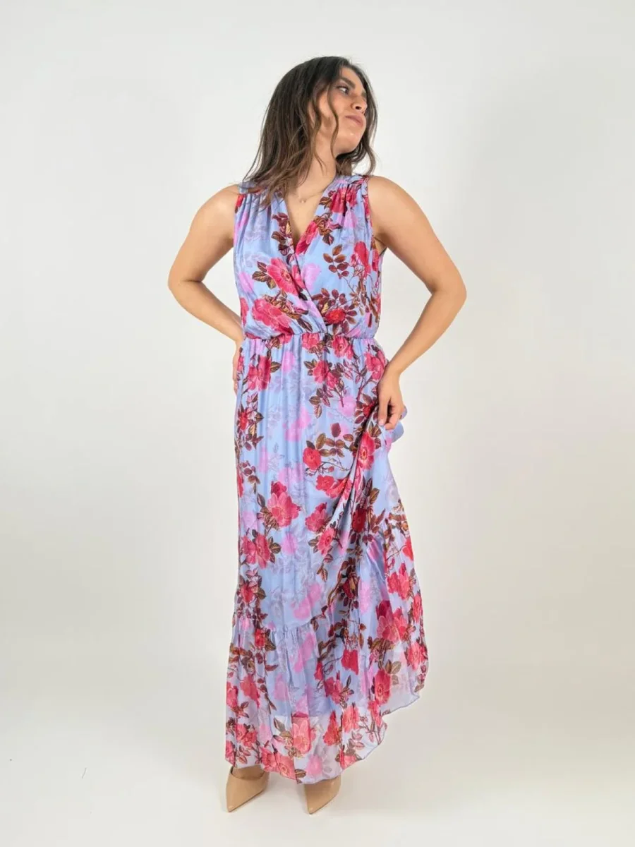 Abito senza maniche in tessuto leggero di viscosa e seta con fantasia floreale, scollo ad incrocio, e con gonna lunga con balza sul fondo.