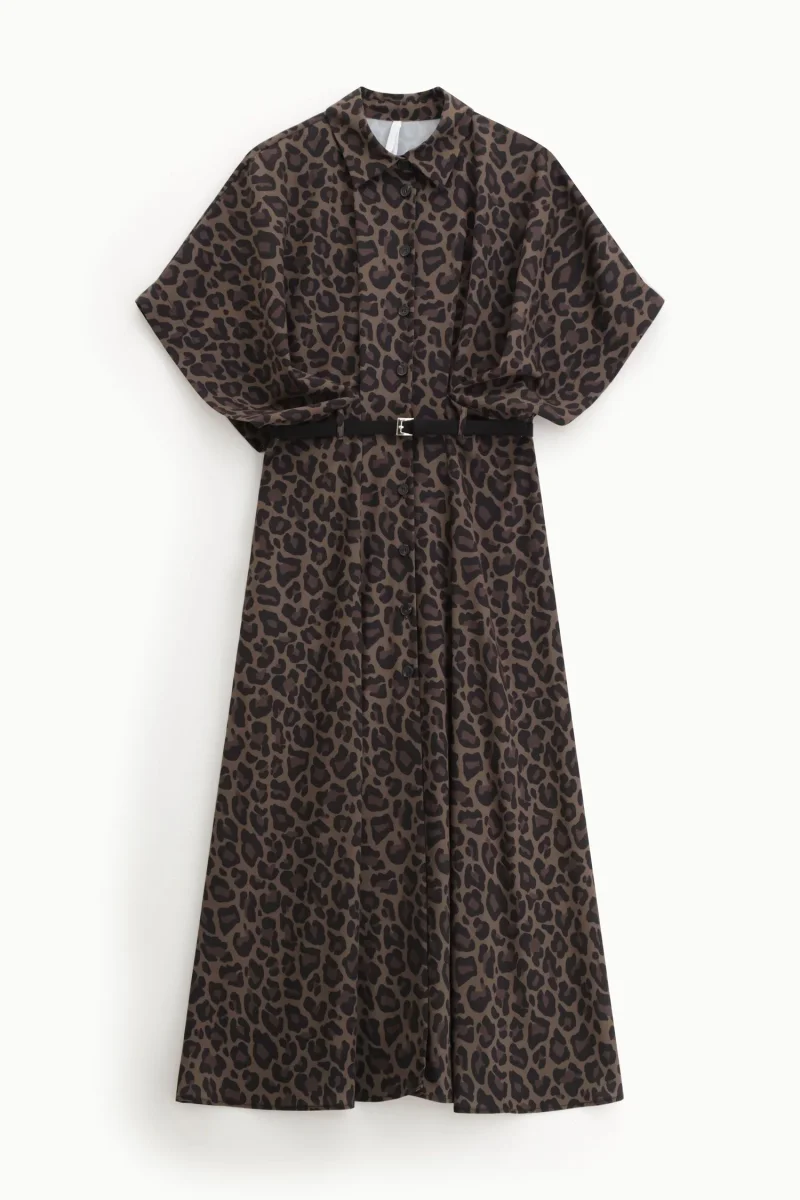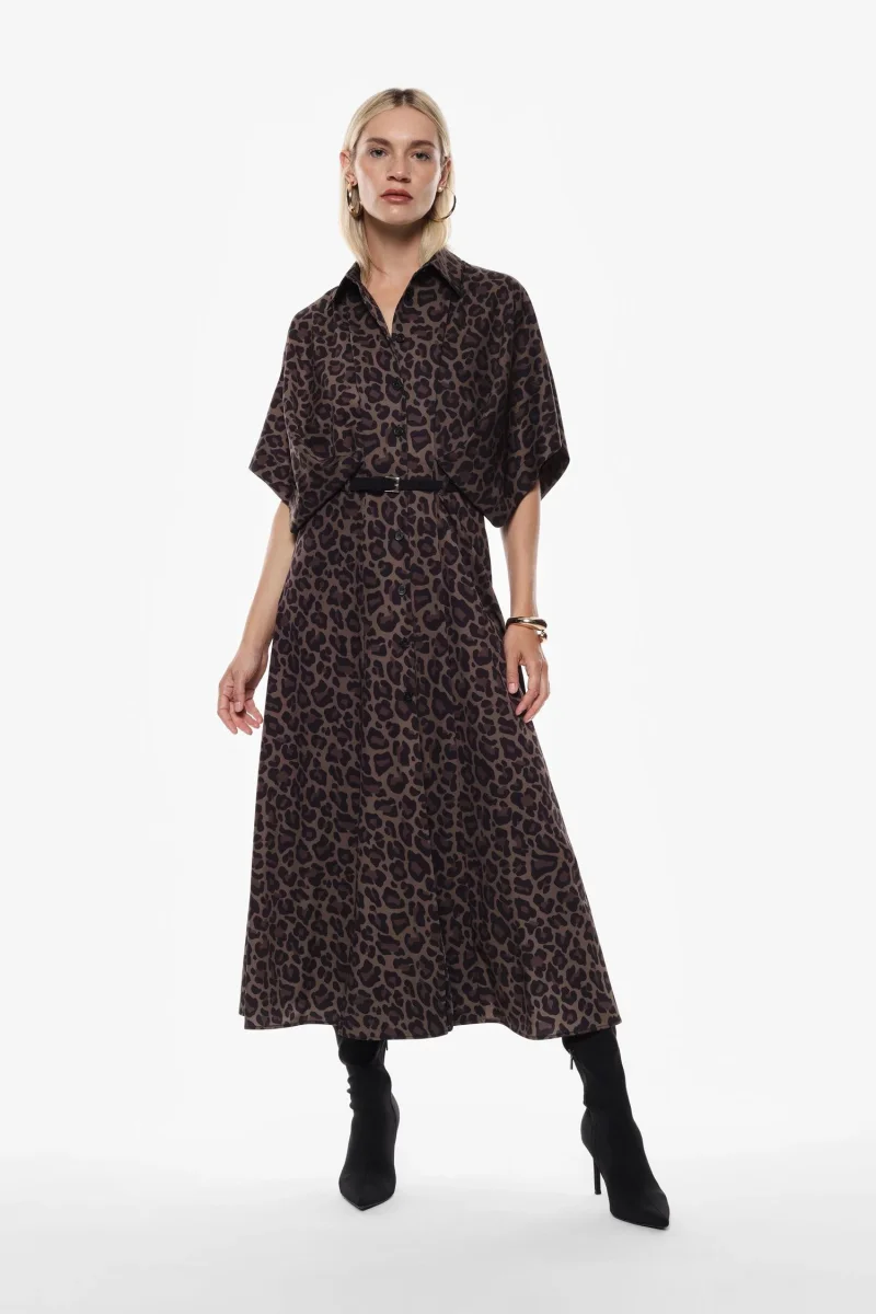 Questo abito lungo si distingue per il suo colletto classico e le maniche corte, perfetto per giornate in città. L’ampia gonna a stampa rende ogni passo un’esperienza di stile, mentre il design con abbottonatura semplice aggiunge sofisticata praticità. Ideale per chi cerca un equilibrio tra eleganza e comfort nelle occasioni quotidiane.