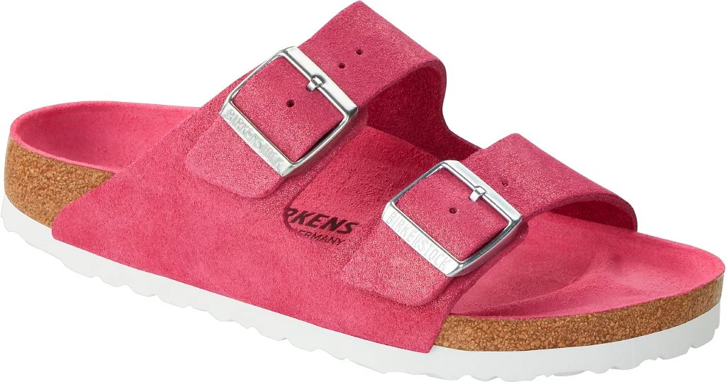 BIRKENSTOCK Arizona è un vero classico che entusiasma da decenni uomini e donne con il suo design senza tempo. Questo sandalo regolabile individualmente con i suoi due cinturini è diventata una vera scarpa di culto. Qui questo modello si presenta con un delicata finitura brillante che lo fa scintillare alla luce. La tomaia è composta da pelle scamosciata particolarmente morbida, che aderisce al piede come una seconda pelle.