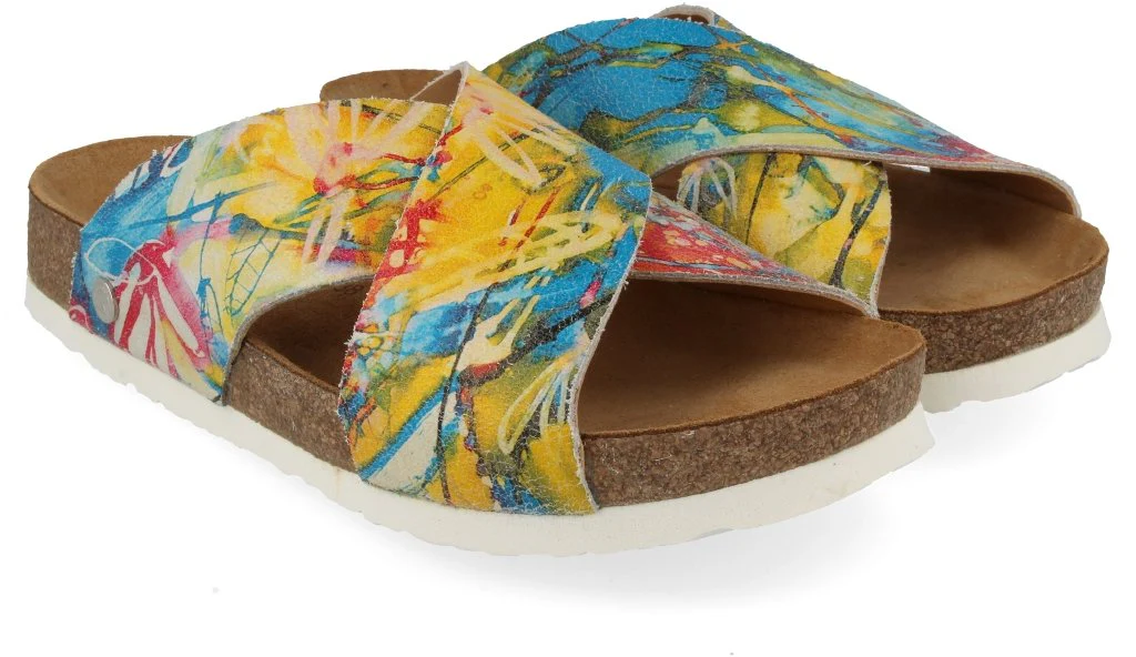 Ciabatta con tomaia in morbida pelle che avvolge il piede. Il plantare è morbido, ergonomico è rivestito in pelle scamosciata e composto da una miscela di sughero e lattice. La robusta suola in gomma termoplastica garantisce un appoggio sicuro. Ideale dentro e fuori casa anche in viaggio.