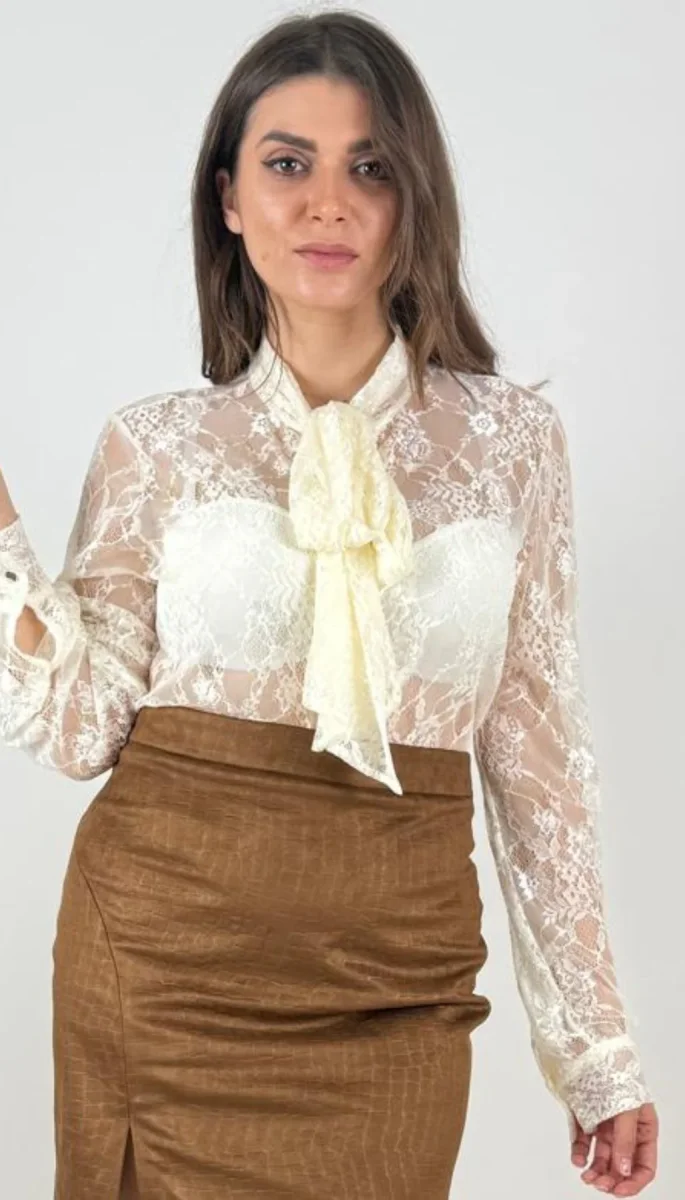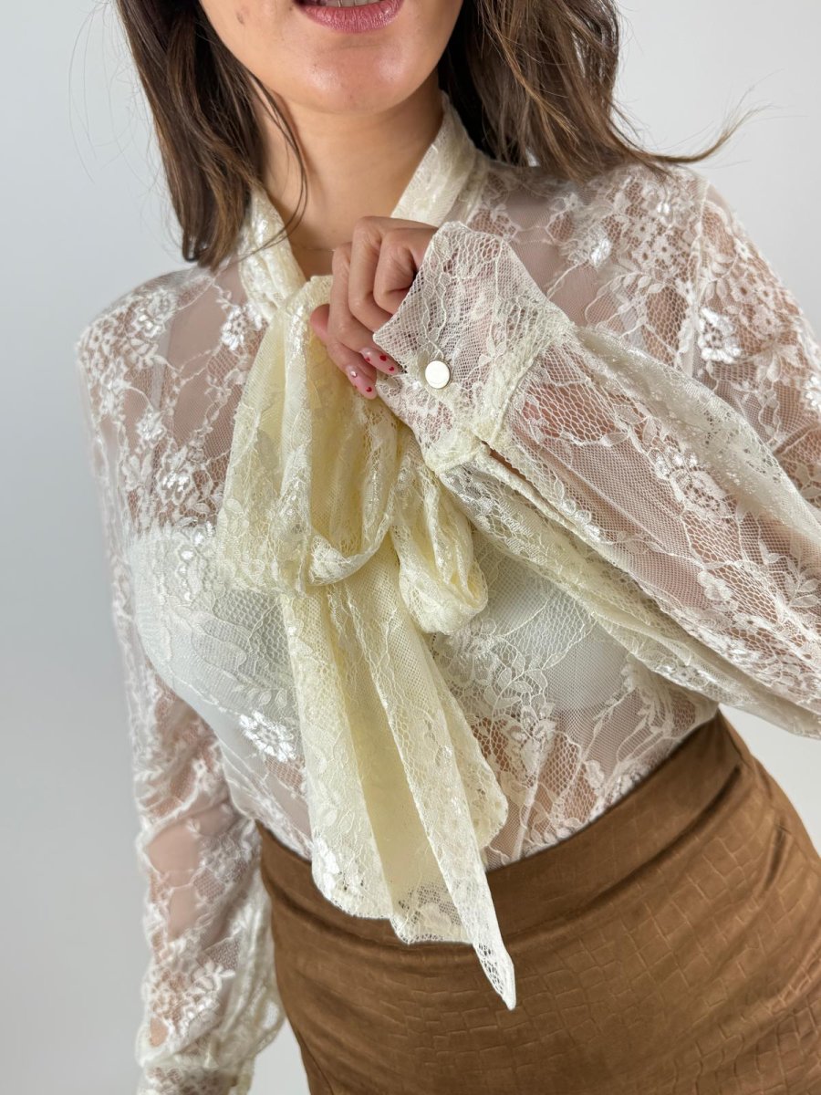 Camicia interamente in pizzo, con collo alto e fiocco, manica lunga, design floreale, vestibilità regular e chiusura con bottoni.
