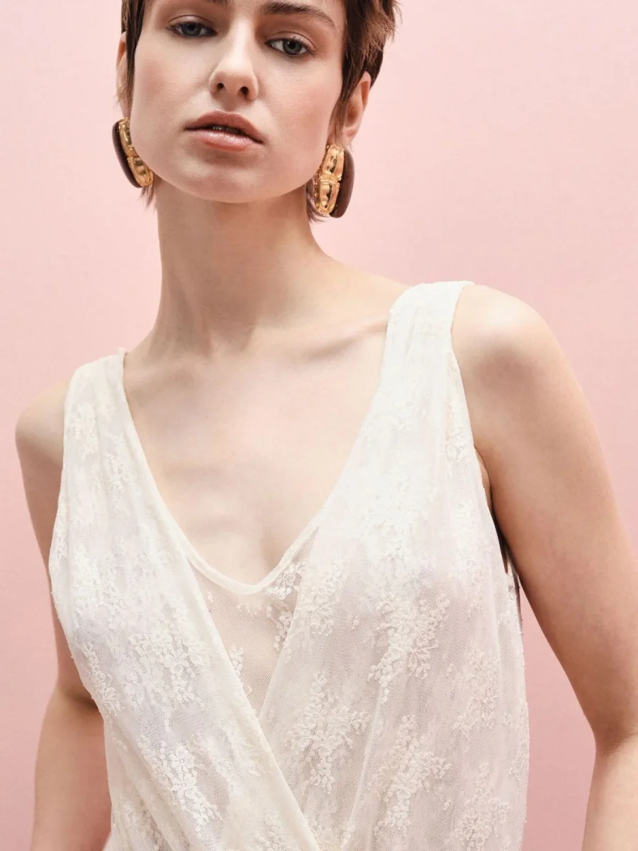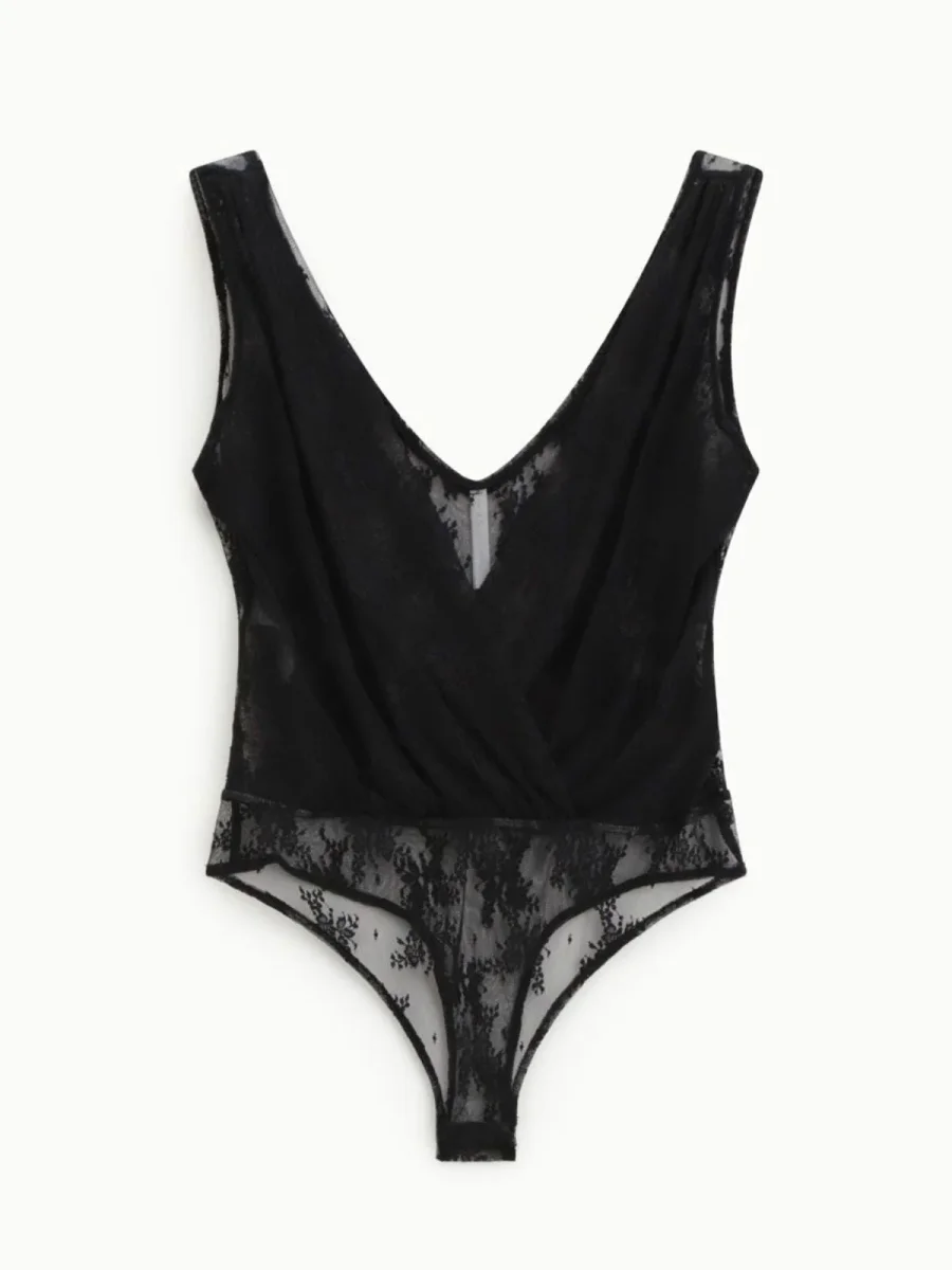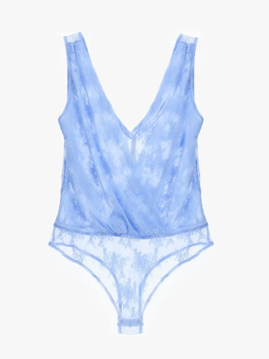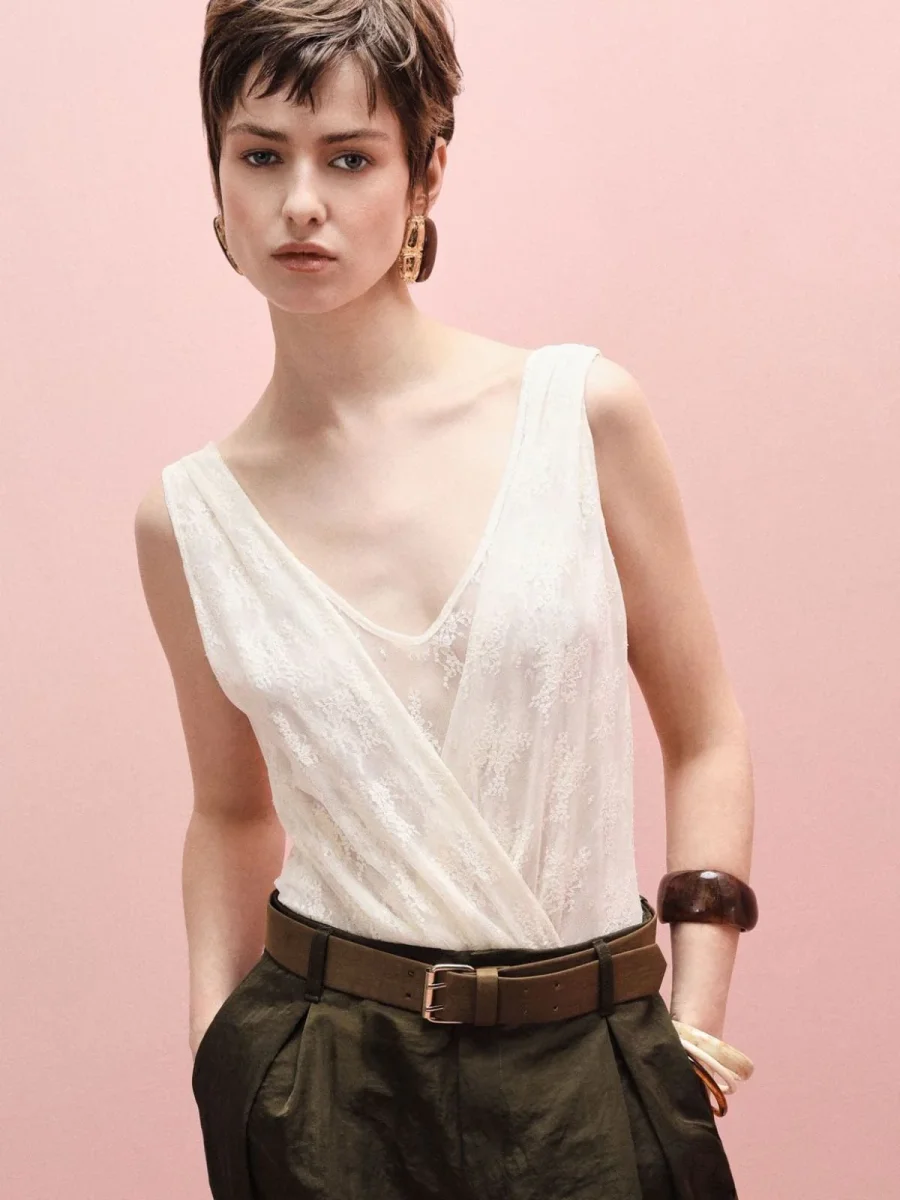 Body senza maniche dal taglio incrociato, caratterizzato da un profilo trasparente e stampa floreale in rilievo. Il design delinea una silhouette femminile e contemporanea, valorizzando ogni look metropolitano. Il profondo scollo a v aggiunge versatilità, permettendo abbinamenti creativi con blazer o pantaloni sartoriali.