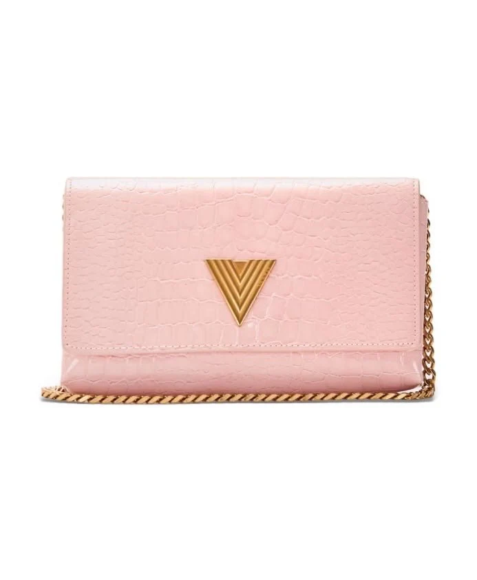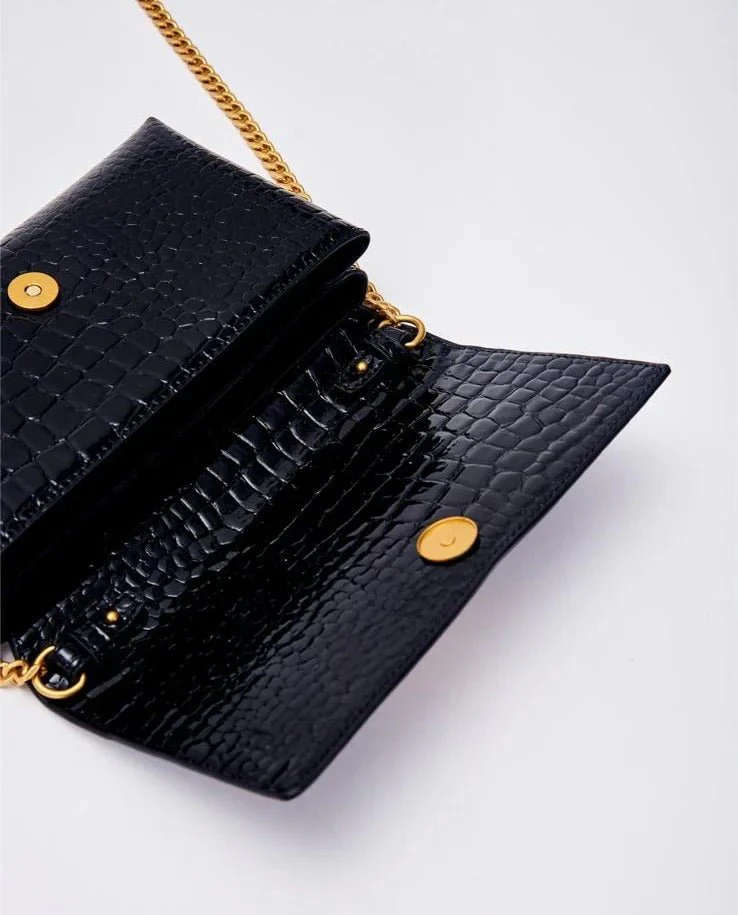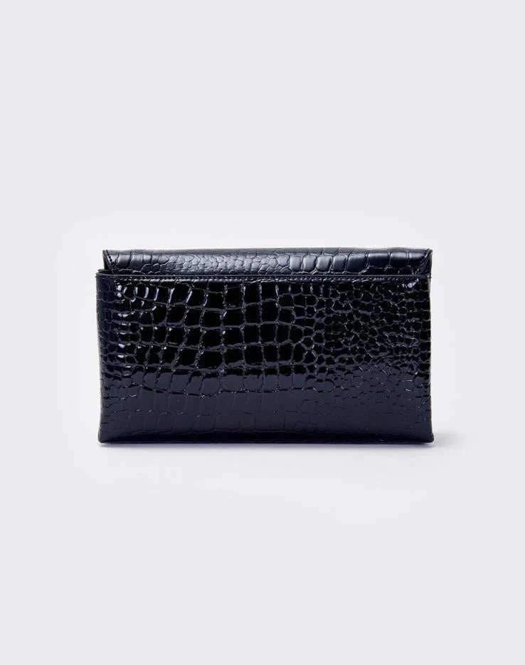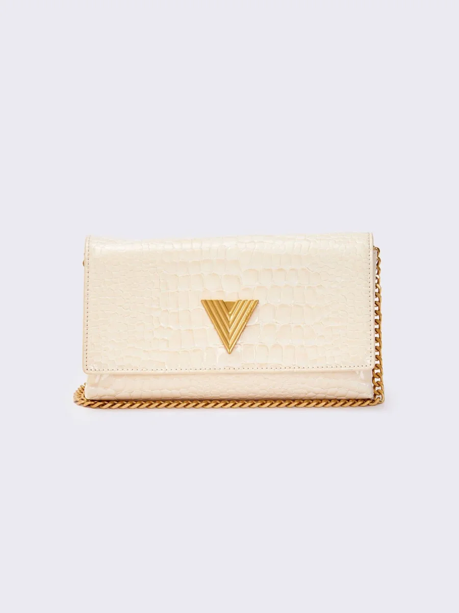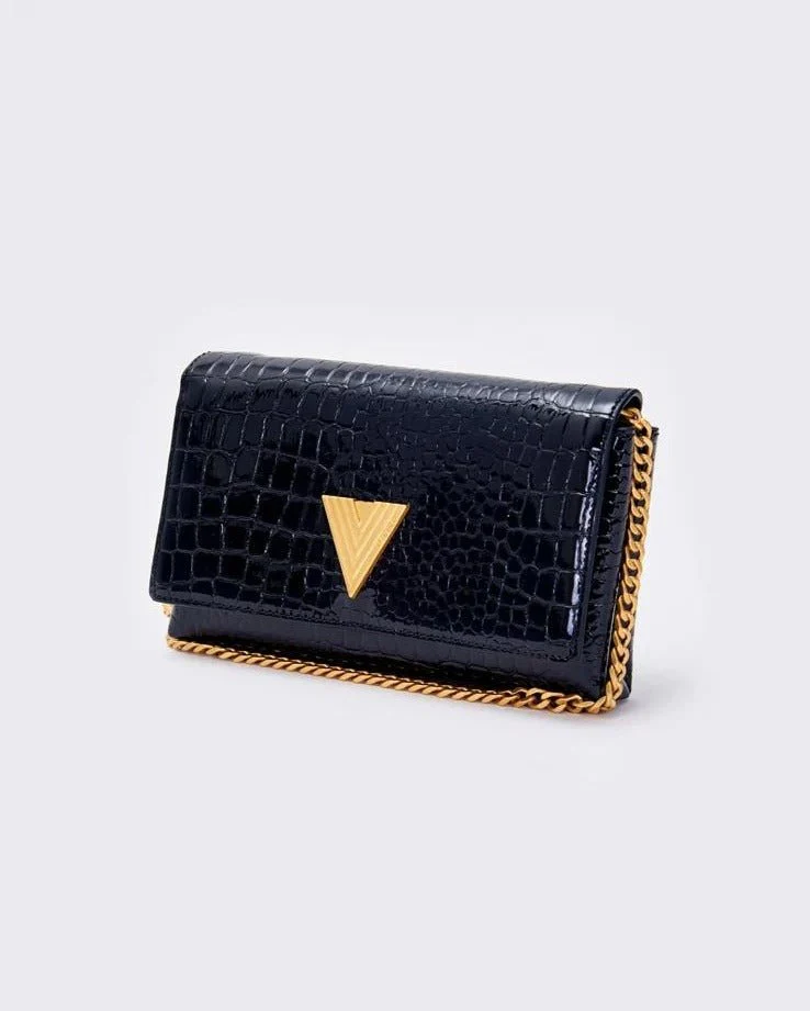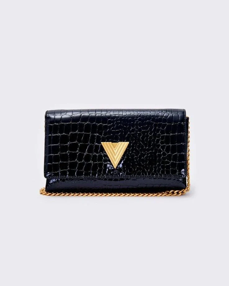 Borsa Shibuya a tracolla in ecopelle effetto “coco” in vernice. Chiusura a pattina con bottone a pressione con calamita. Dettaglio fibbia V metal plate Vicolo. Tracolla con catena removibile. La borsa può essere indossata come borsa a spalla, a tracolla e come borsa a mano. Dettaglio finiture anticate color oro. Tasca interna con cerniera e taschina piatta, doppio scomparto interno in tessuto.