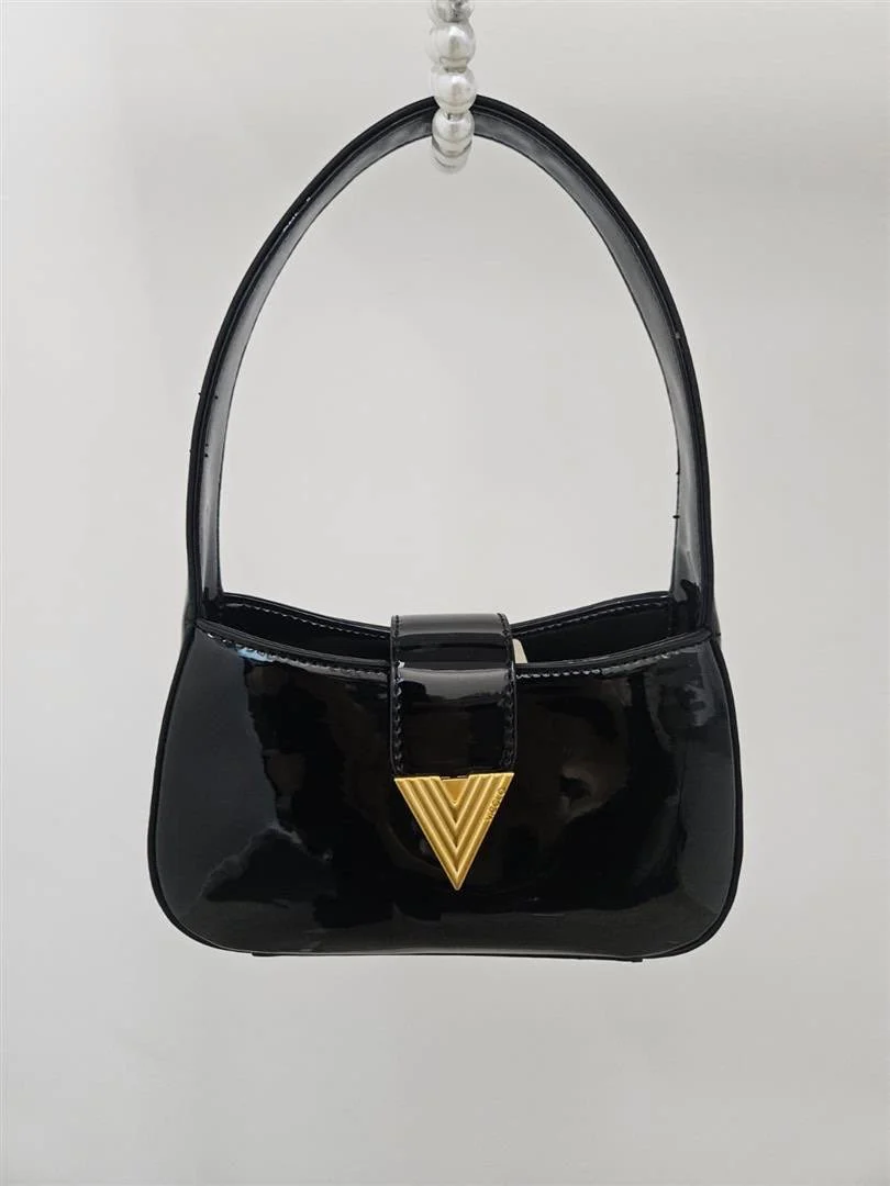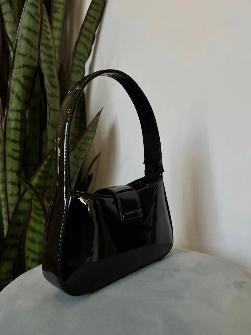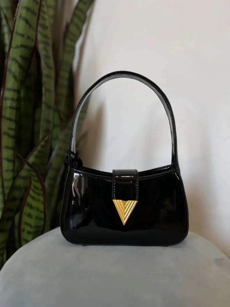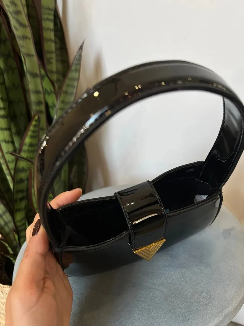 Mini bag in vernice con manicotto fisso e chiusura frontale con bottoncino automatico, decorazione su patta con logo cromato oro