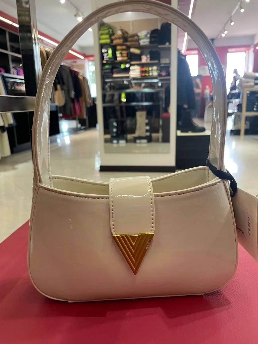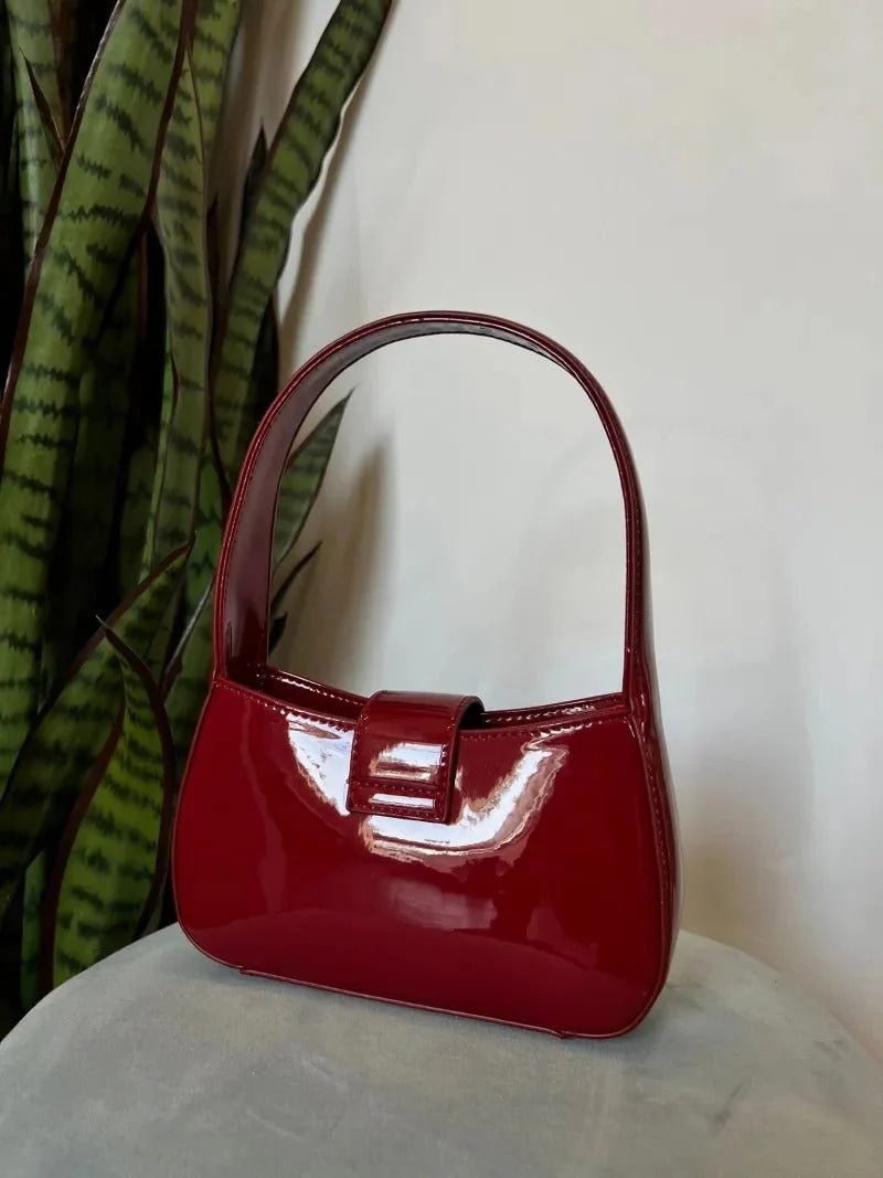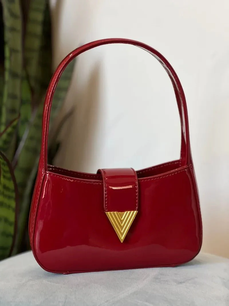 Mini bag in vernice con manicotto fisso e chiusura frontale con bottoncino automatico, decorazione su patta con logo cromato oro