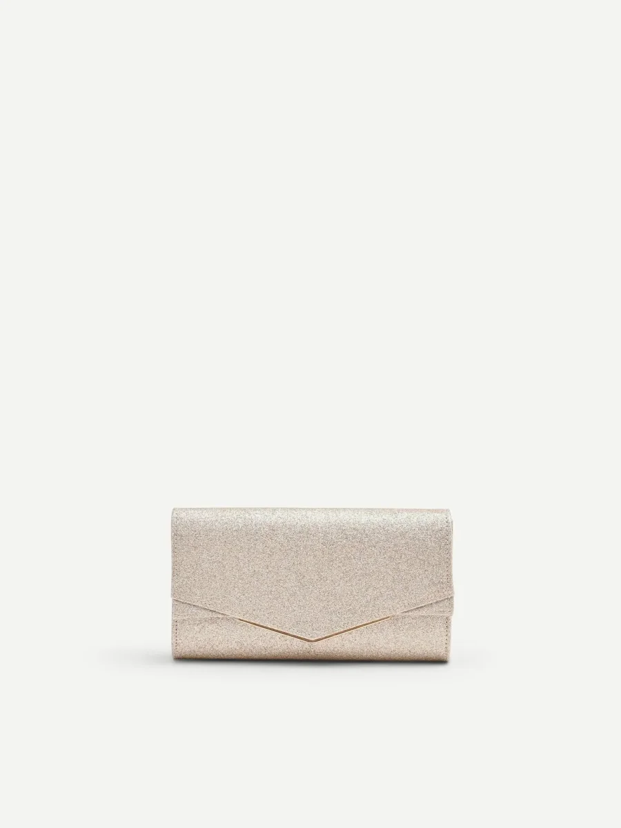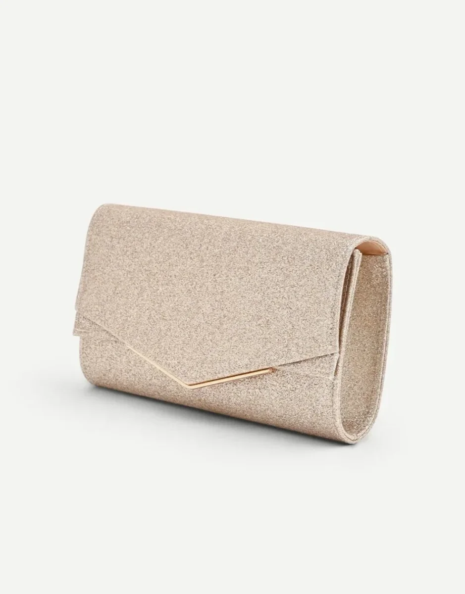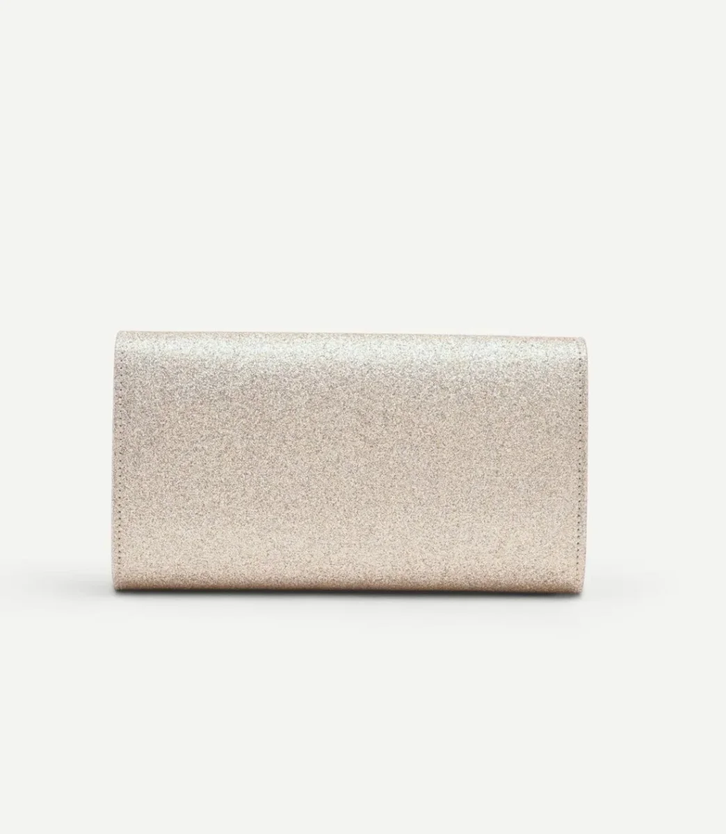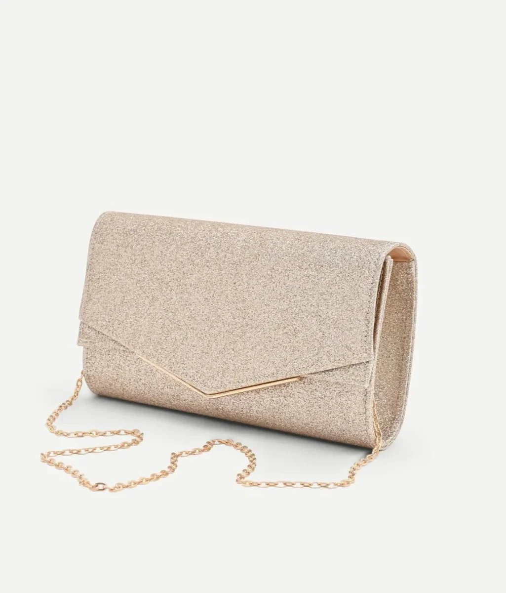 La superficie è interamente rivestita da un luminoso tessuto glitterato nella tonalità oro champagne, che la rende protagonista di ogni look. Il design a busta è impreziosito dalla patta frontale con un taglio a V centrale, il cui profilo è sottolineato da un sottile bordo in metallo dorato. La chiusura con bottone automatico nascosto preserva la pulizia delle linee, mentre la pratica tracollina metallica removibile inclusa offre una doppia possibilità di indosso, a mano o a spalla.