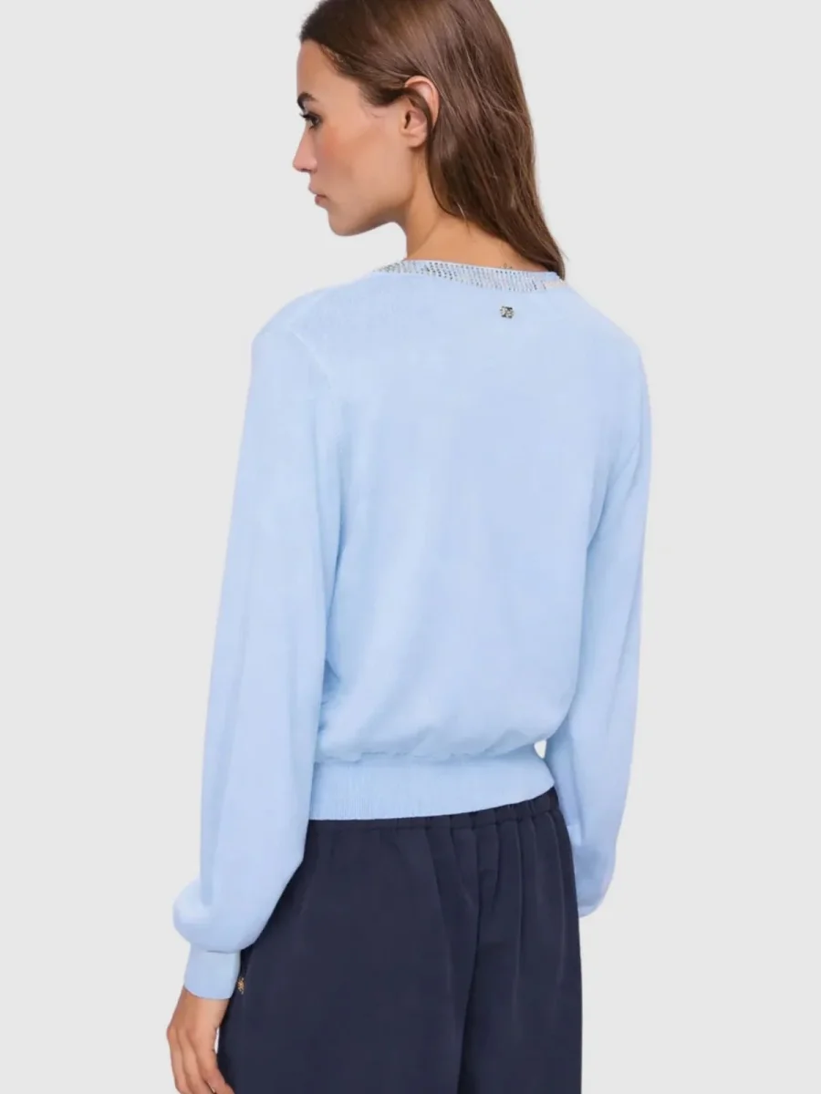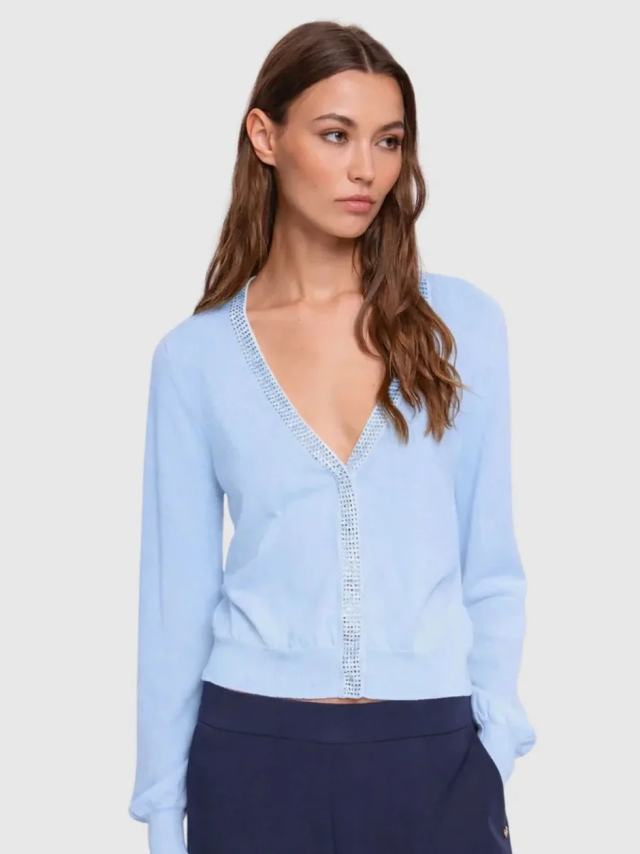 Scegli il cardigan in morbido filato con scollo a V e strass. Per un’eleganza morbida, confortevole e raffinata.