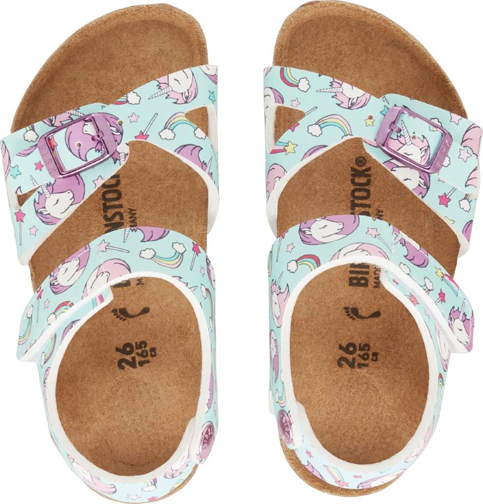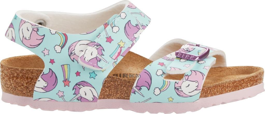 BIRKENSTOCK Colorado è una variazione del classico Rio. La fibbia sul cinturino per il tallone è stata sostituita da una chiusura in velcro che permette di indossare e togliersi la scarpa in un lampo. Perfetto per i piedini impazienti dei bimbi! Questi sandali si mostrano qui in una versione che farà battere i cuori delle ragazze. La vivace stampa con gli unicorni accompagnerà i bambini durante tutta l’estate. La suola esterna in colore coordinato completa l’aspetto raffinato del sandalo. La tomaia è in Birko-Flor®, un materiale sintetico resistente all’usura e delicato per la pelle.