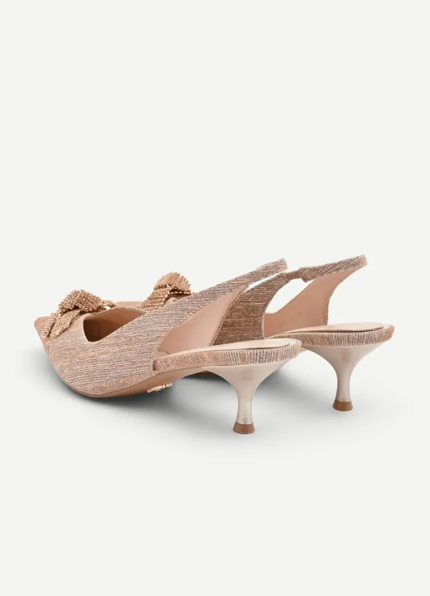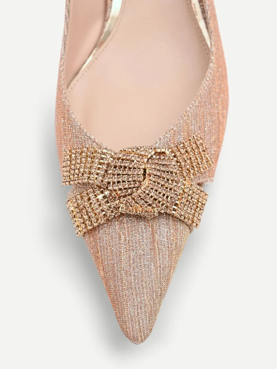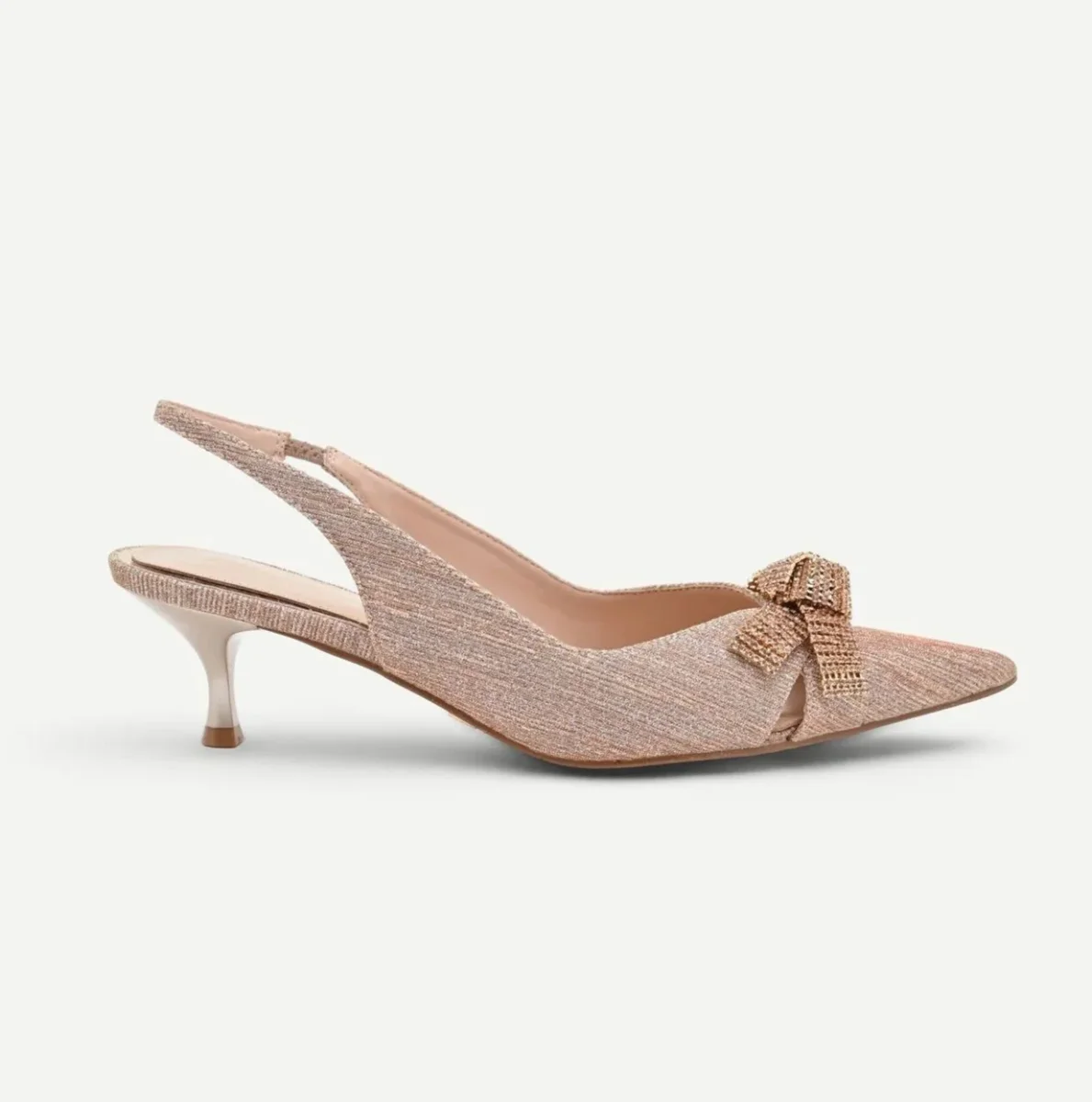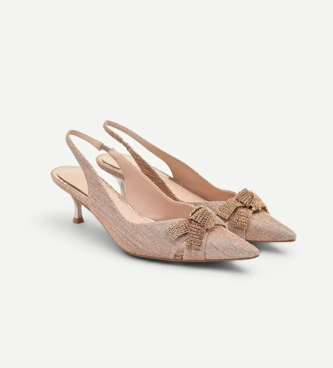 La sua silhouette affusolata, con punta sfilata, è realizzata in un tessuto interamente rivestito di glitter, in una delicata tonalità champagne rosato che riflette la luce a ogni movimento. Il fiocco decorativo sulla tomaia, impreziosito da strass tono su tono, diventa il punto focale del design, un dettaglio ricercato che esprime una femminilità contemporanea. Il modello slingback, con cinturino posteriore, lascia il tallone scoperto e assicura una calzata stabile e confortevole, bilanciata da un tacco basso e sottile, ideale per essere indossato a lungo.