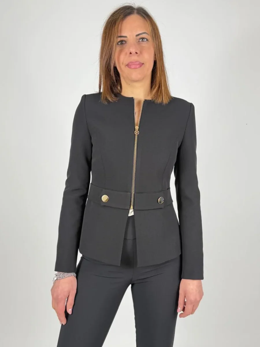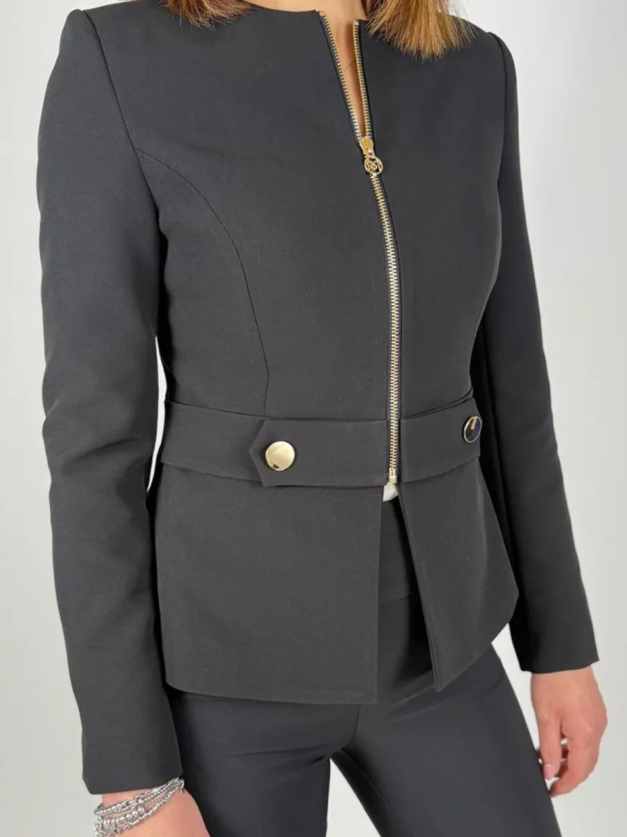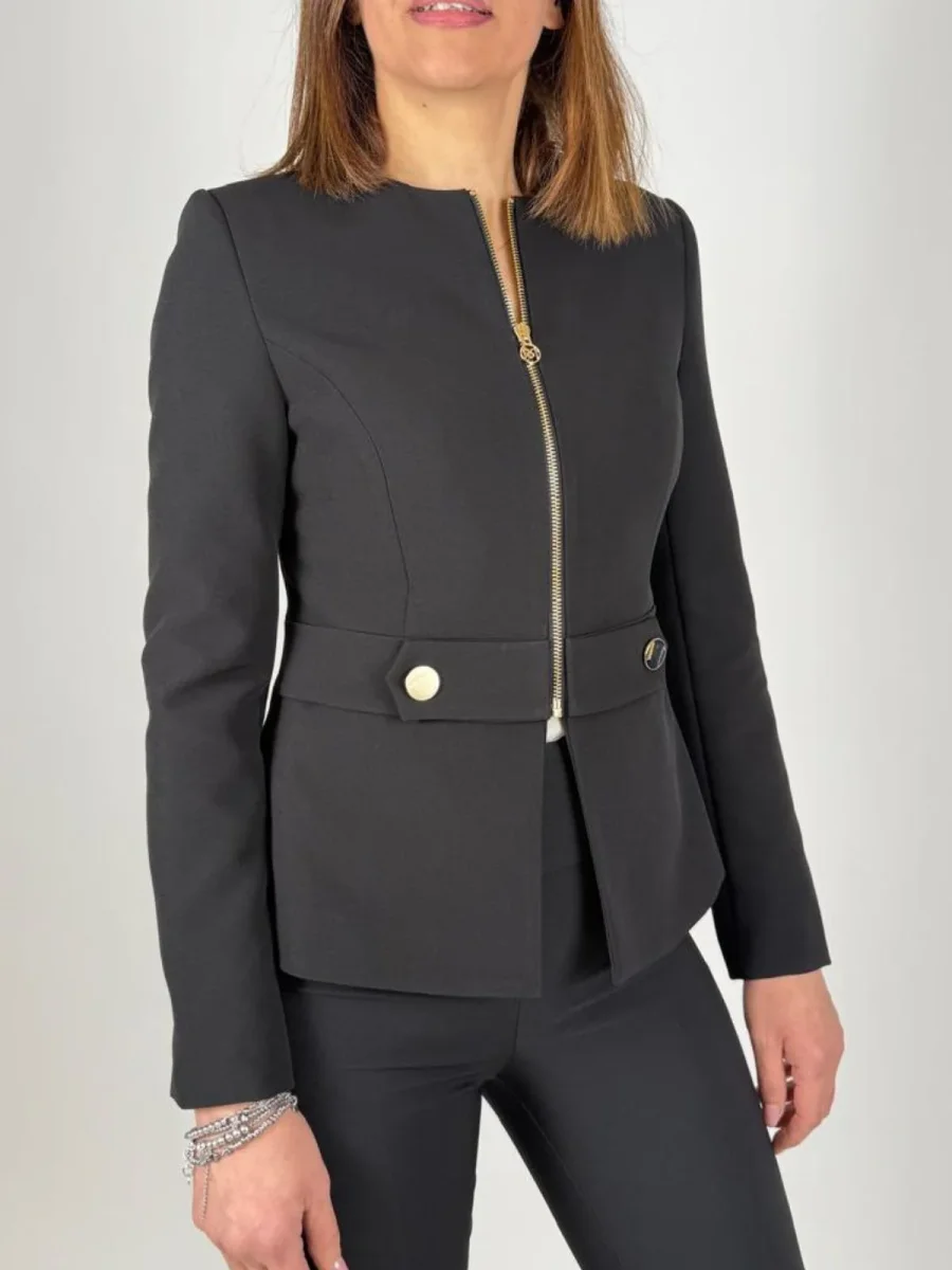 . Realizzata in confortevole tessuto tecnico, presenta una linea avvitata che abbraccia la figura, definita da cuciture precise e uno scollo rotondo essenziale. Le maniche lunghe e il piccolo spacco centrale sul fondo completano un design pensato per il comfort e la libertà di movimento. Il punto focale del capo è la chiusura frontale, affidata a una cerniera a vista in metallo dorato che prosegue fino alla fascia orizzontale applicata. Quest’ultima, impreziosita da due bottoni decorativi coordinati, cattura la luce e accentua il punto vita con raffinata eleganza. Ideale per creare completi formali e look da ufficio ricercati, si abbina con naturalezza a pantaloni o gonne dalle linee pulite, per un risultato sempre curato e femminile.