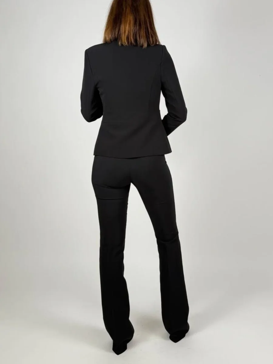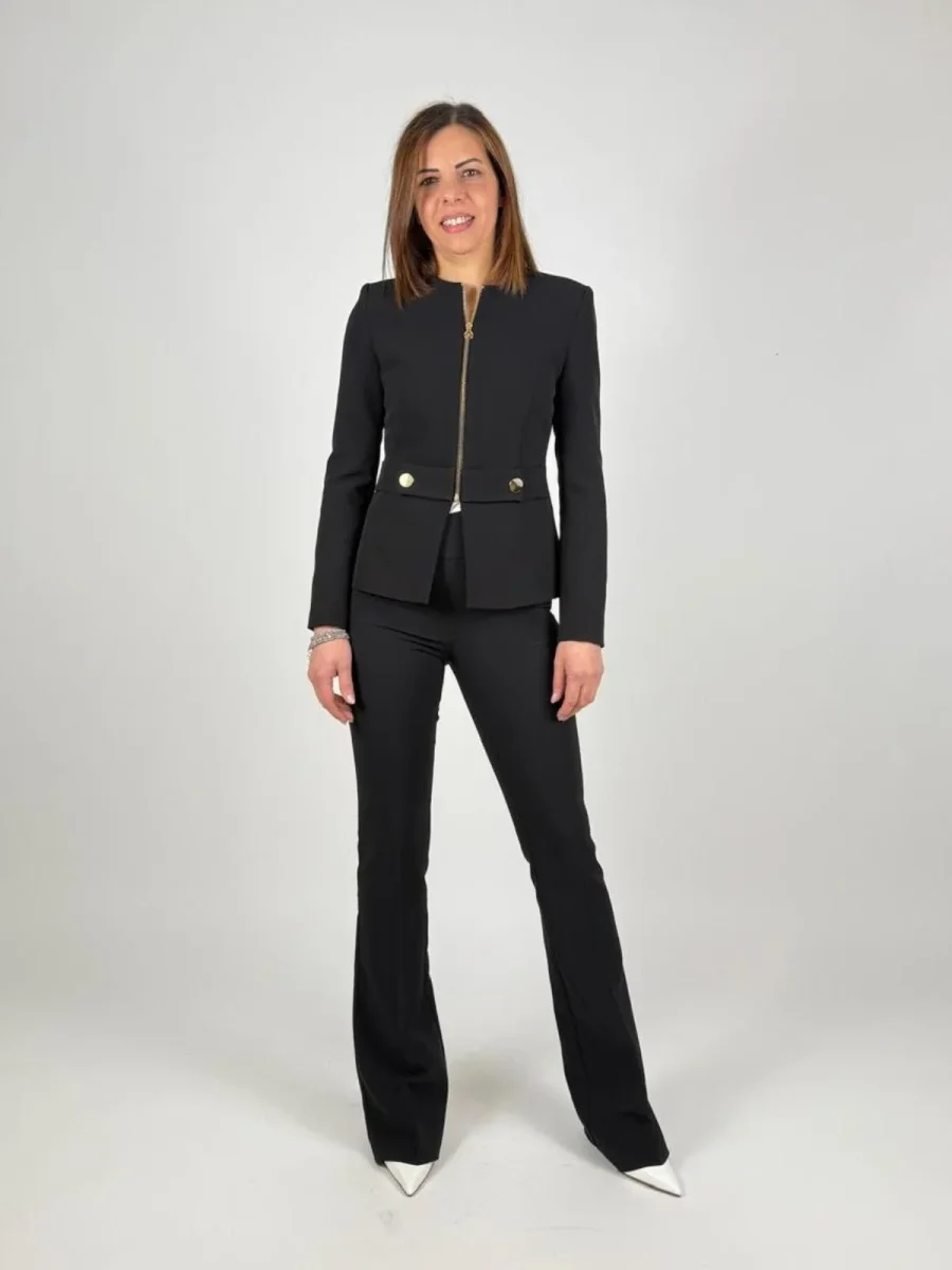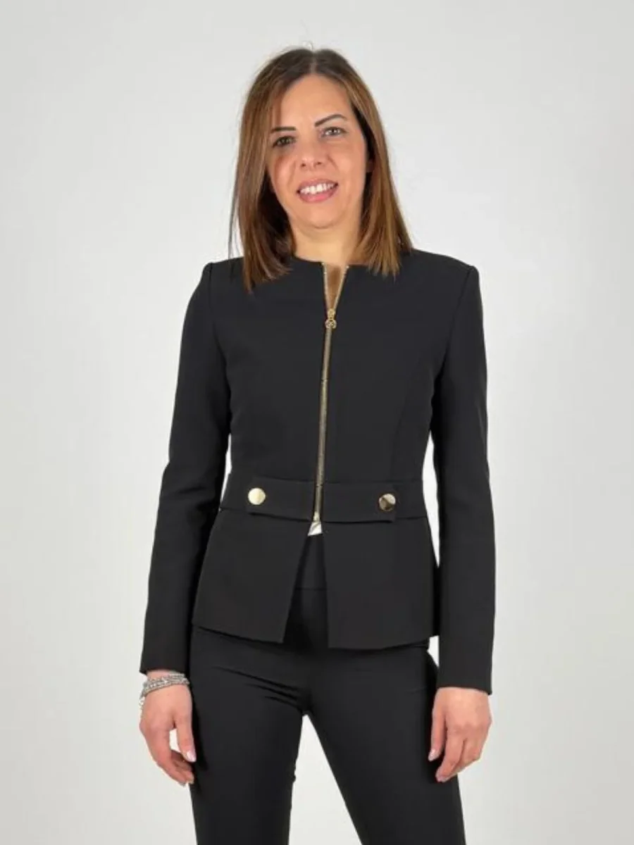. Realizzata in confortevole tessuto tecnico, presenta una linea avvitata che abbraccia la figura, definita da cuciture precise e uno scollo rotondo essenziale. Le maniche lunghe e il piccolo spacco centrale sul fondo completano un design pensato per il comfort e la libertà di movimento. Il punto focale del capo è la chiusura frontale, affidata a una cerniera a vista in metallo dorato che prosegue fino alla fascia orizzontale applicata. Quest’ultima, impreziosita da due bottoni decorativi coordinati, cattura la luce e accentua il punto vita con raffinata eleganza. Ideale per creare completi formali e look da ufficio ricercati, si abbina con naturalezza a pantaloni o gonne dalle linee pulite, per un risultato sempre curato e femminile.
