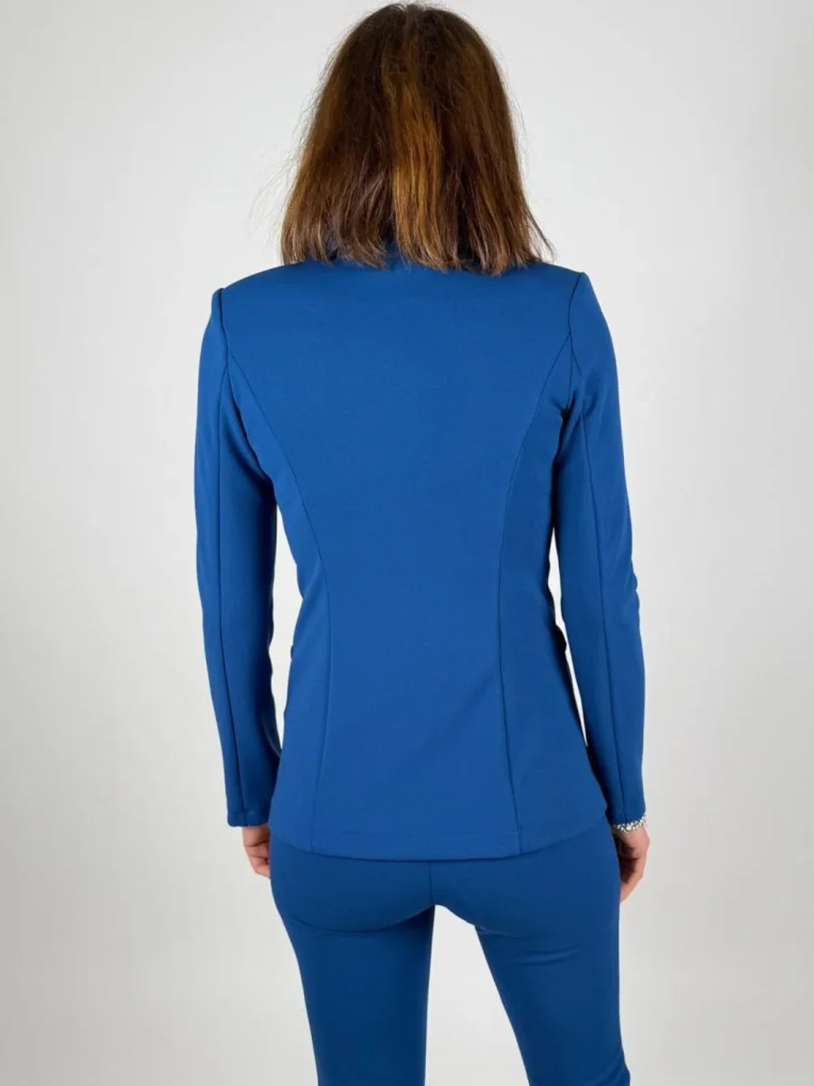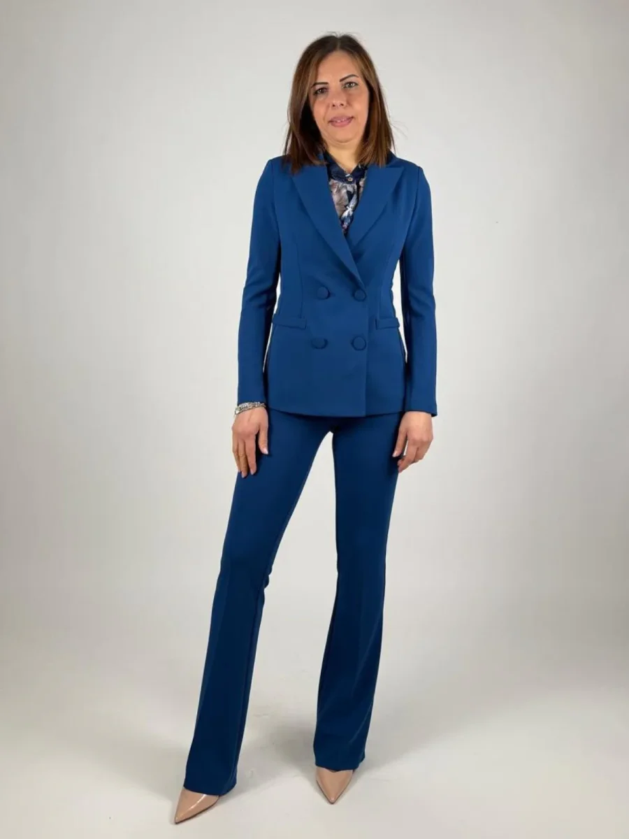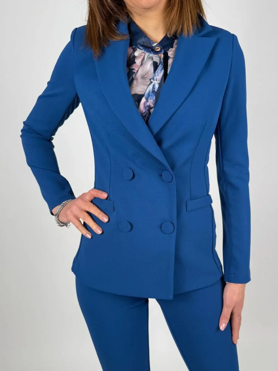 Il design presenta un collo a rever classico e una chiusura doppiopetto con bottoni ricoperti in tinta, un dettaglio che ne sottolinea la cura nella confezione. Le tasche a filetto con pattina aggiungono un tocco funzionale e tradizionale. Indossala per un look da ufficio impeccabile con gonne o pantaloni coordinati, oppure sceglila per elevare un outfit casual, abbinandola a un jeans a contrasto per un’eleganza disinvolta. Un pezzo chiave, pensato per accompagnare la donna in molteplici occasioni.