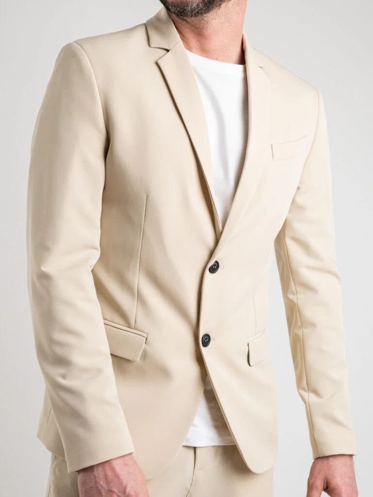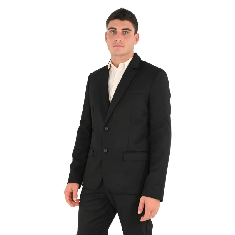 La giacca monopetto tinta unita è caratterizzata da rever classici, taschino a filetto e tasche a filetto con pattina. 63% Poliestere, 34% Viscosa, 3% Elastan