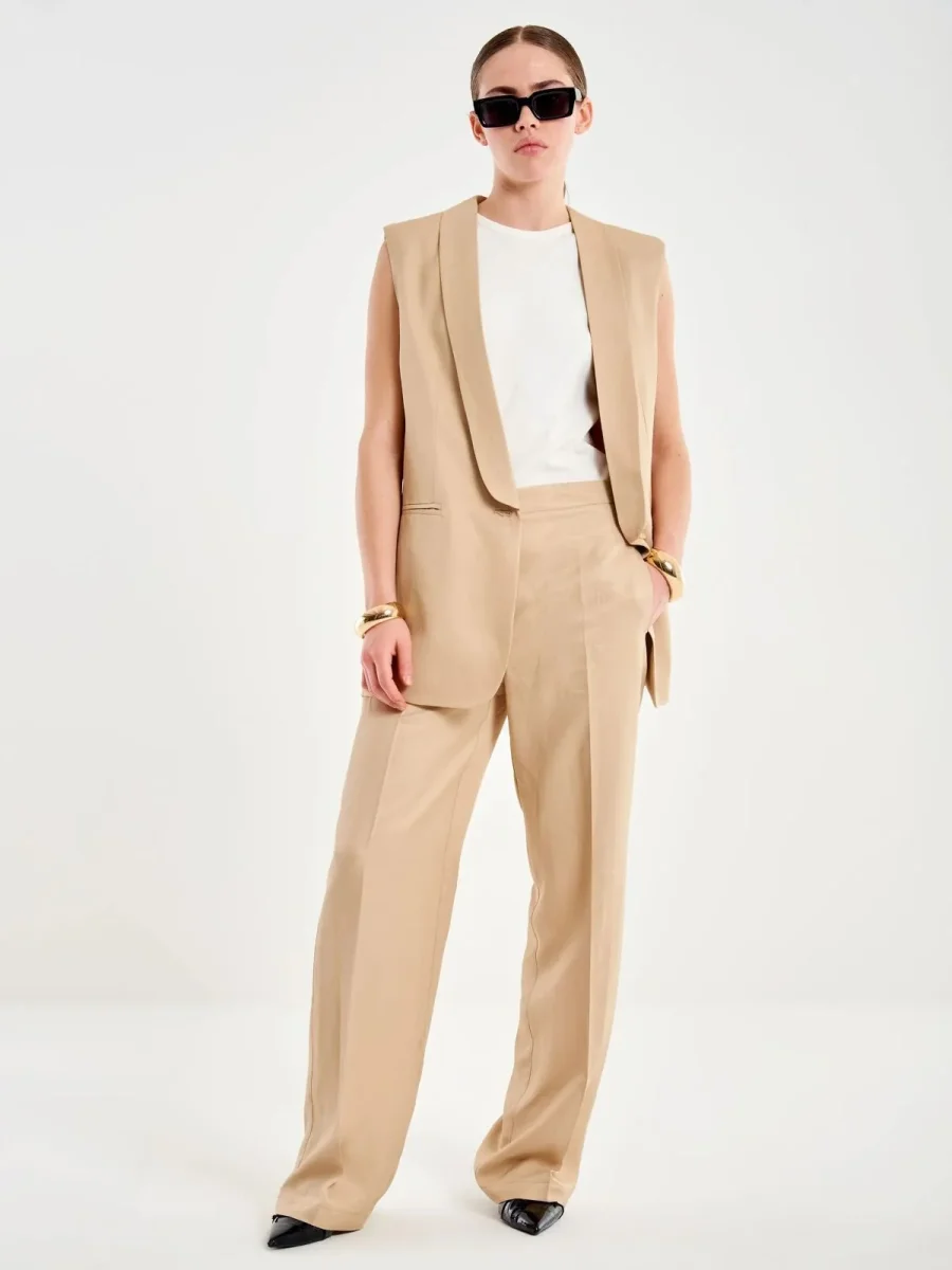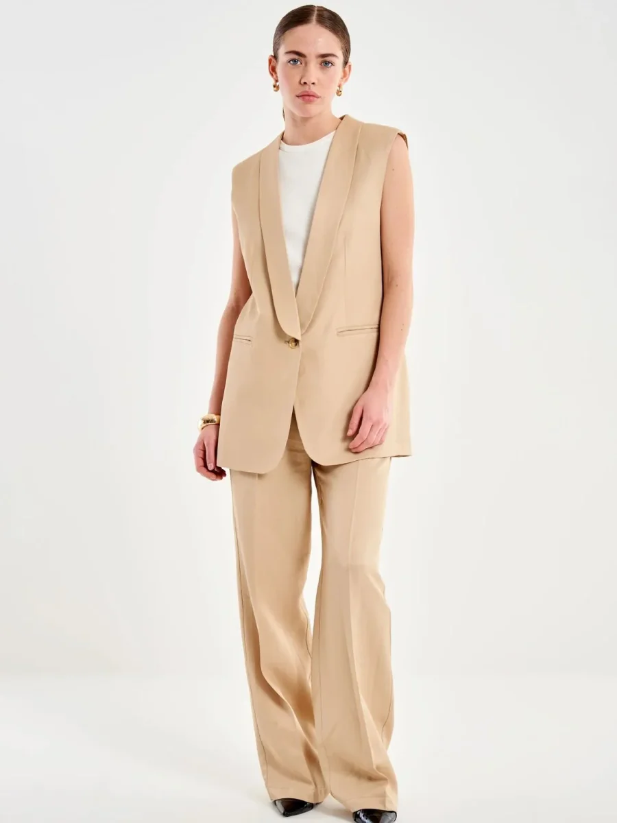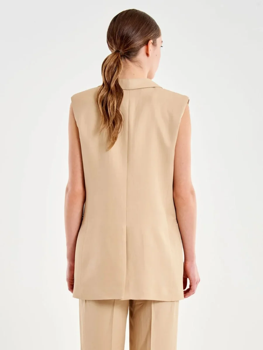 Gilet TAB0243 senza maniche con revers. Dettaglio chiusura con bottone e scollo a V. Tasche anteriori a filetto. Dettaglio cucitura centrale posteriore.