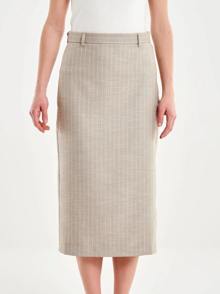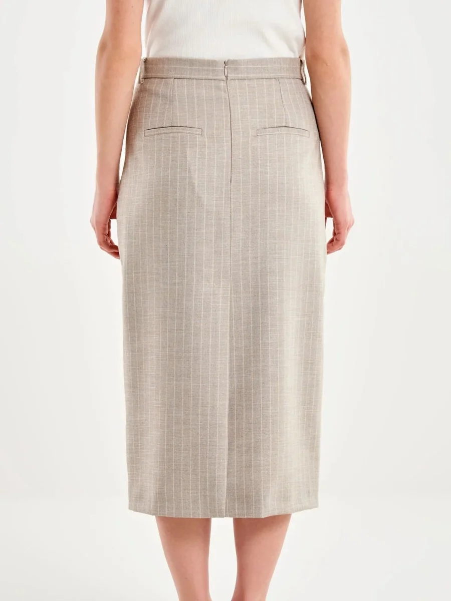 Gonna TAB0252 longuette con spacco gessata. Chiusura posteriore con cerniera, con passanti in vita. Tasche a filetto sul retro.