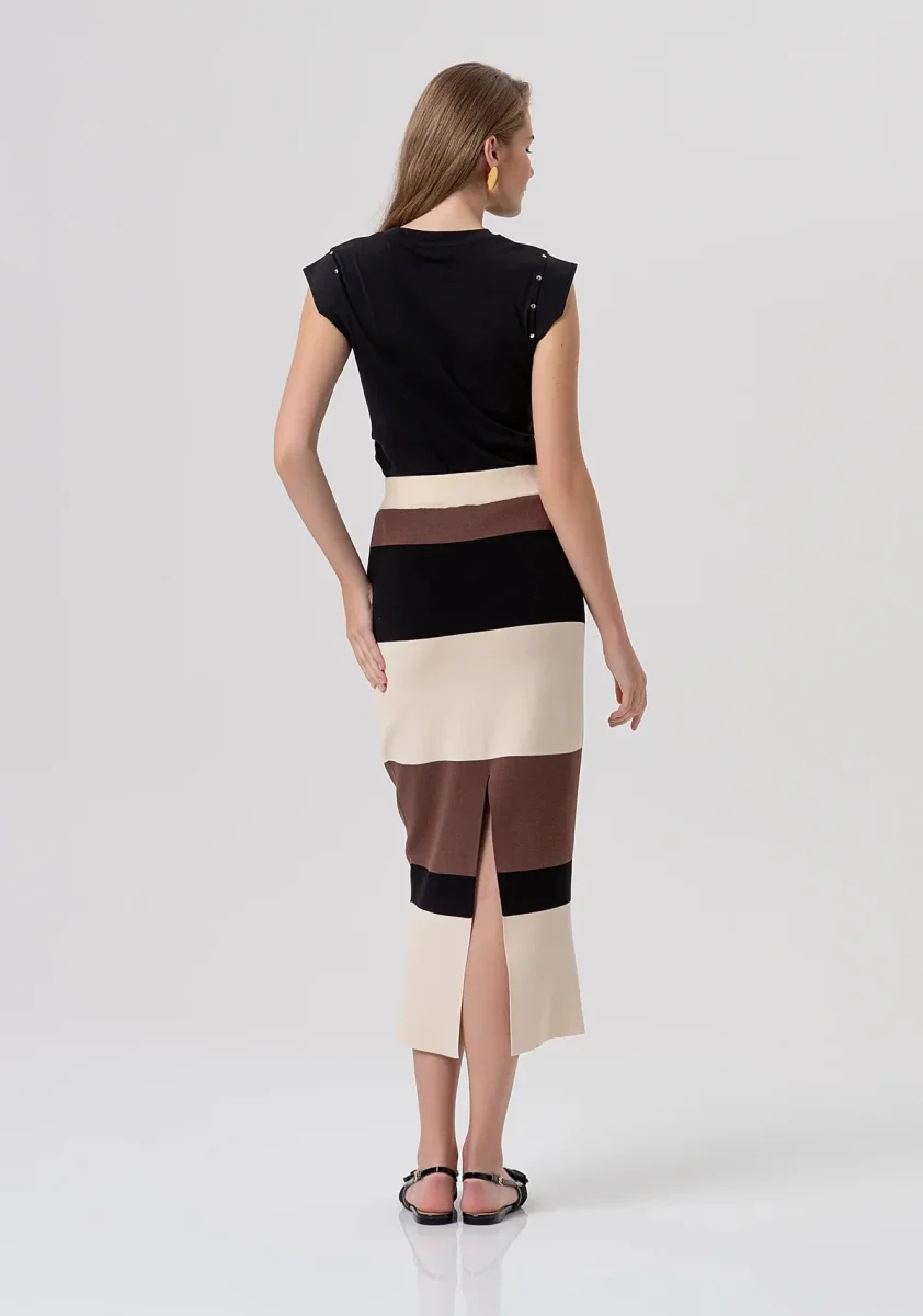 Gonna slim midi in maglia a righe, vita regolare, e con spacco sul retro.