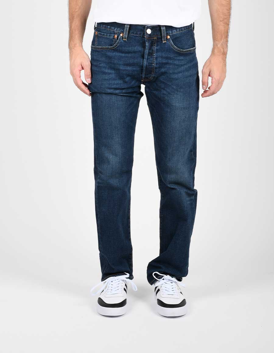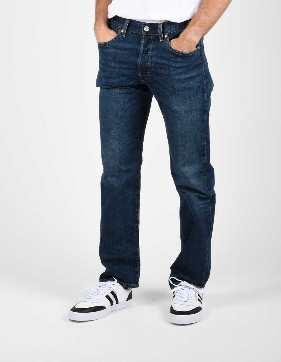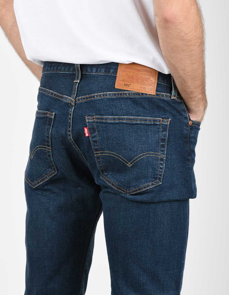 Jeans lavaggio scuro con leggere schiariture e cuciture a contrasto. Modello 501 original. Realizzato in tessuto elasticizzato. Lunghezza “32. Materiale: 94% cotone 5% poliestere 1% elastane