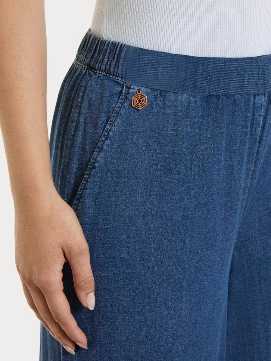 Jeans da donna cropped wide, con gamba ampia fino alla caviglia, caratterizzato da un finish scintillante uniforme su Questo modello è realizzato con vita piatta elasticizzata e comode tasche laterali alla francese, pensate per aggiungere praticità nella quotidianità.