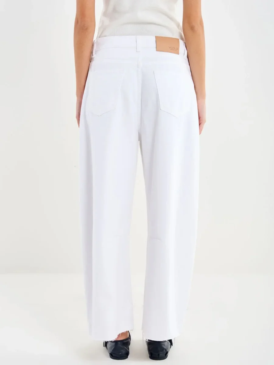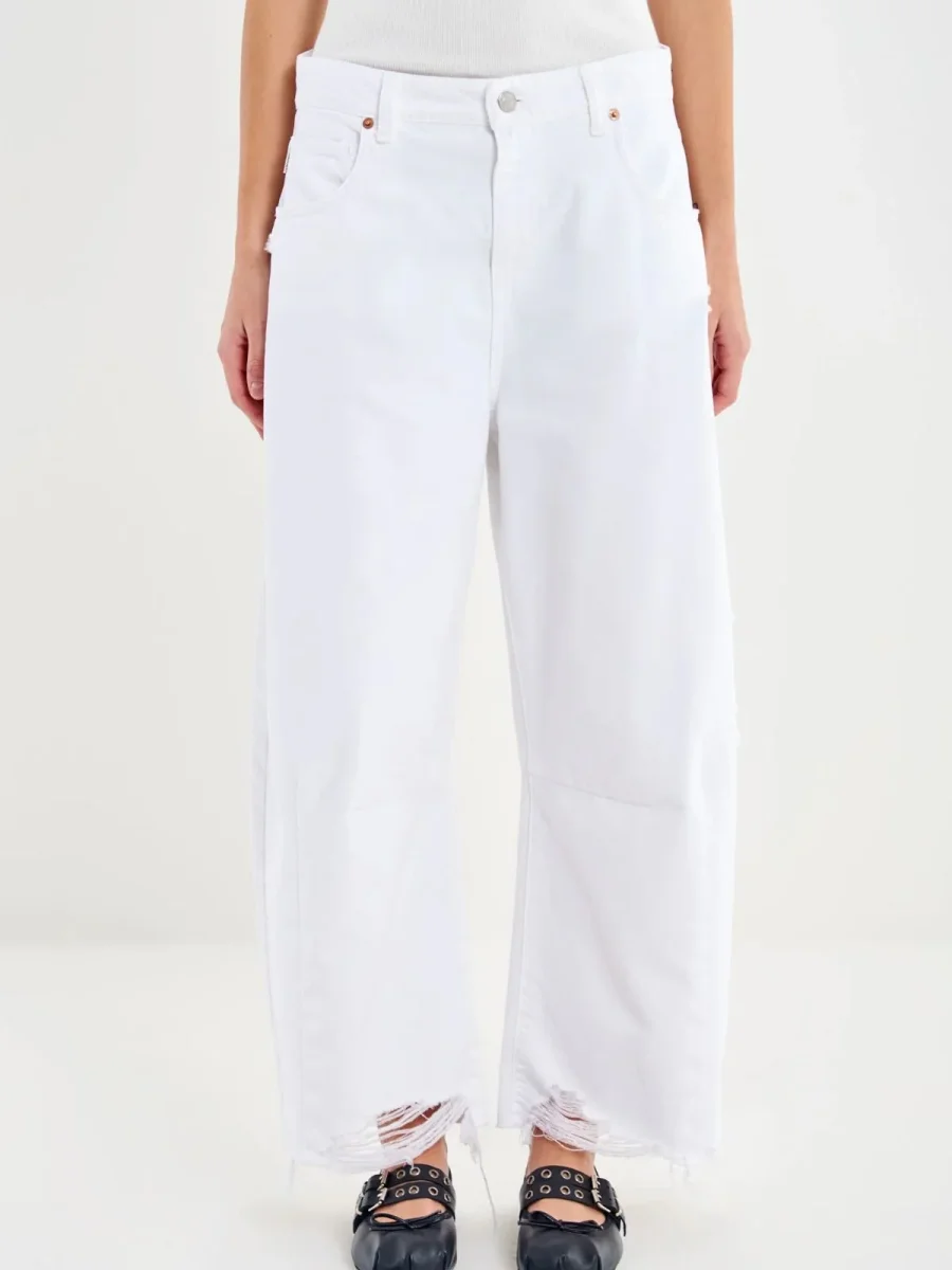 DAB5083 Jeans vita media a ovetto, barrel fit. Denim bianco. Dettaglio fondo a taglio vivo con rotture.
