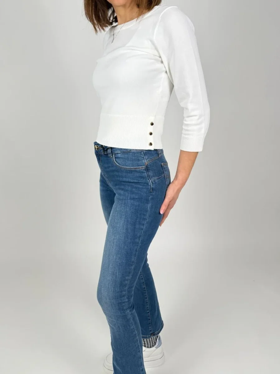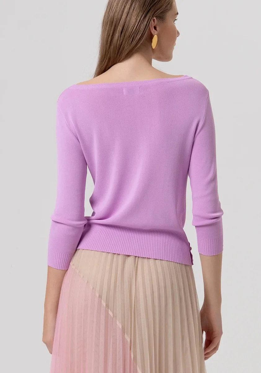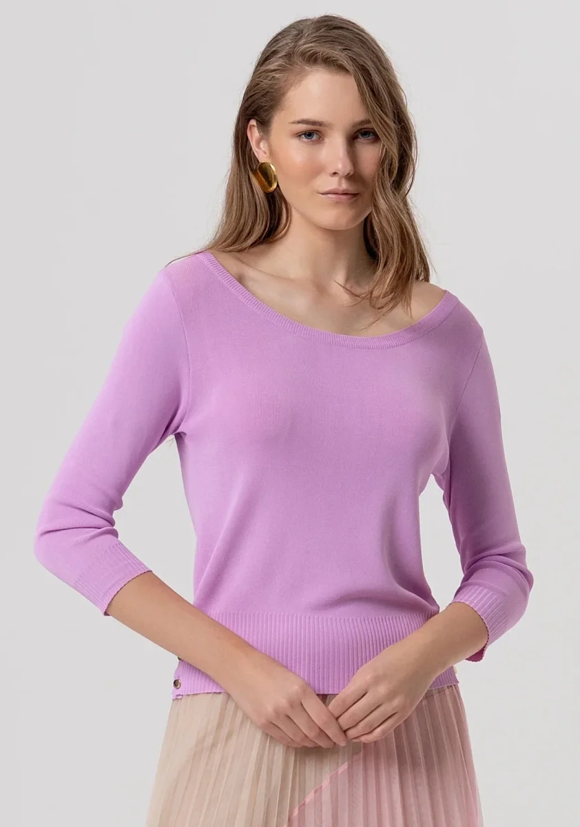 Maglia slim con scollo a barca, maniche a 3/4, e con bottoncini sul fondo.
