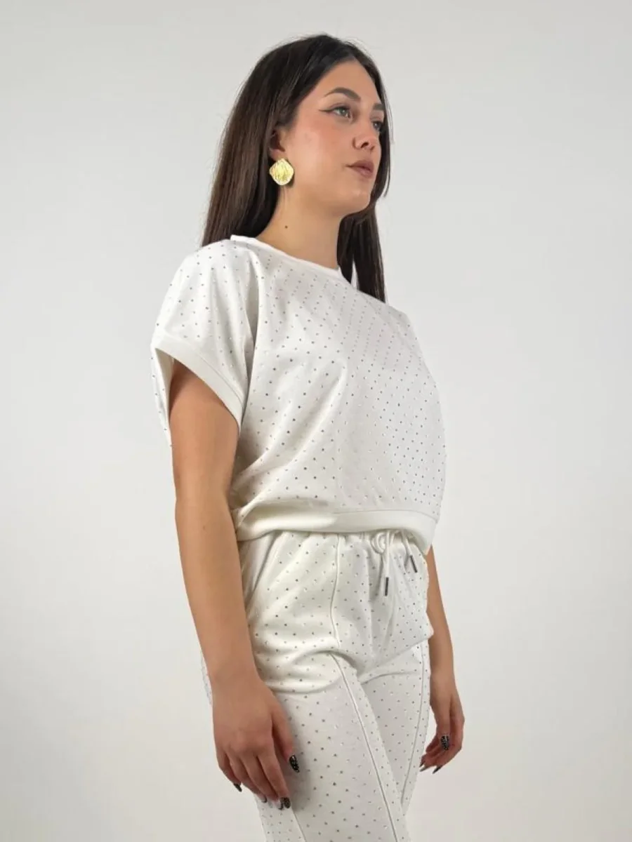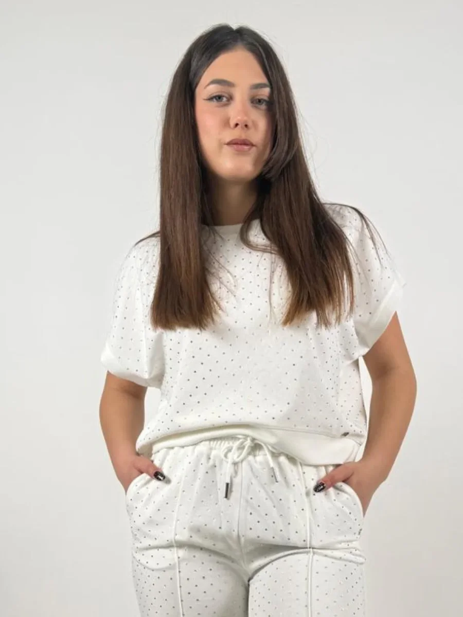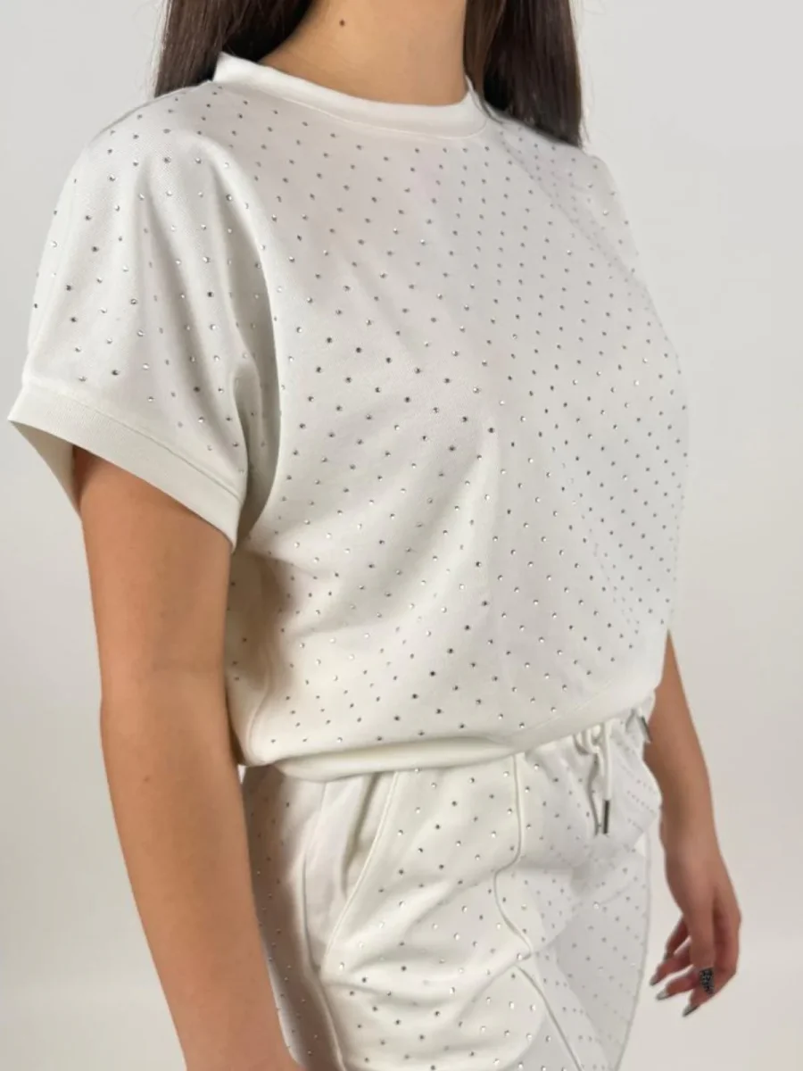 Scegli la t-shirt girocollo in scuba di misto cotone elasticizzato con strass all over. Un capo morbido e raffinato per un look casual brillante.