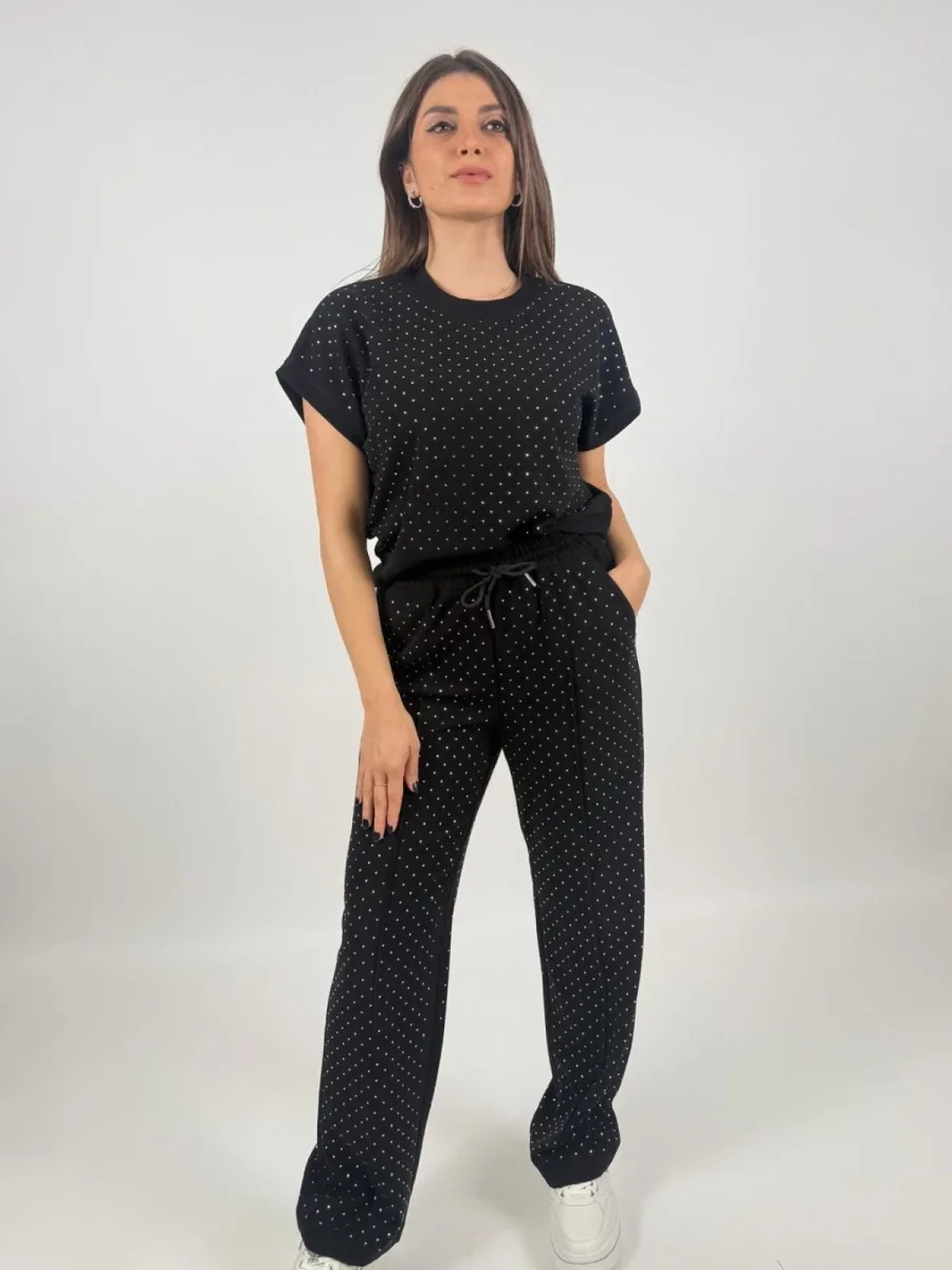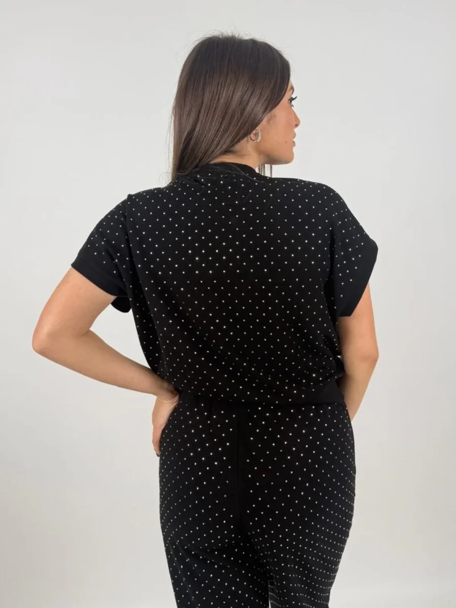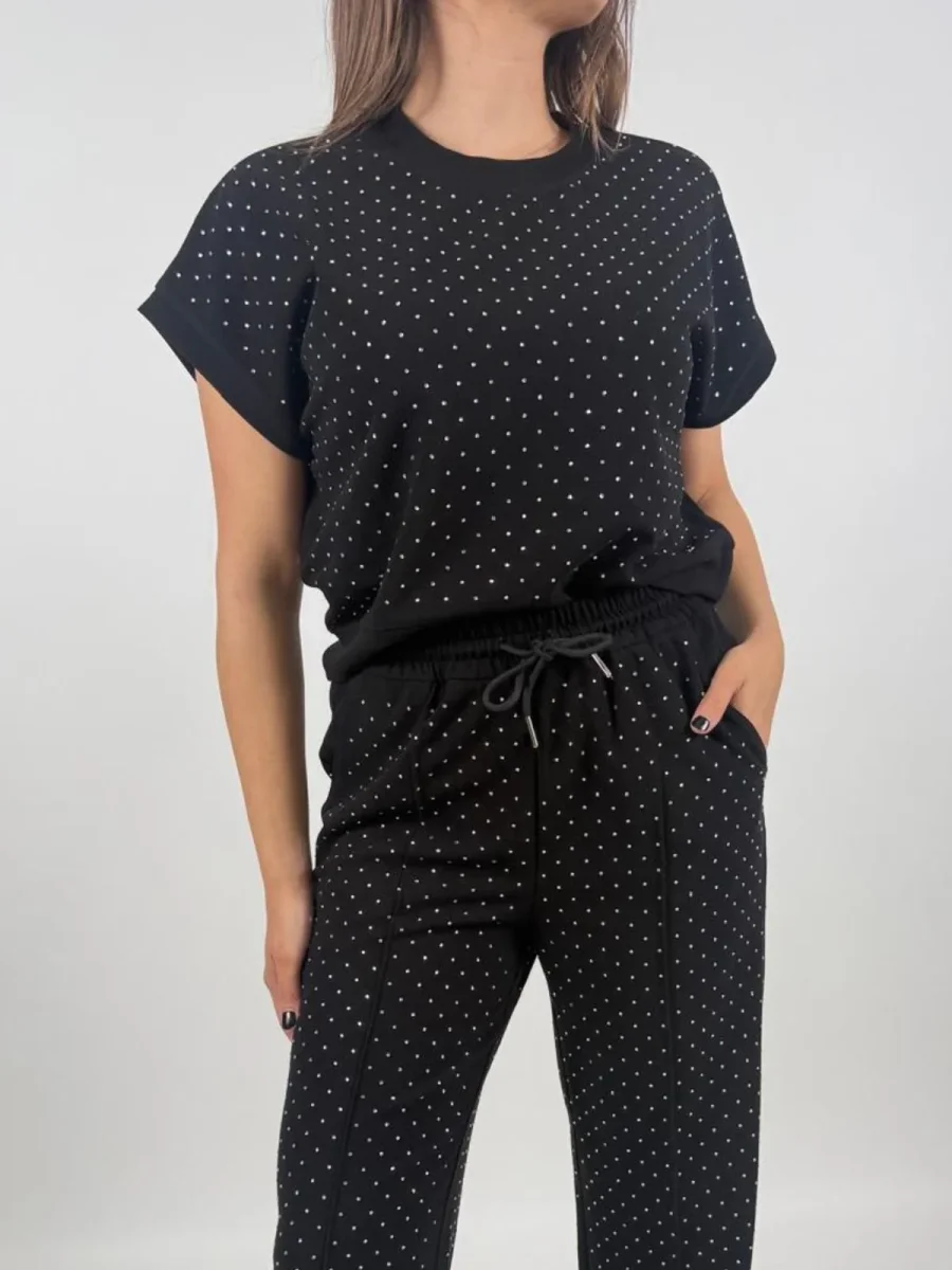 Scegli la t-shirt girocollo in scuba di misto cotone elasticizzato con strass all over. Un capo morbido e raffinato per un look casual brillante.