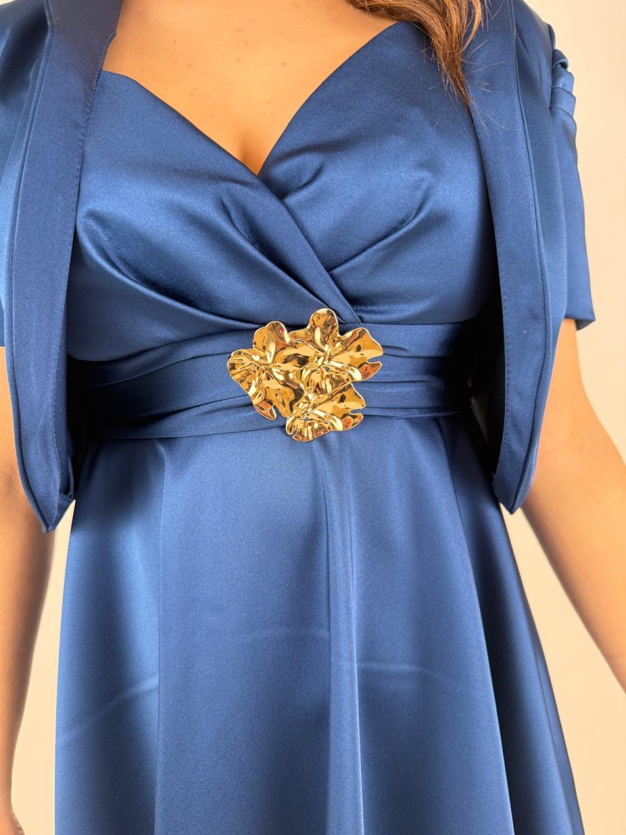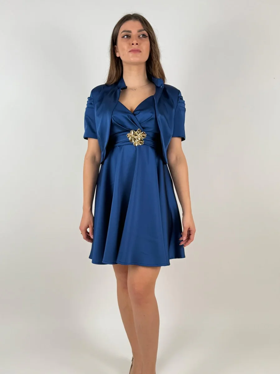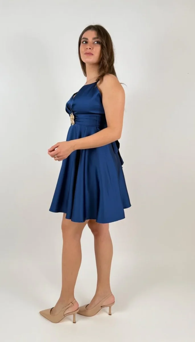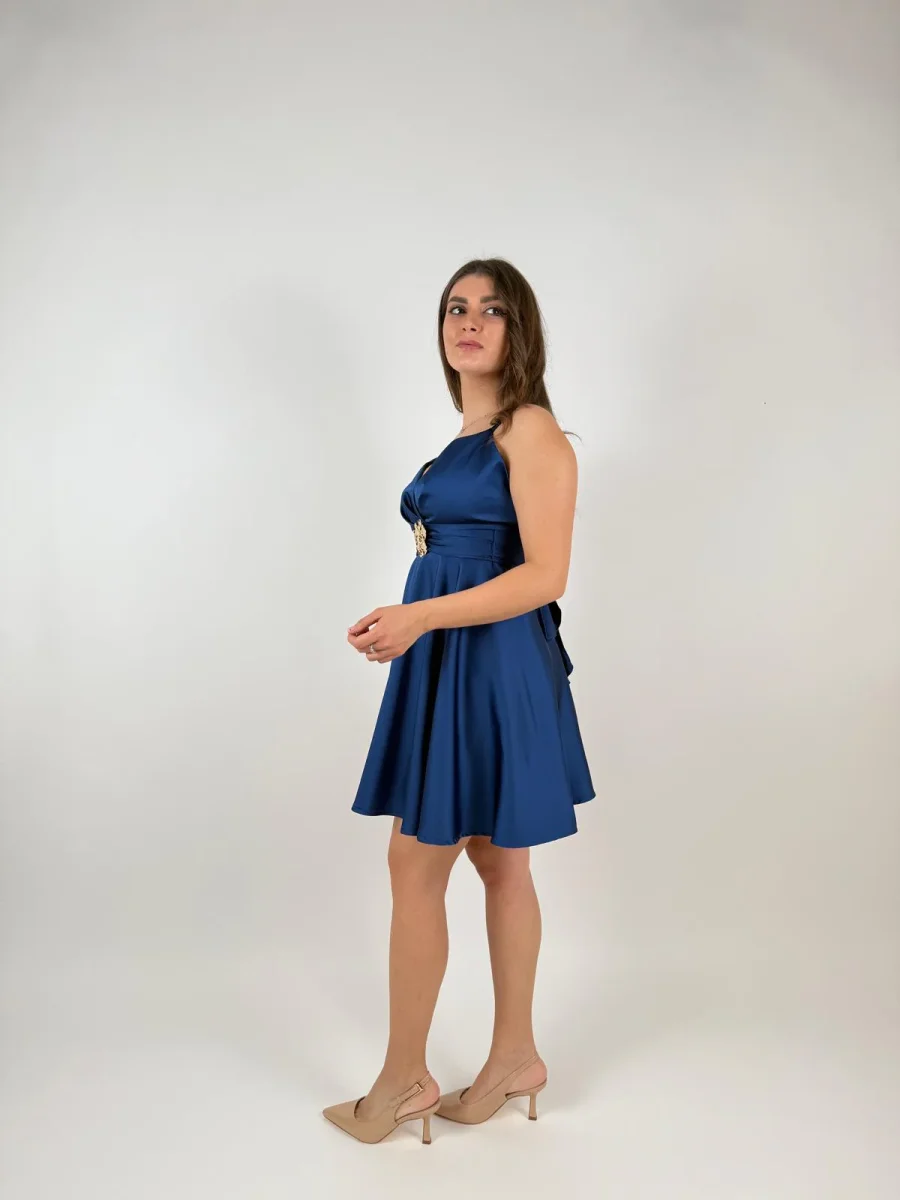 Miniabito in raso lucido dalla vestibilità svasata che esalta il punto vita. Body drappeggiato con scollo a cuore, impreziosito da maxi applicazione gioiello e fiocco sulla schiena. Perfetto per cerimonie, cocktail e serate.