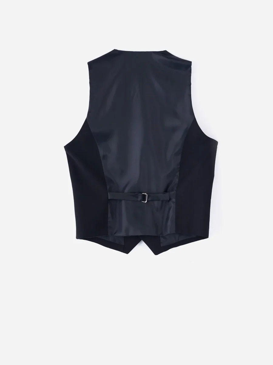 Gilet da completo realizzato in poliviscosa. Retro fodera tinta unita con fibbia regolabile.