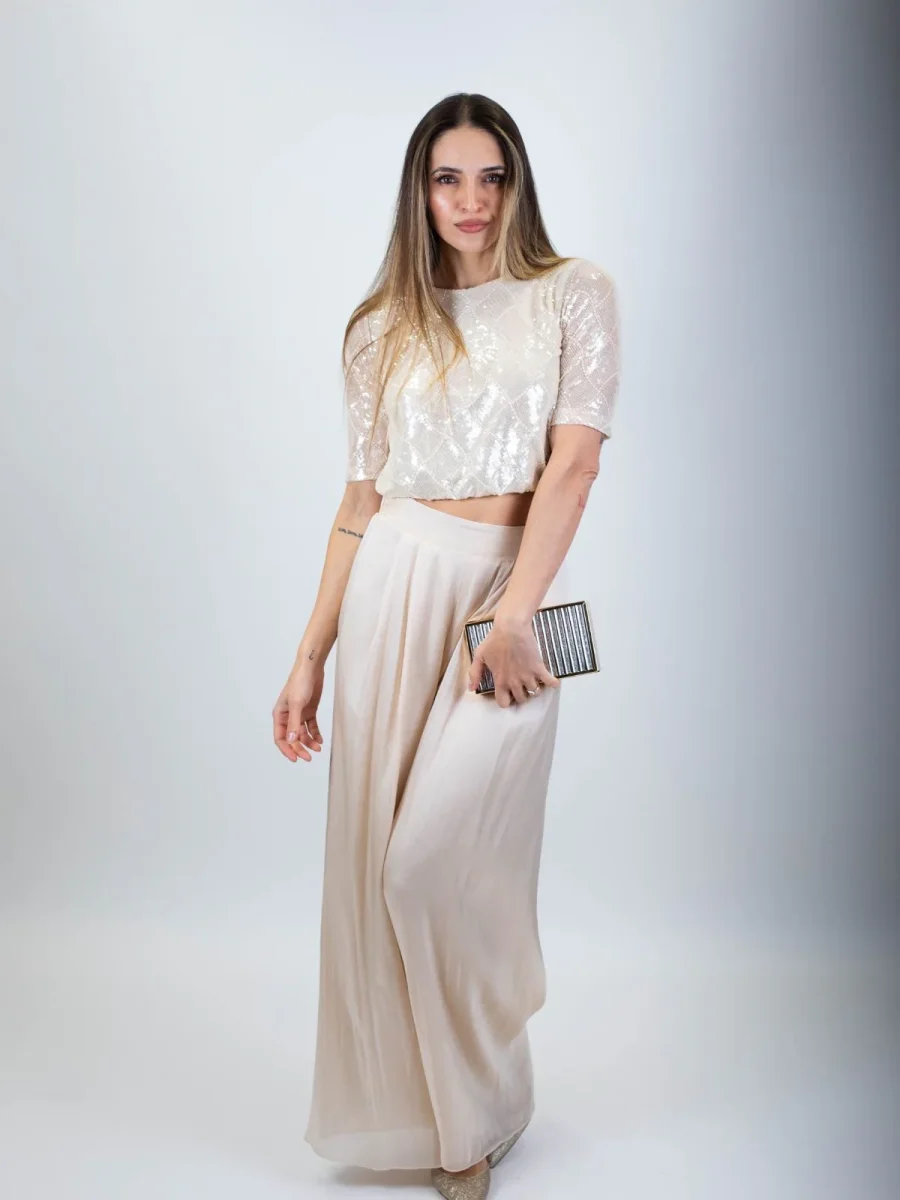 Pantalone elegante da donna dal taglio palazzo, caratterizzato da una linea ampia e fluida che slancia la figura e dona un’eleganza naturale al movimento. Realizzato in tessuto liscio e strutturato, assicura comfort e una vestibilità impeccabile per tutta la giornata. La vita alta valorizza il punto vita e contribuisce a creare una silhouette armoniosa e femminile, mentre la gamba dritta e ampia scende morbida fino al fondo, garantendo un effetto raffinato e contemporaneo. Il design essenziale, privo di dettagli superflui, esalta la pulizia delle linee e rende il capo estremamente versatile. Un pantalone pensato per una donna che ama uno stile femminile, elegante e senza tempo, adatto a occasioni speciali, cerimonie o look da giorno ricercati.