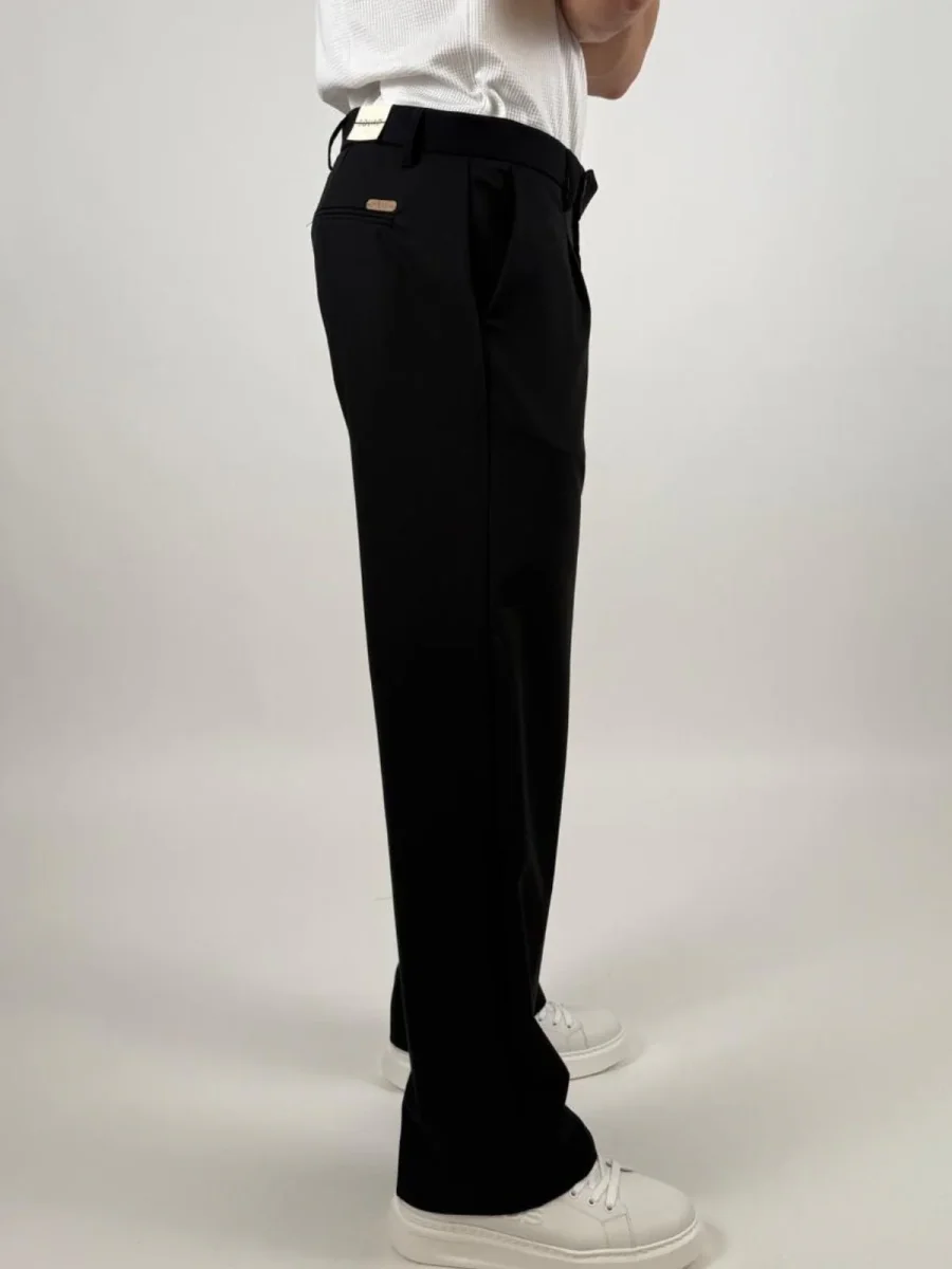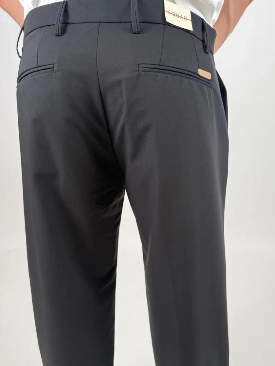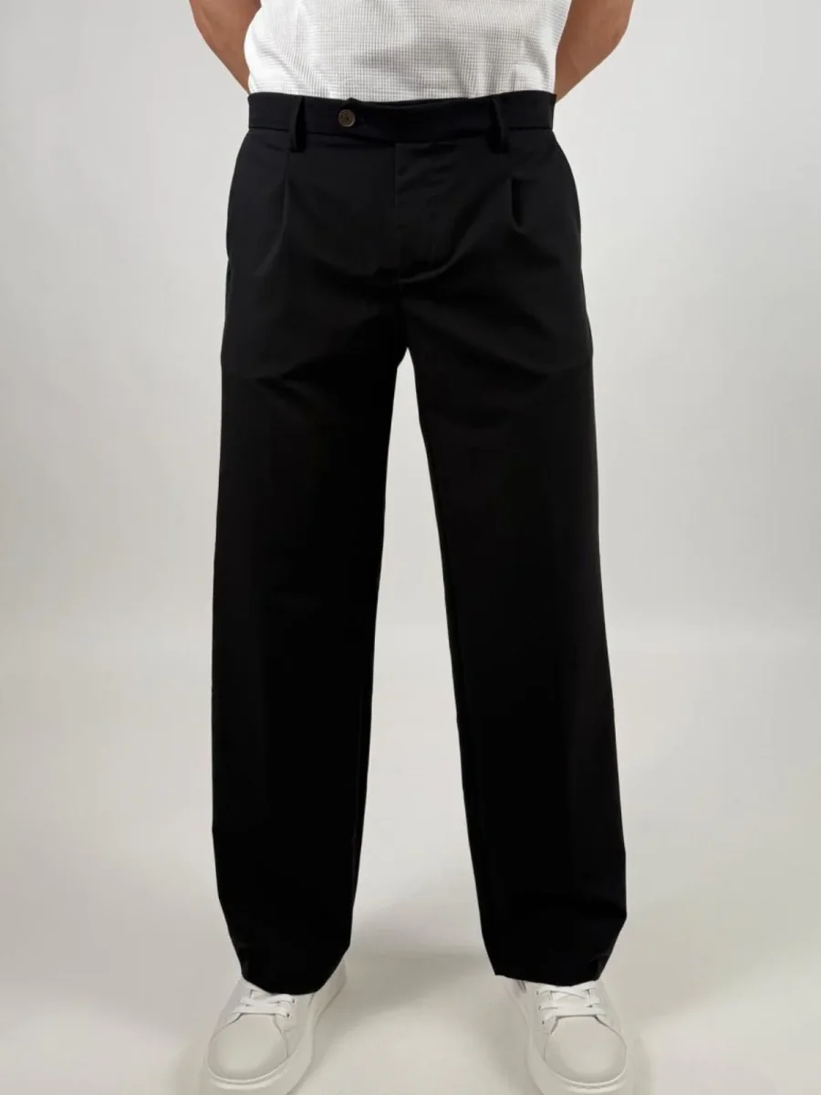Pantalone Genny226015 da uomo in tessuto di poliviscosa stretch, modello chino baggy fit, con chiusura zip, bottoni e gancetto a slitta, pinces e mini etichetta logo applicata sopra una delle due tasche a filo posteriori