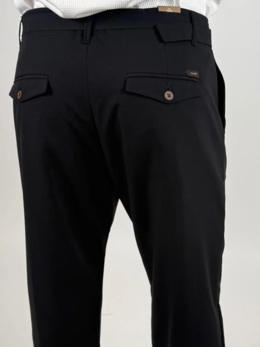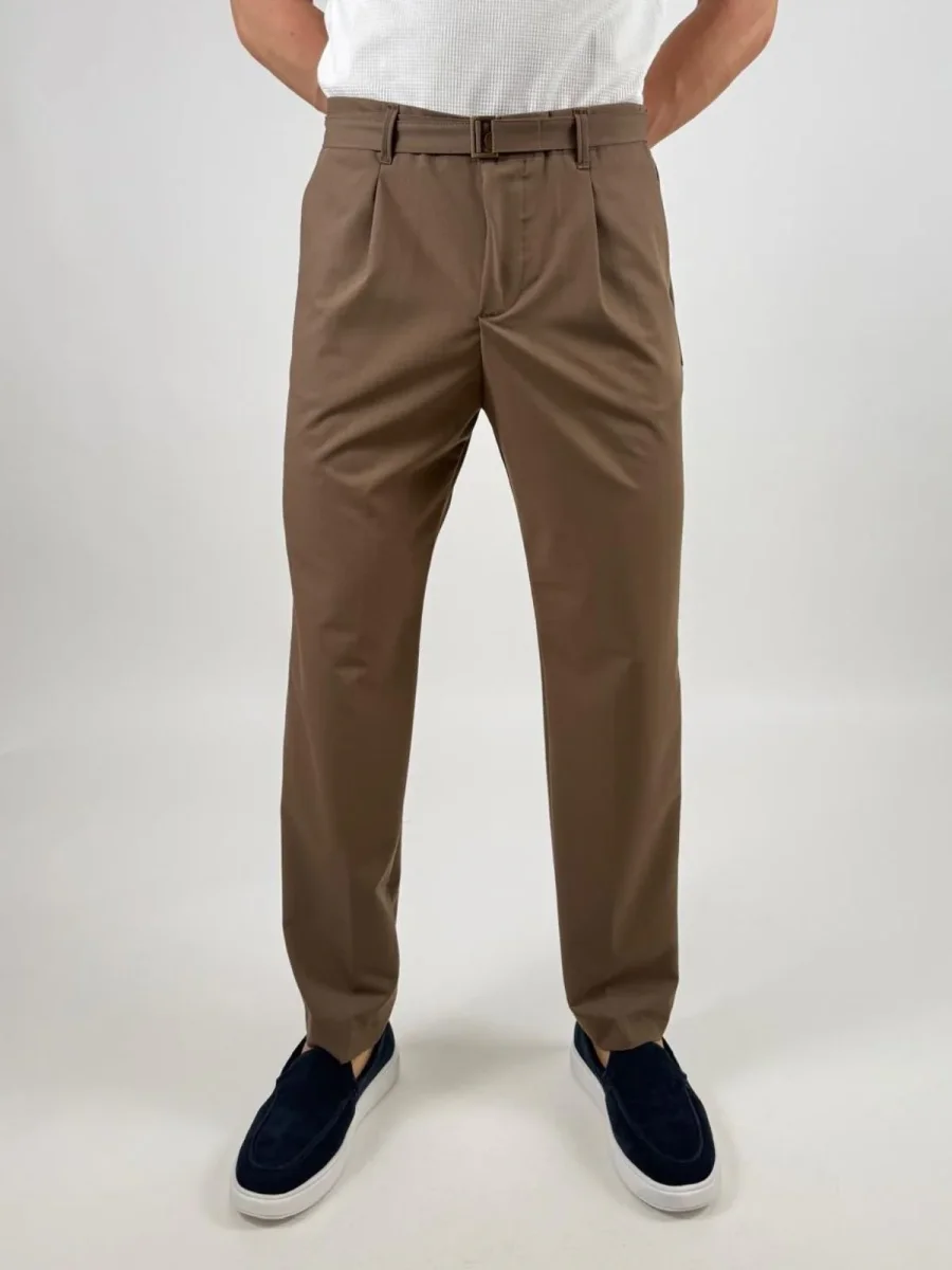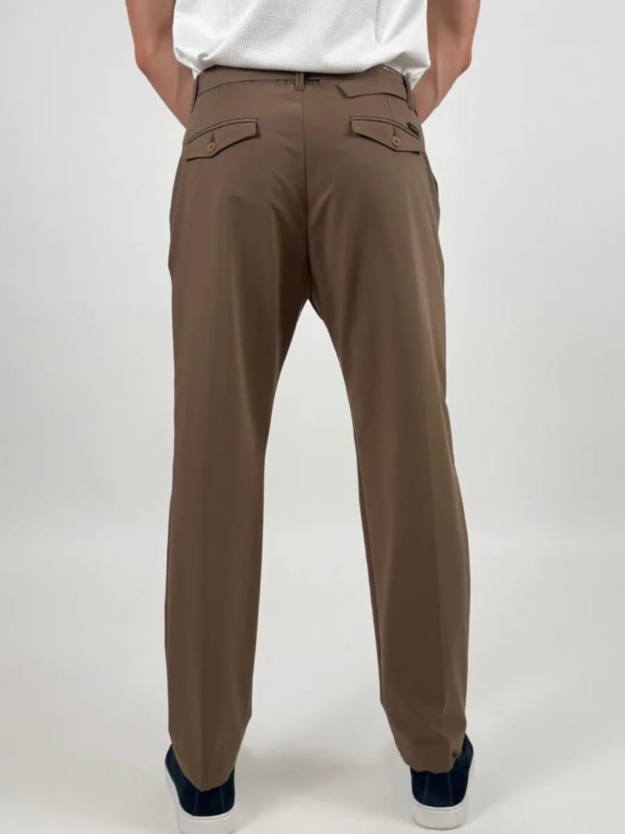 Pantalone Fabio226051 uomo dal taglio elegante e contemporaneo, caratterizzato da una linea pulita e da una vestibilità confortevole. Il modello presenta chiusura con zip e bottone, passanti in vita per cintura e tasche laterali. Sul retro sono presenti tasche a filetto con pattina e bottone che aggiungono un dettaglio raffinato. La presenza di pinces frontali dona maggiore ampiezza e libertà di movimento, mantenendo al tempo stesso una silhouette ordinata.