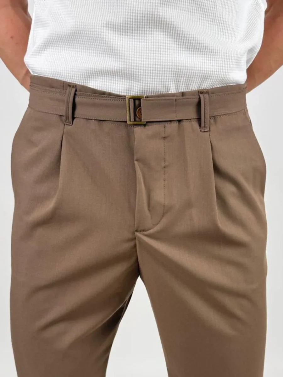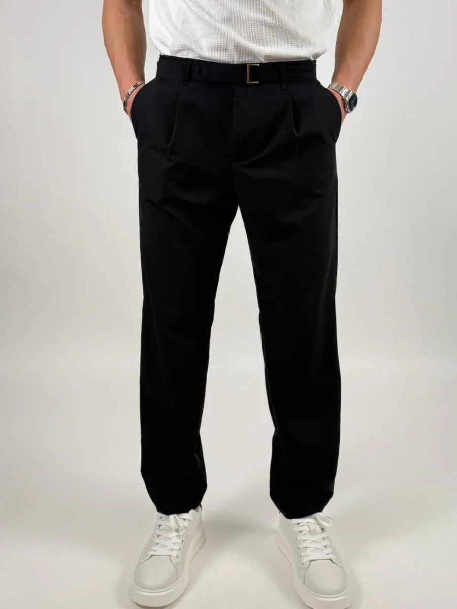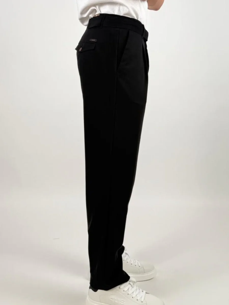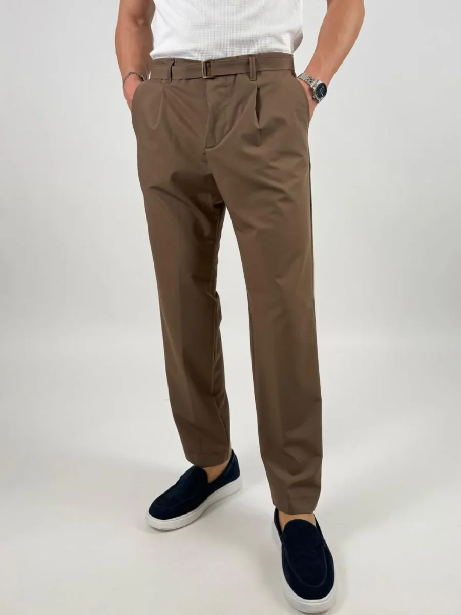 Pantalone Fabio226051 uomo dal taglio elegante e contemporaneo, caratterizzato da una linea pulita e da una vestibilità confortevole. Il modello presenta chiusura con zip e bottone, passanti in vita per cintura e tasche laterali. Sul retro sono presenti tasche a filetto con pattina e bottone che aggiungono un dettaglio raffinato. La presenza di pinces frontali dona maggiore ampiezza e libertà di movimento, mantenendo al tempo stesso una silhouette ordinata.