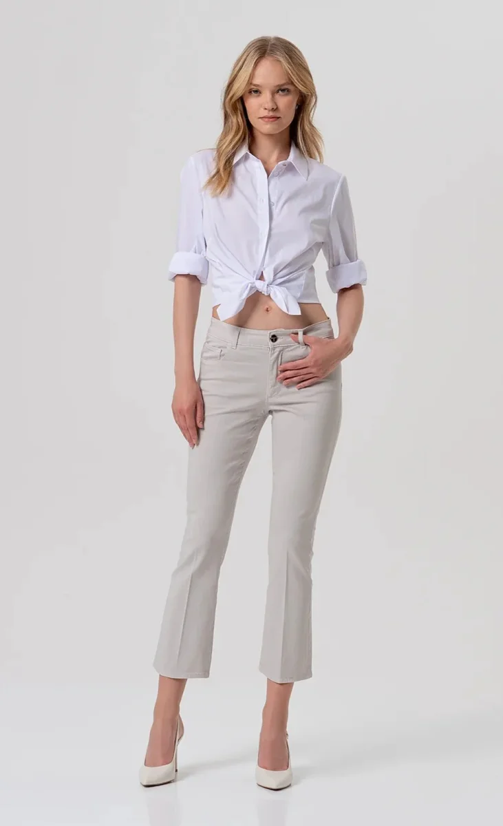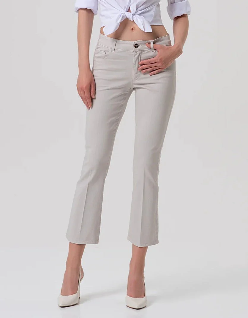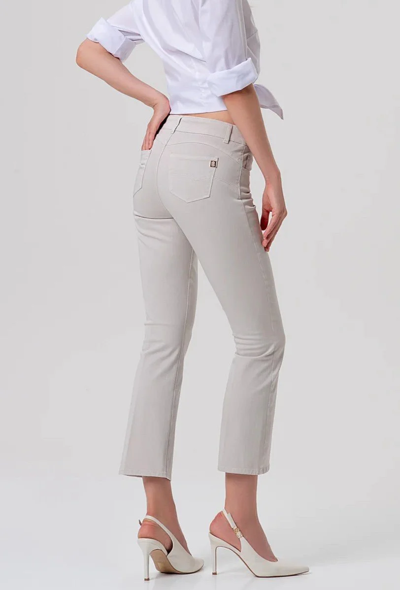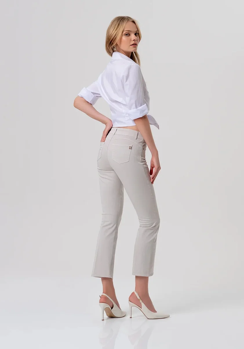 Pantalone cropped effetto push up in gabardina, vita regolare, 5 tasche, e con fondo ampio.