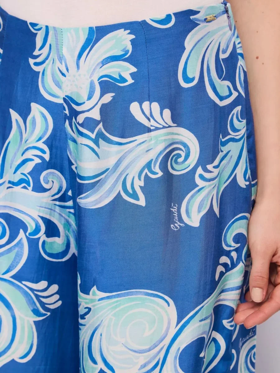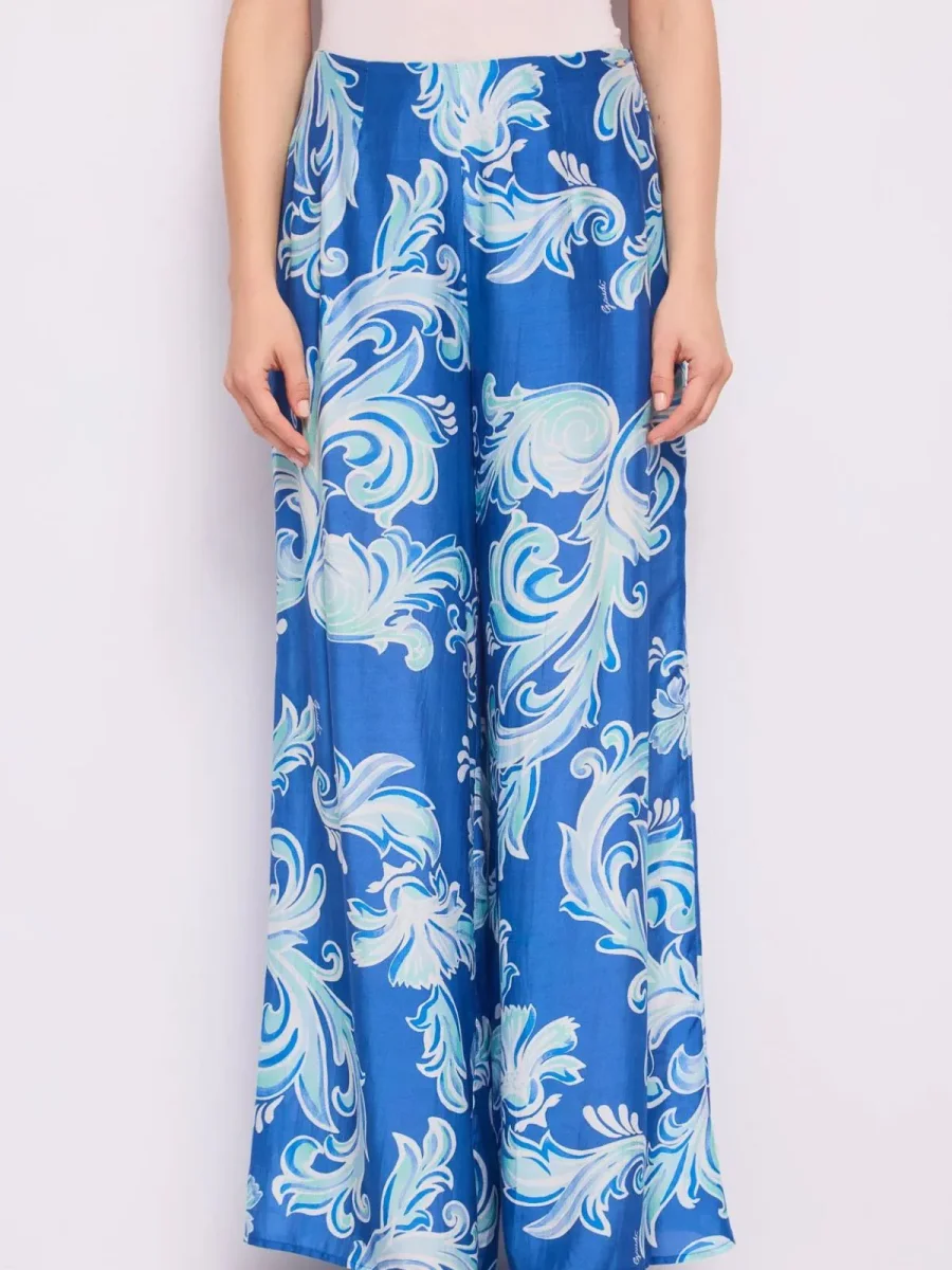 Scegli i pantaloni in voile con stampa, logo in metallo e zip invisibile sul fianco. Linea fluida per un look leggero che vibra di energia estiva.