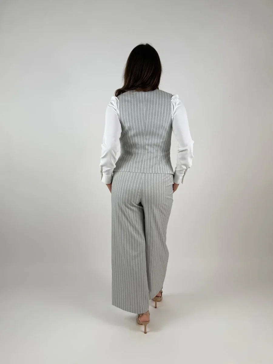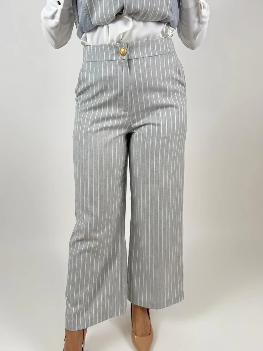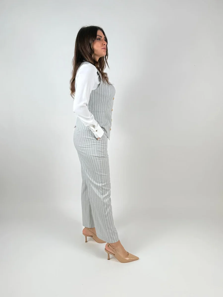 Il punto vita è valorizzato da una fascia strutturata con bottone gioiello dorato, dettaglio prezioso che dona luminosità e carattere al capo. La piega centrale lungo la gamba contribuisce a creare una silhouette ordinata e sofisticata.