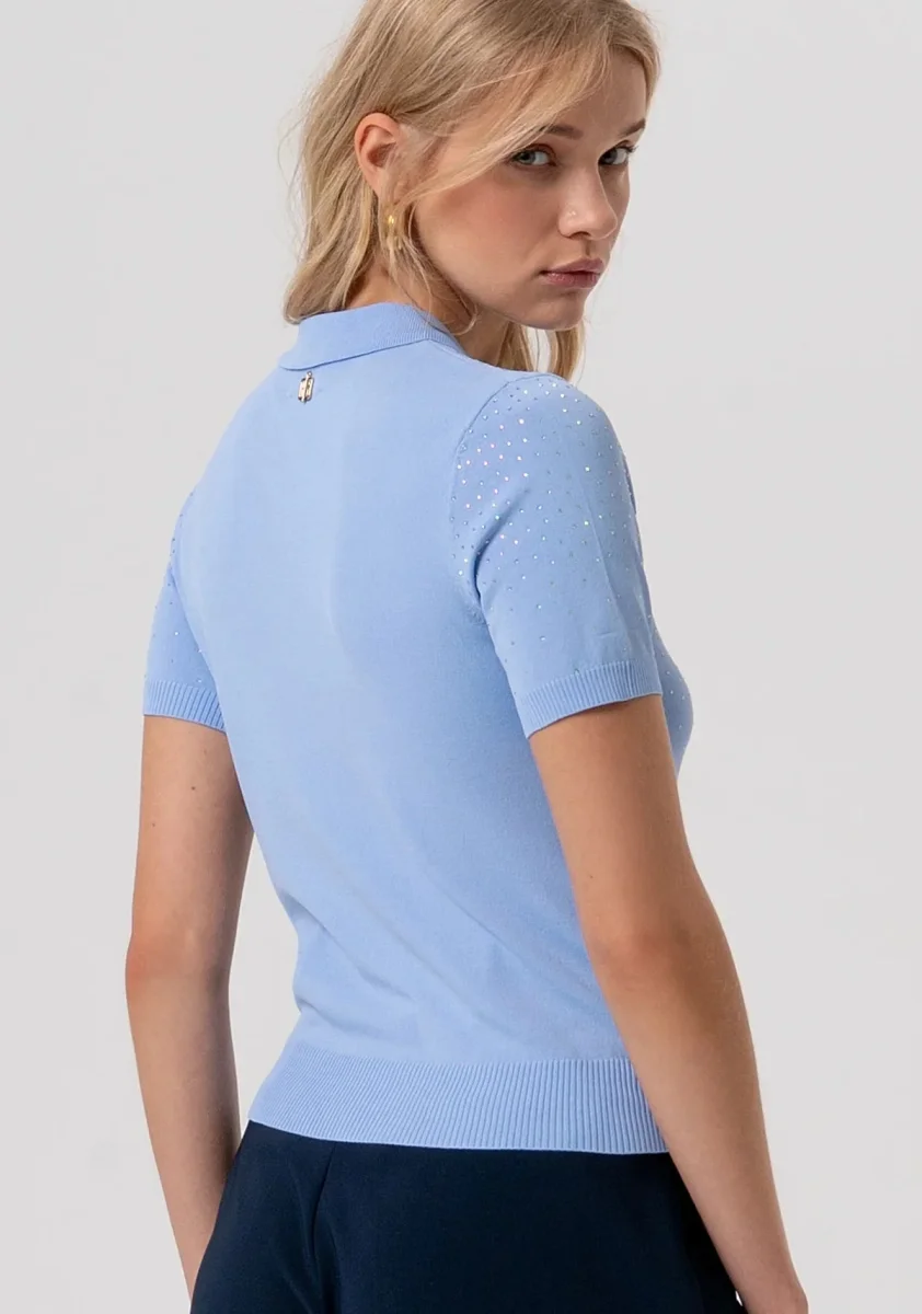 Polo slim in maglia con strass, colletto classico, bottoni, e con maniche corte.