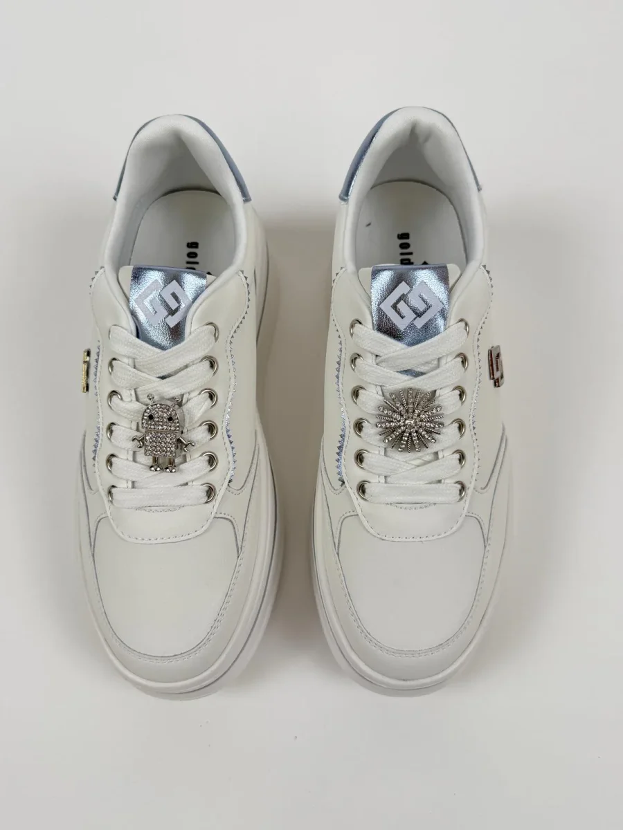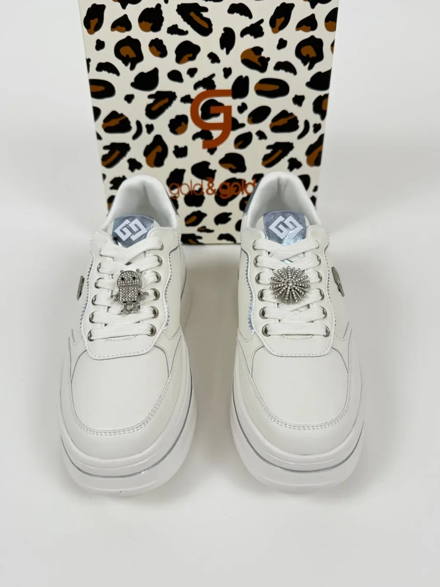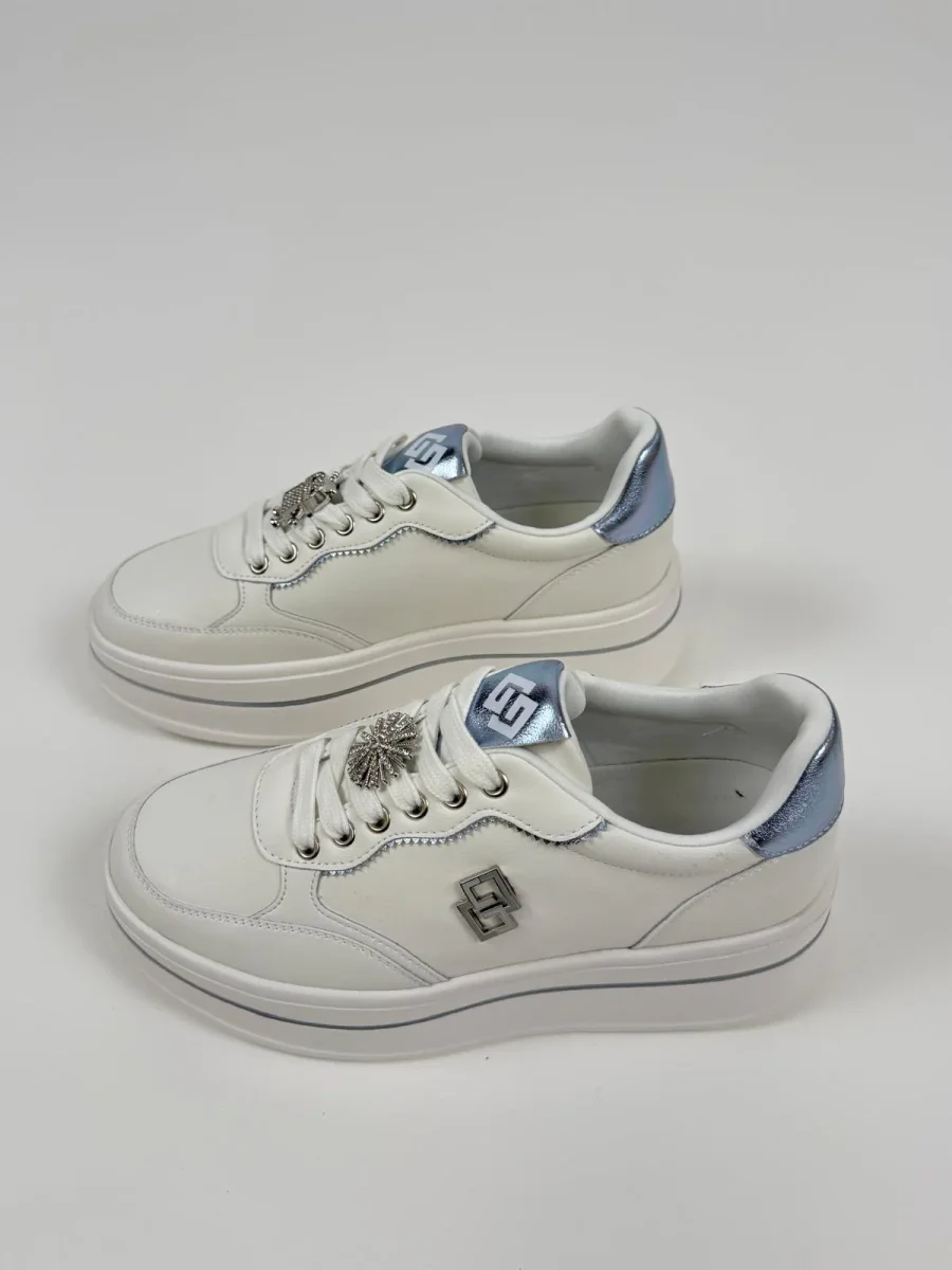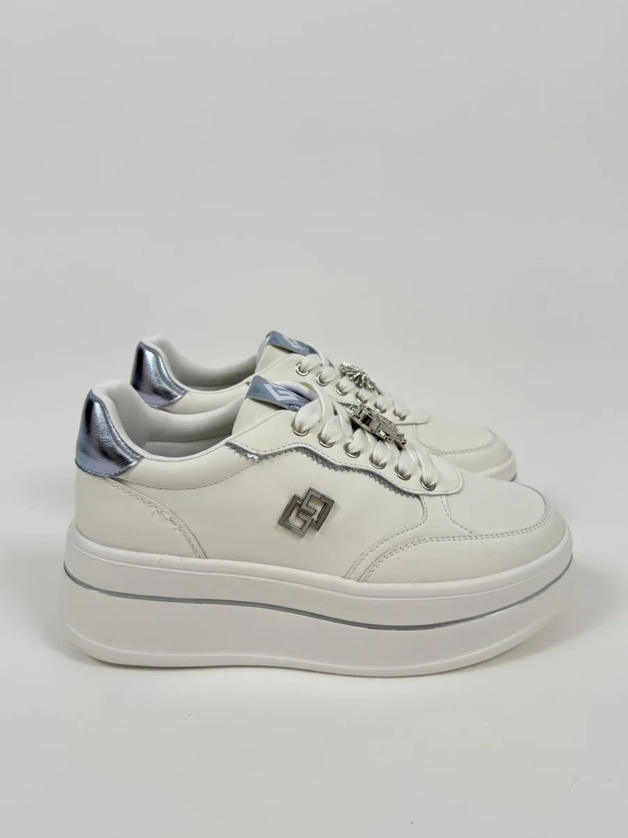 Sneaker platform in ecopelle bianca con dettagli argento metallizzato. Design moderno con logo laterale e suola alta che slancia la figura, ideale per un look casual-chic e urbano.