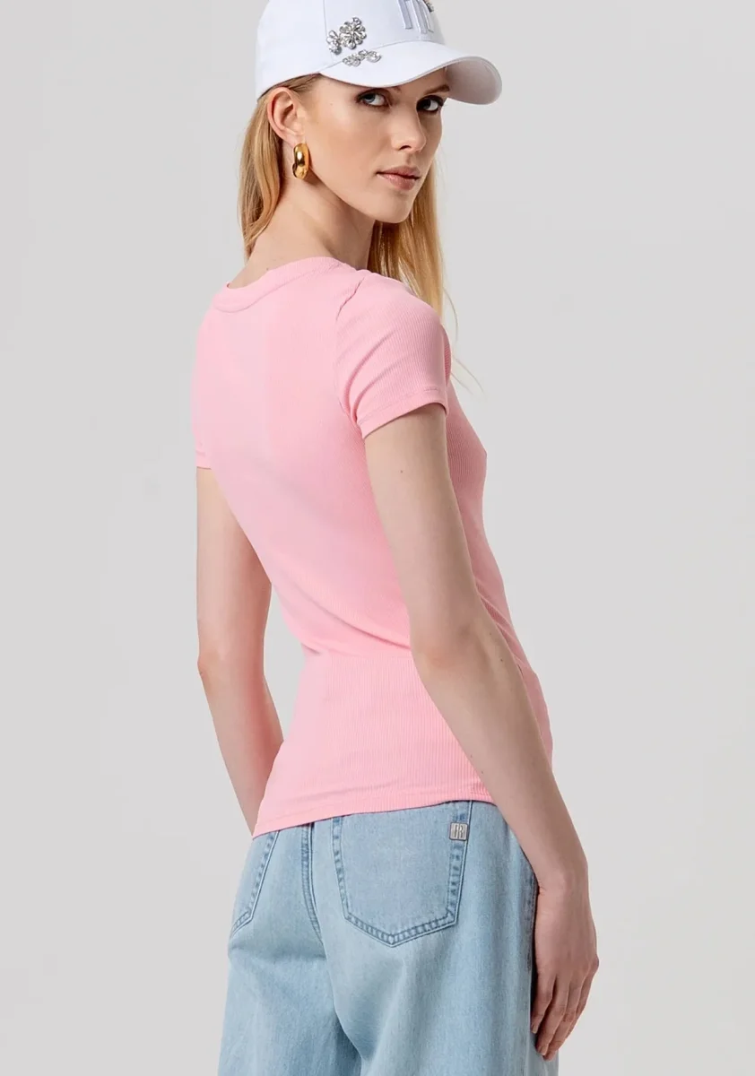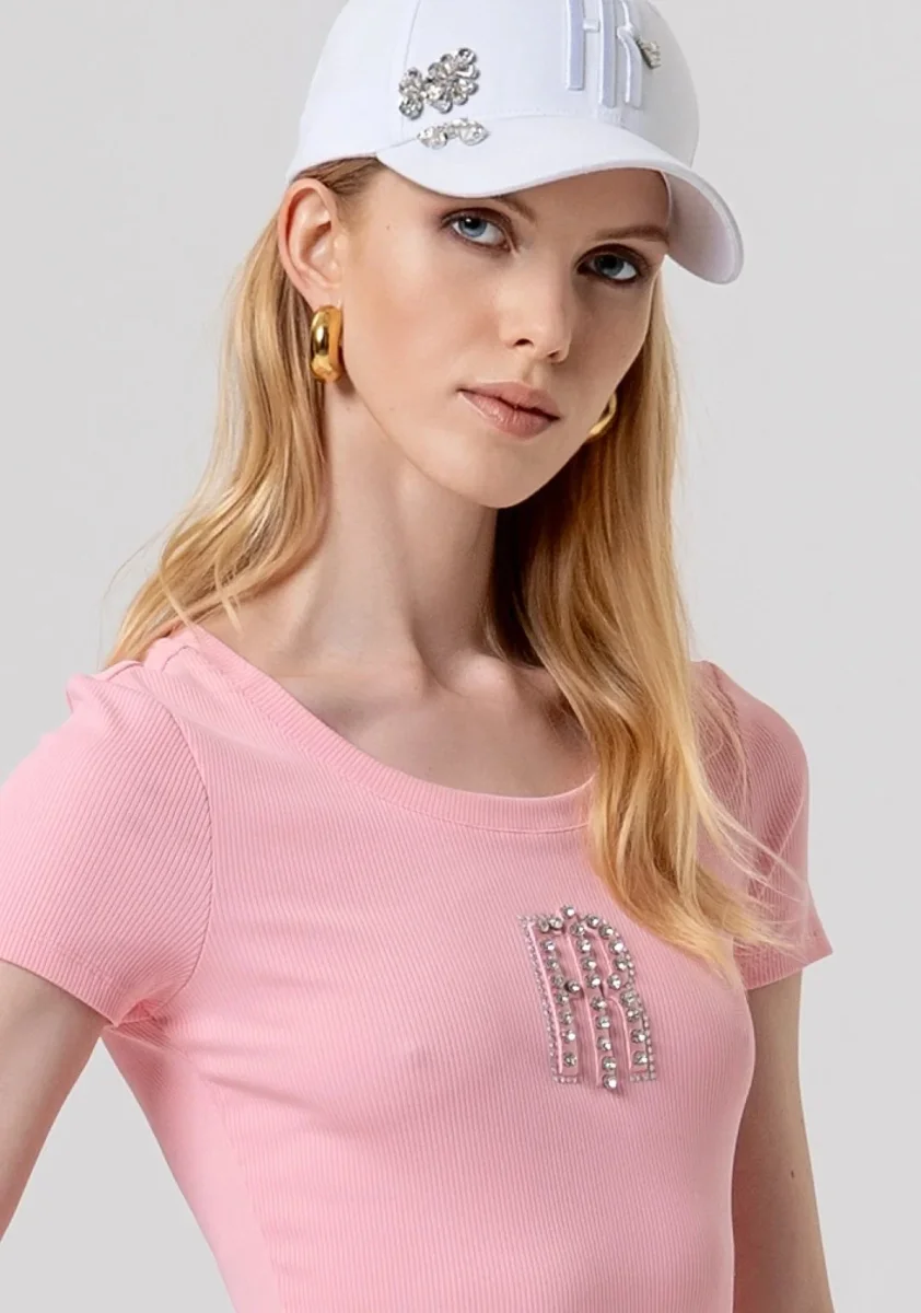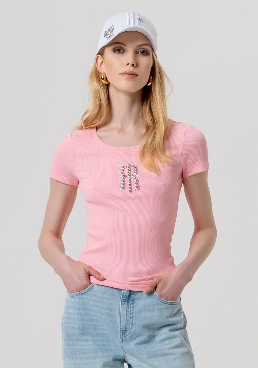 T-shirt slim a costine, girocollo, logo con pietre luminose, e con maniche corte.