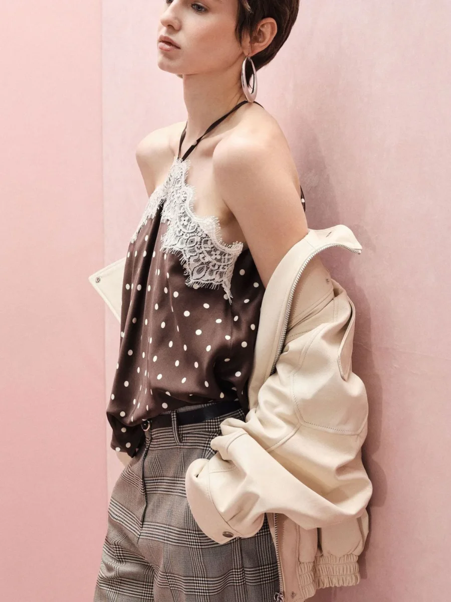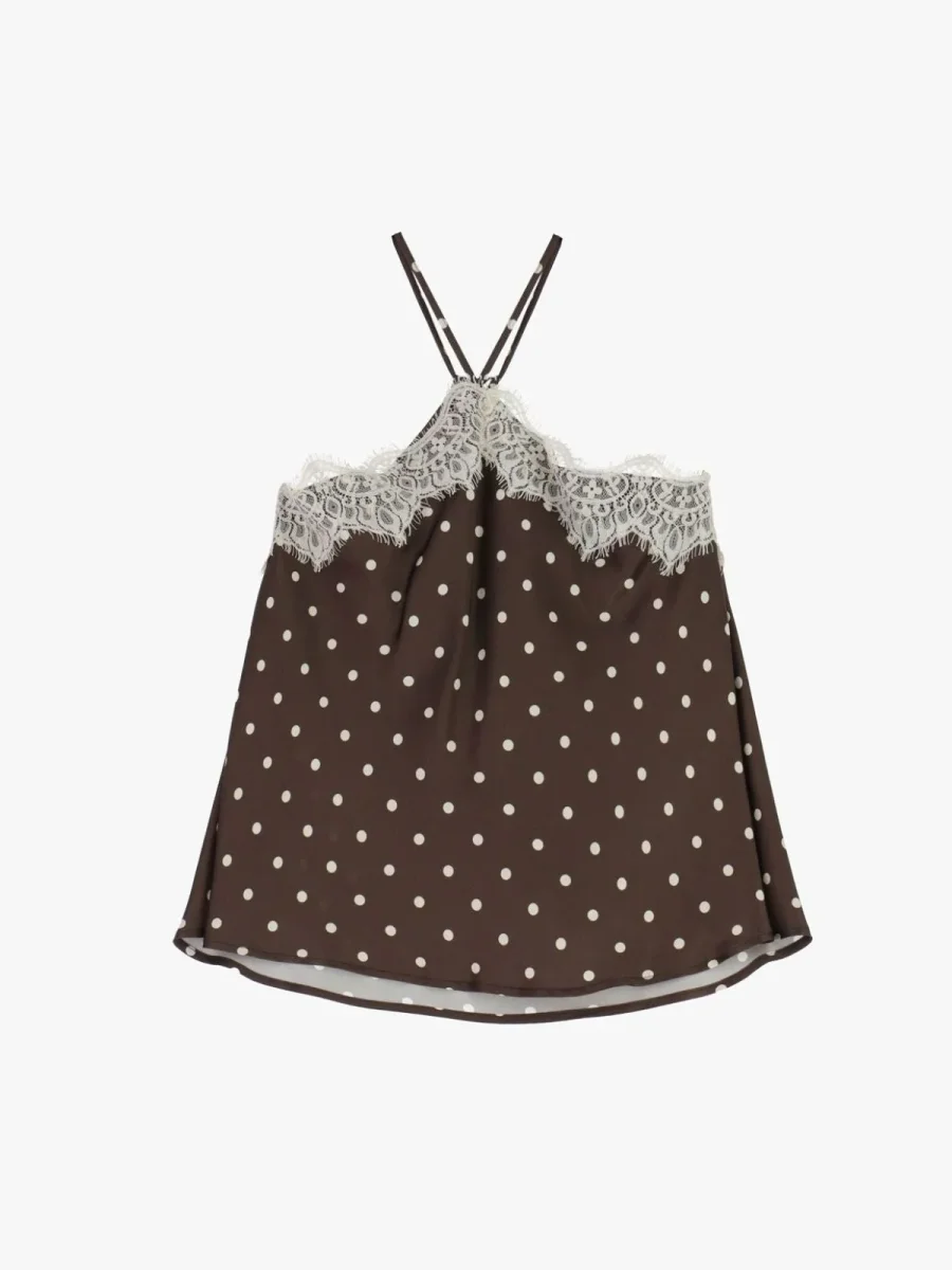 Top con spalline sottili e scollo all’americana, rifinito da delicati dettagli in pizzo lungo il bordo superiore. Il motivo a pois dona un tocco distintivo, perfetto per essere abbinato a pantaloni sartoriali per una proposta sofisticata e versatile. Ideale per esprimere uno stile contemporaneo e personale.