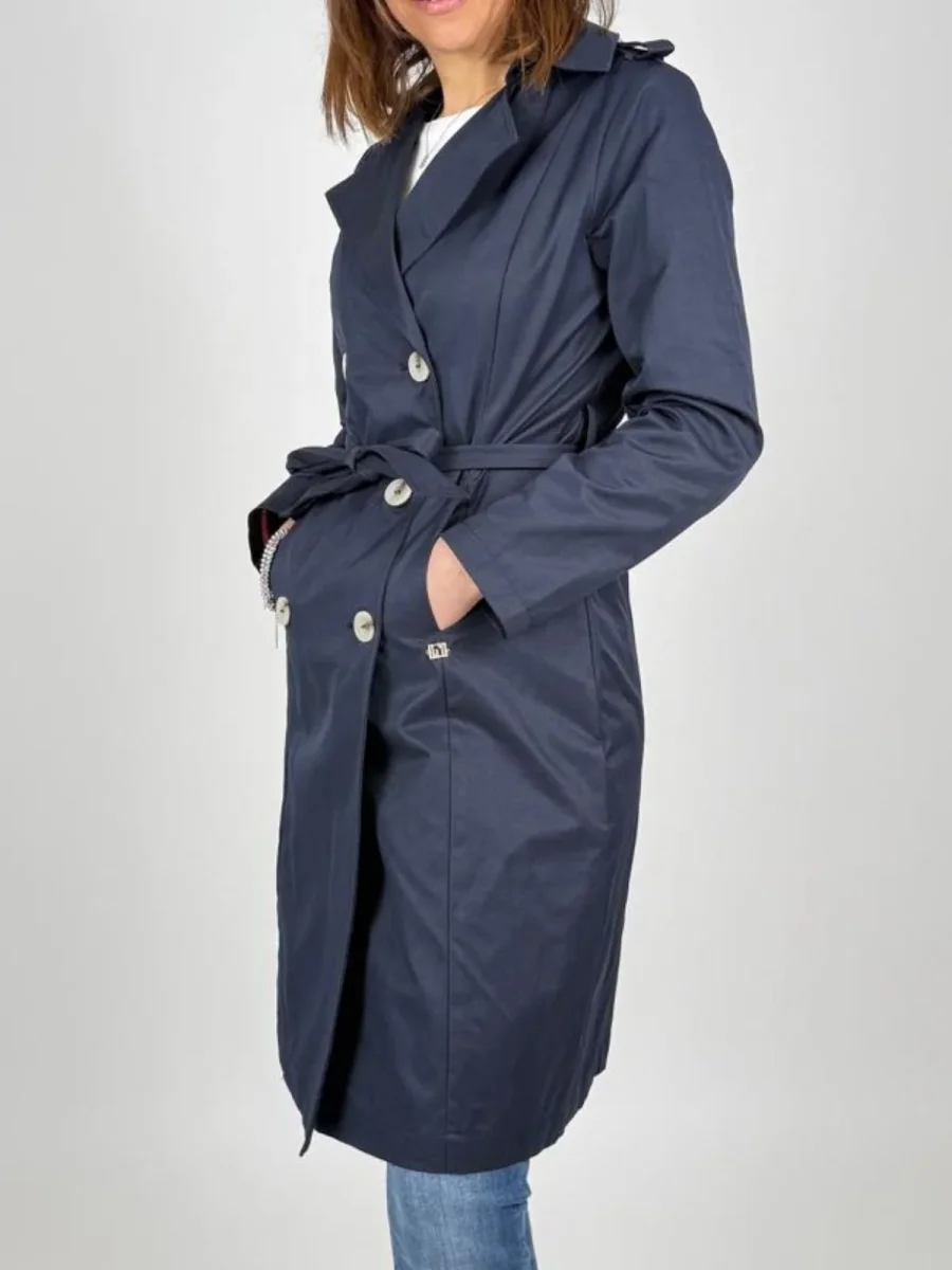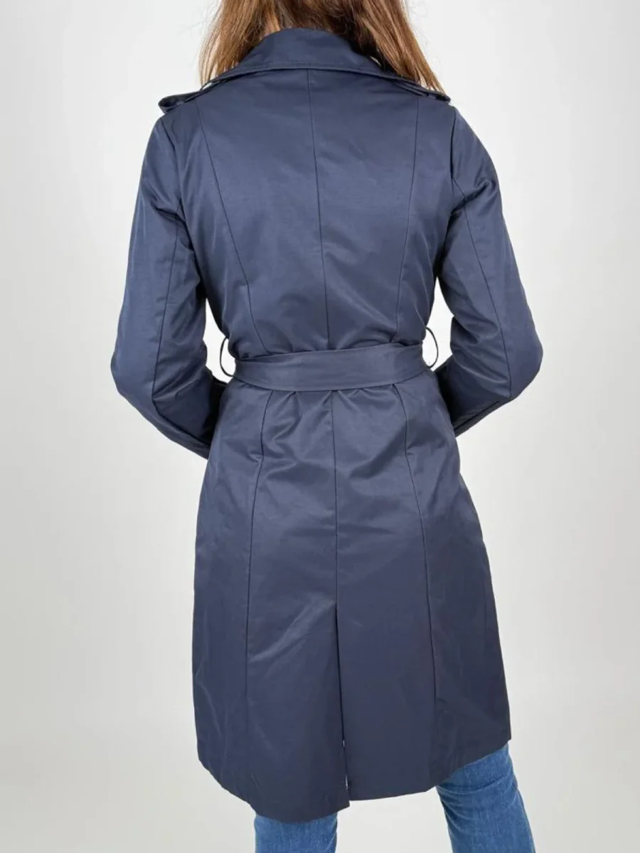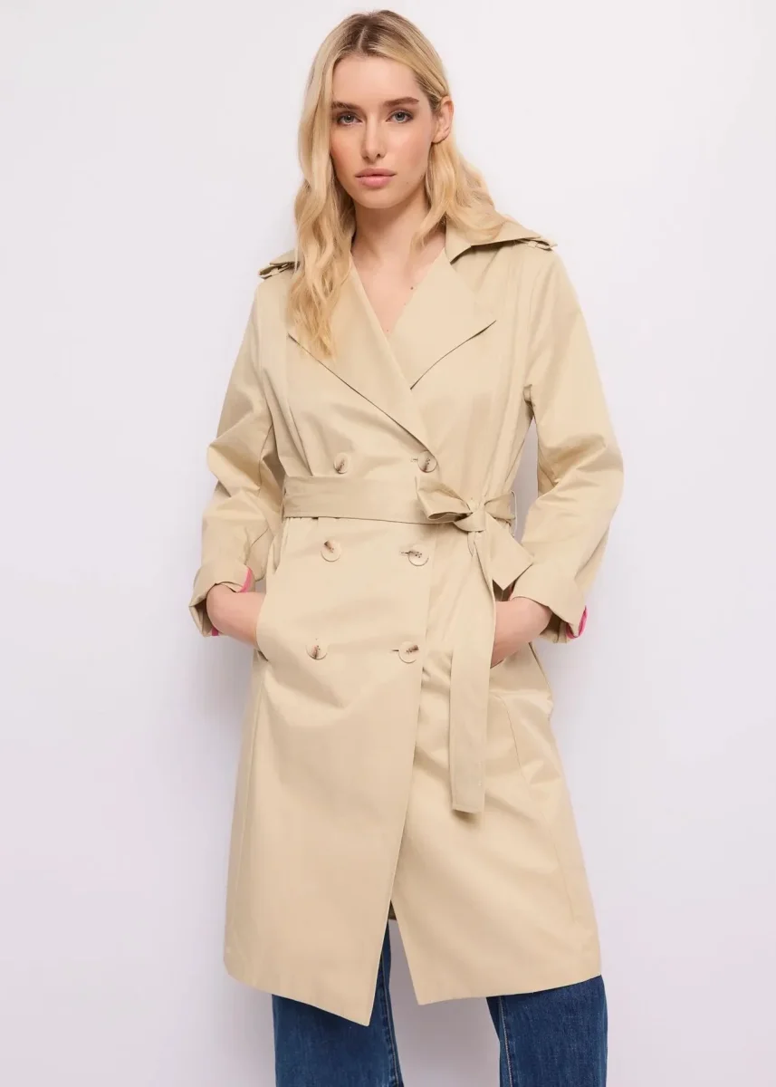 Scegli il trench doppiopetto antigoccia con collo a revers, tasche e cintura coordinata. Un must-have intramontabile del tuo guardaroba quotidiano.