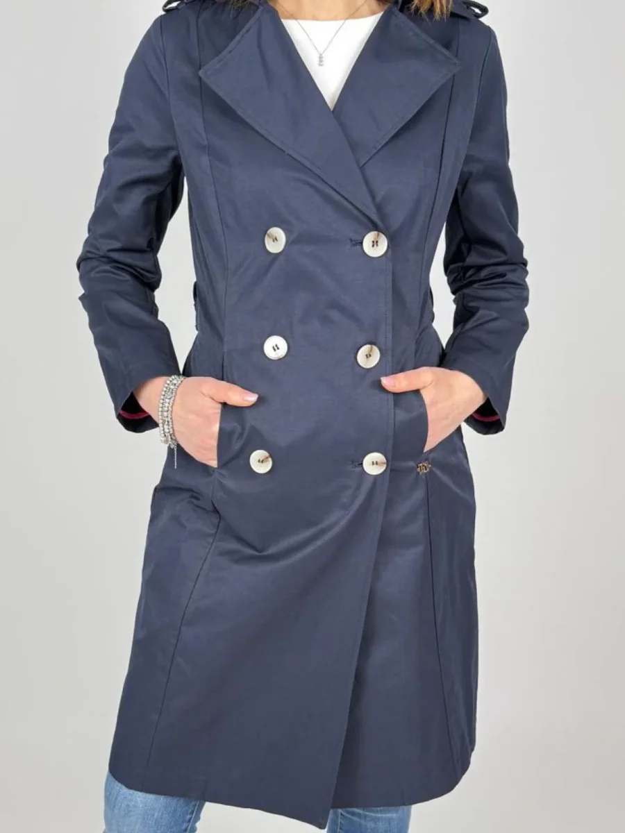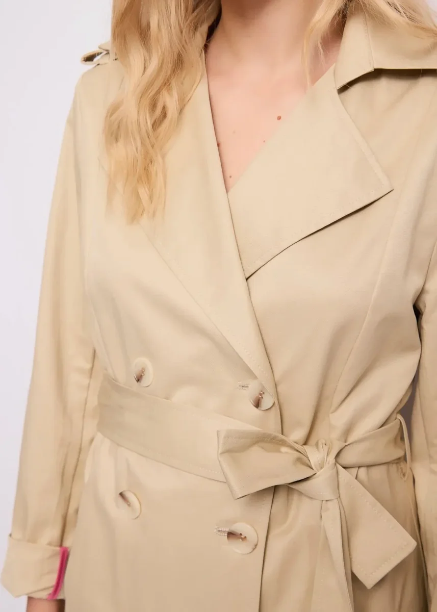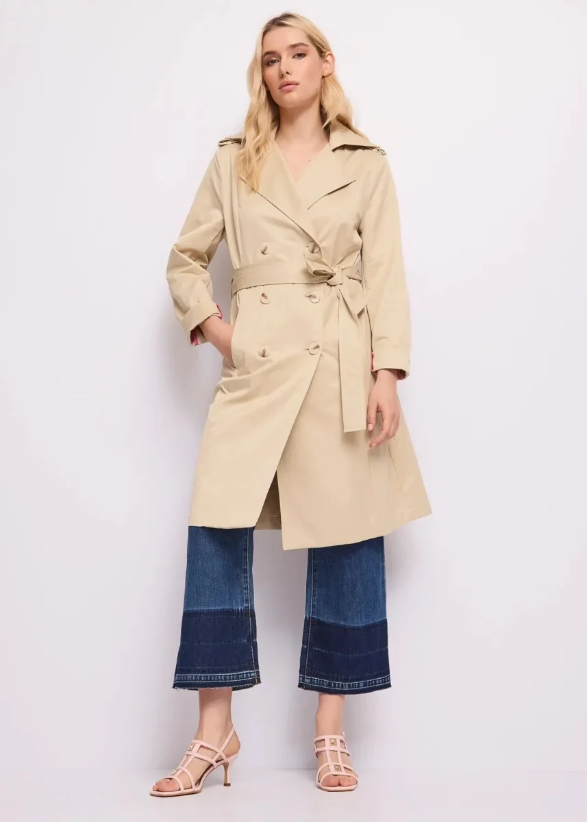 Scegli il trench doppiopetto antigoccia con collo a revers, tasche e cintura coordinata. Un must-have intramontabile del tuo guardaroba quotidiano.