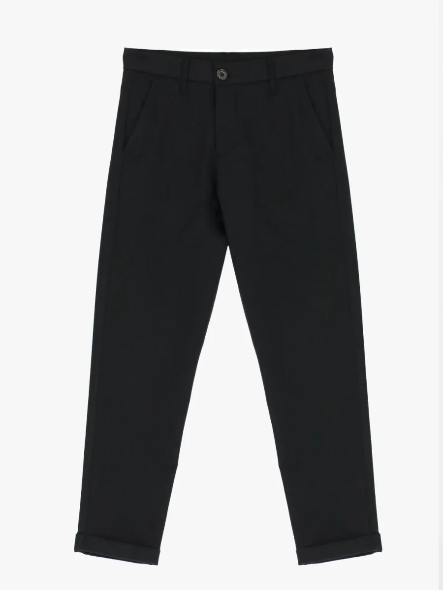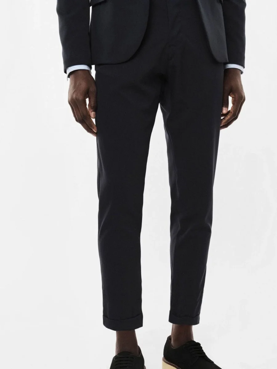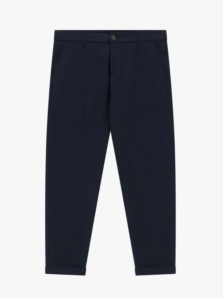 Pantalone chino-fit dal taglio lineare, caratterizzato da una silhouette affusolata e risvolto alla caviglia. Presenta chiusura con bottone e zip nascosta, passanti per cintura e tasche laterali discrete. Design versatile, ideale per comporre abbinamenti contemporanei e distinti in contesti urbani o formali.